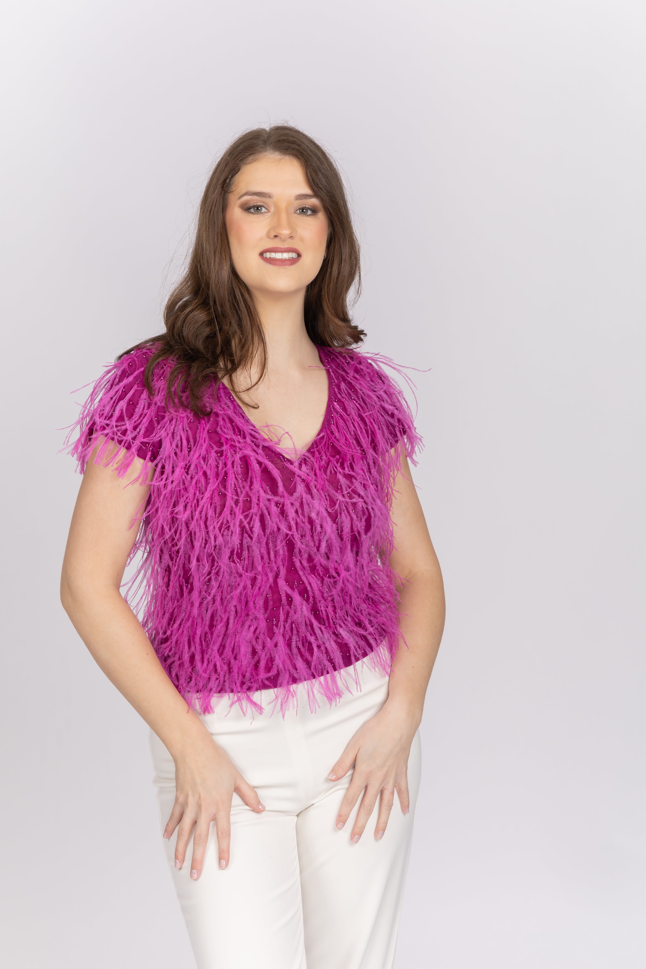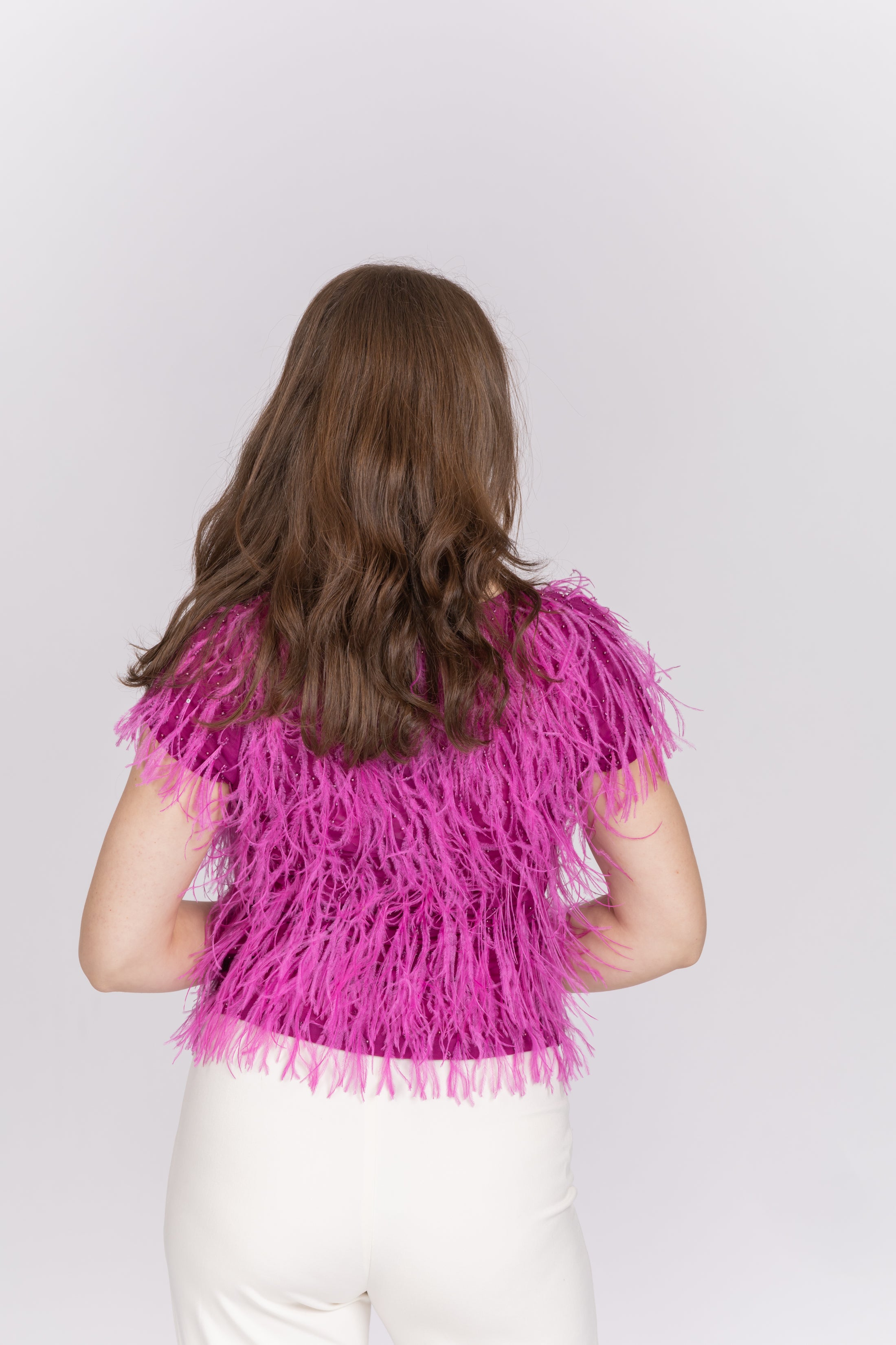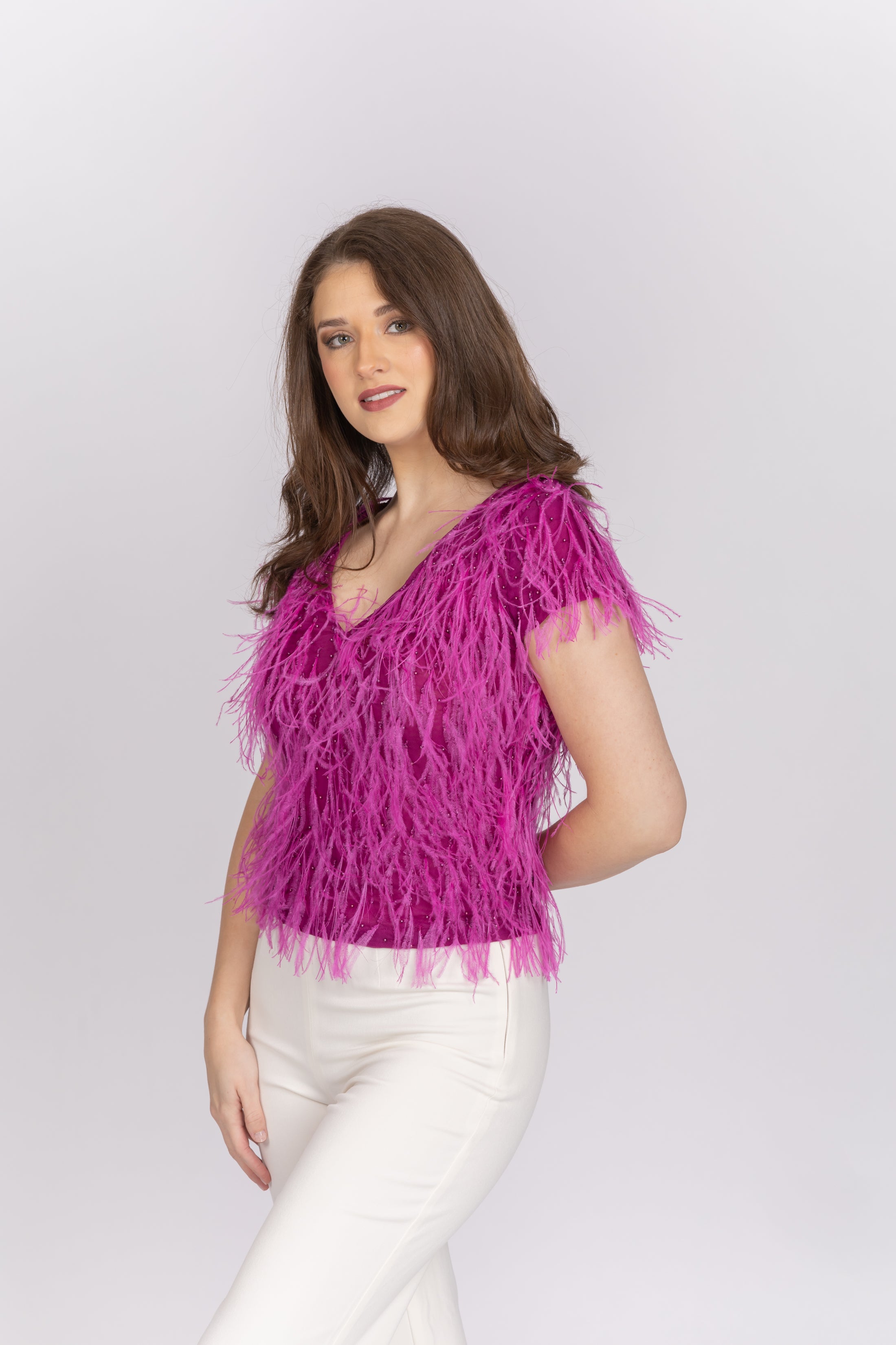 Genuine maribou feathers dangle from delicate beads all over this svelte top. Â Short sleeve. Elegant and SO MUCH FUN, you can wear her with your favorite jeans, or our taffeta party skirt or our ball skirt or try our stretch crepe bottoms. Â She makes silver screen magic no matter how you wear her.Â