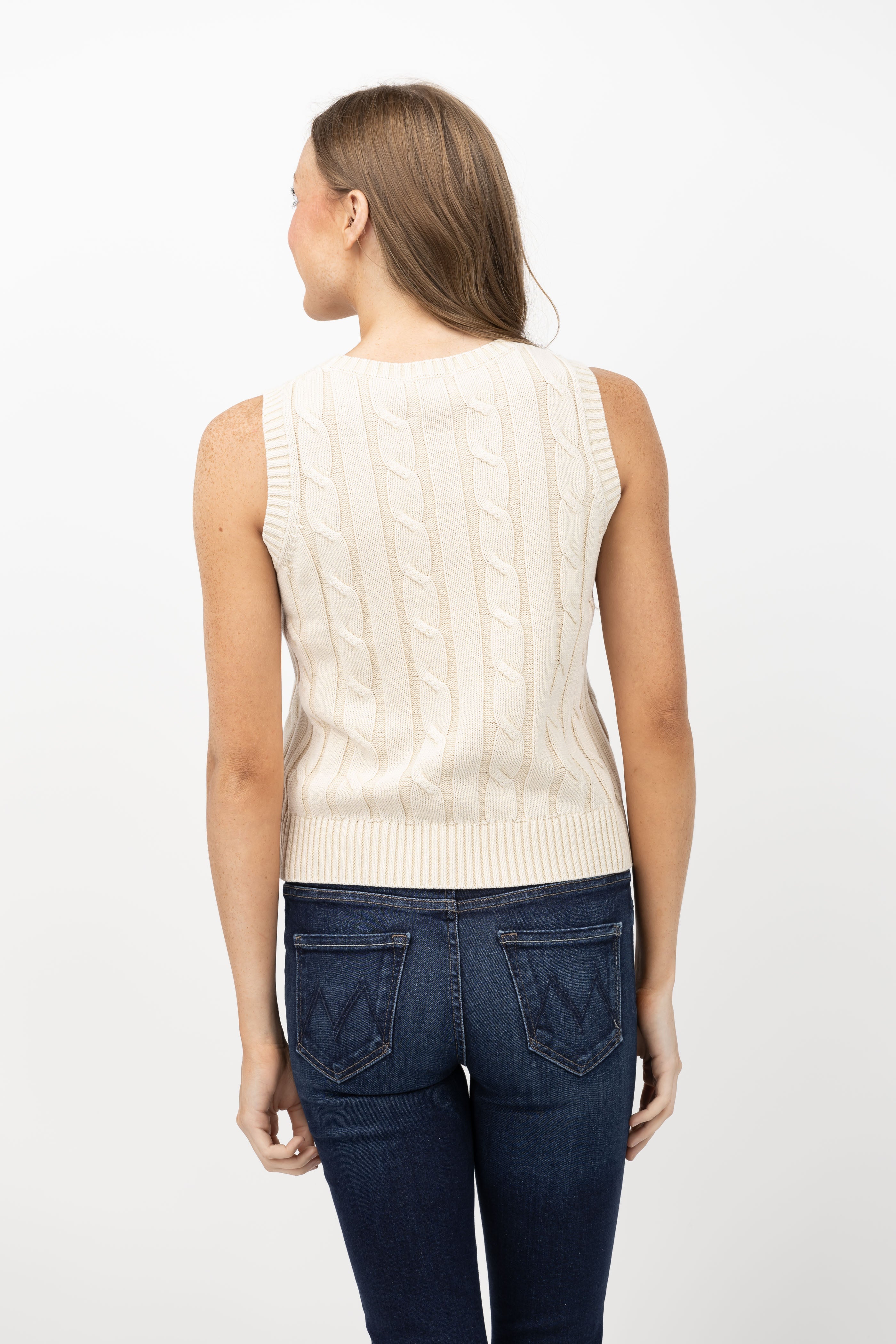 Elevate your style game with the J. Society Sleeveless Sweater in Oat. This versatile piece boasts a classic cable knit design and a comfortable crewneck, perfect for pairing with denim or skirts. Add a touch of sophistication to any outfit with this must-have sweater.