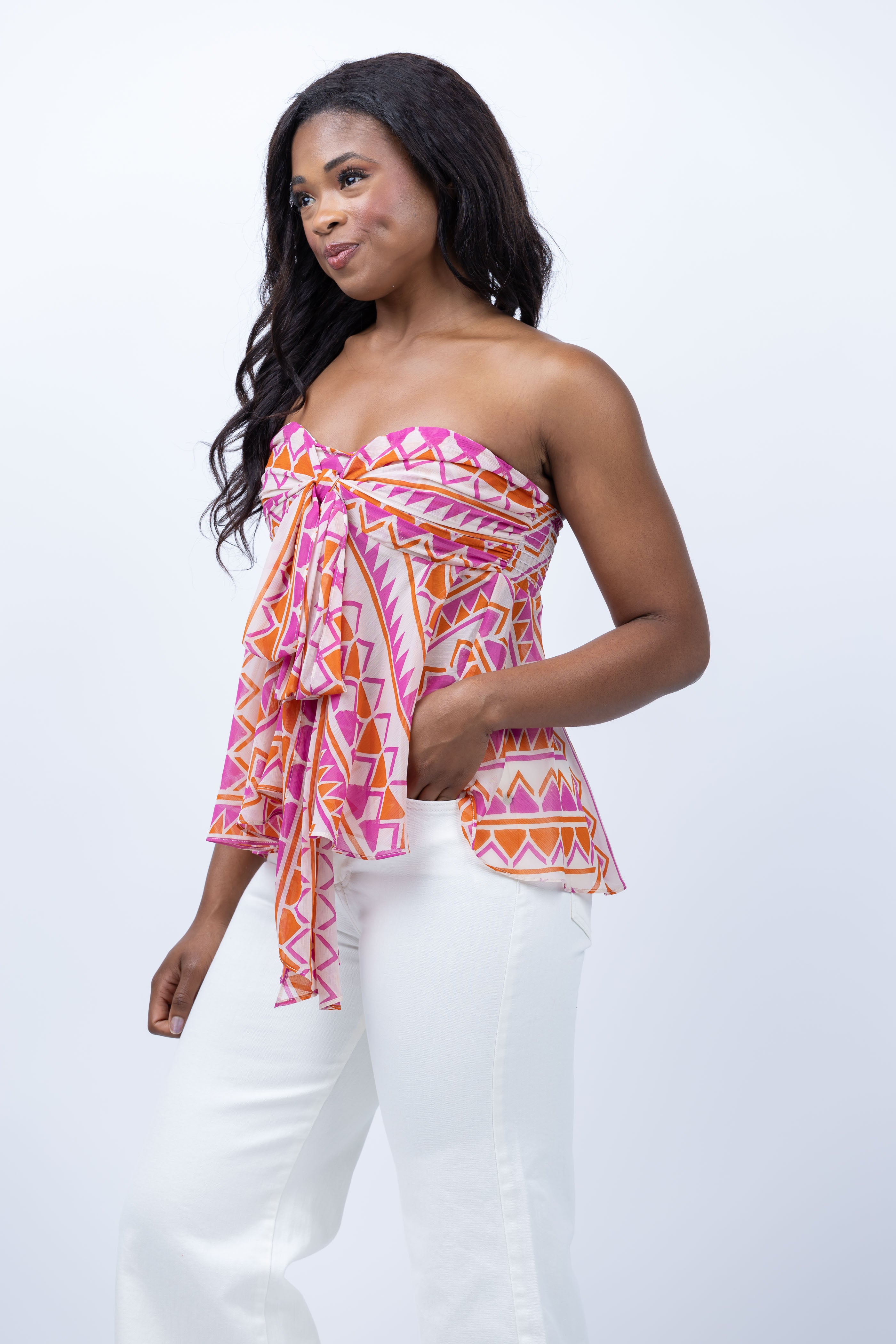 Introducing the Misa Aylin Top in Aperol! This chic, versatile top is designed with a smocked back and can be worn as a flattering strapless piece or a halter top. Made with our gorgeous Aperol Geo chiffon, it's perfect for both beach and bar. Pair with our Pia pant for an effortless and stylish look!