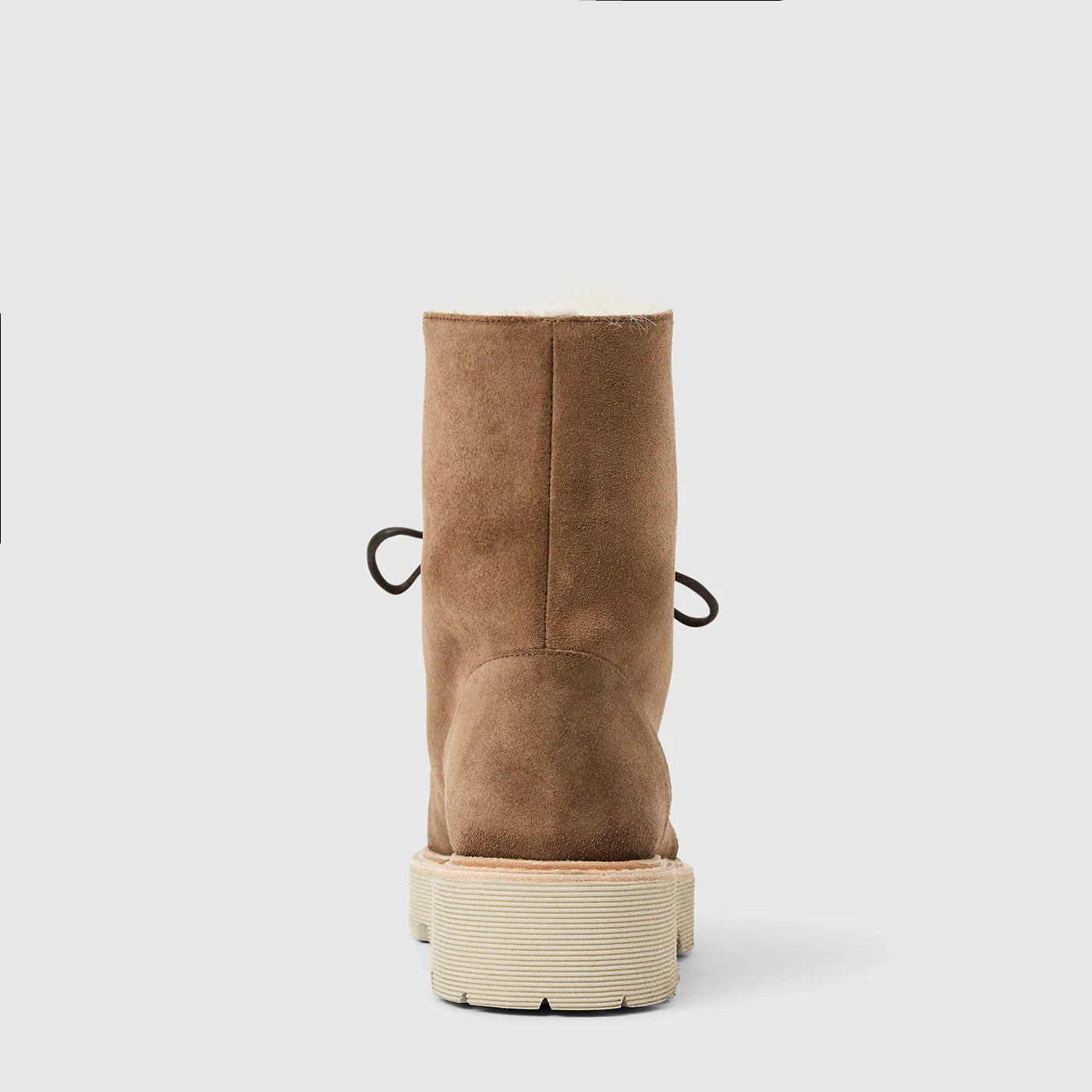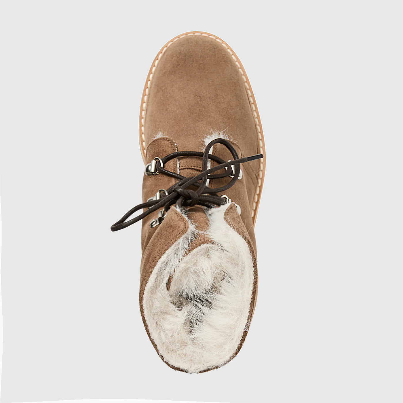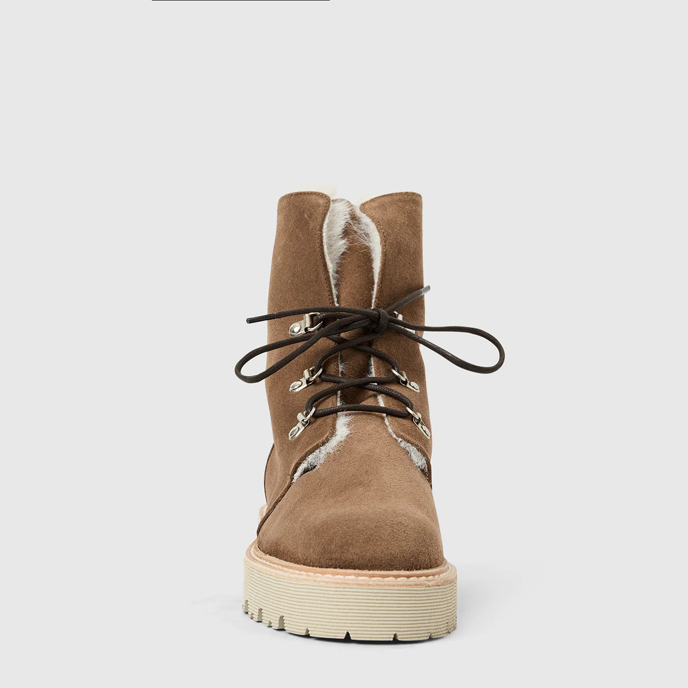 A customizable cuff makes the Eva a truly remarkable bootie - wear yours up or rolled over depending on your pant length. Modeled after hiker styles, they’re crafted from water-resistant suede that’s designed to withstand the elements and is fully lined in faux shearling for added warmth. A lug sole provides superior traction while the lace closure allows you to adjust the fit.