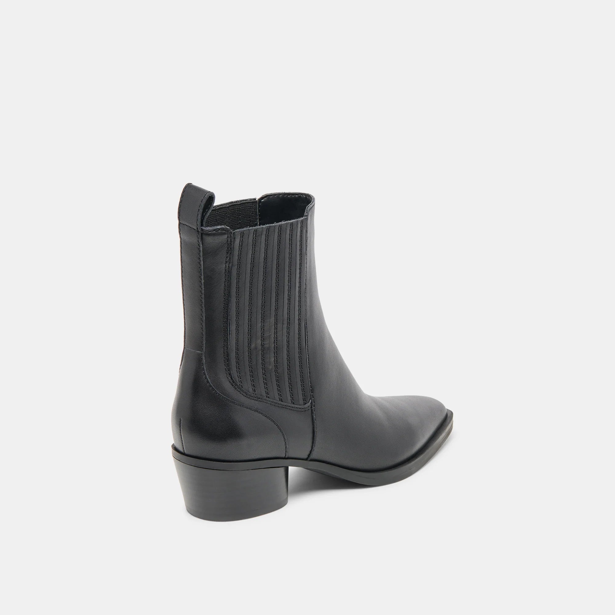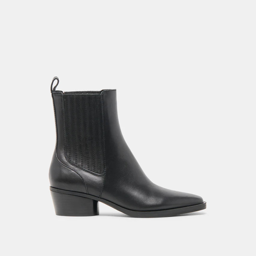 Crafted for style and resilience, the Dolce Vita Faint H2O Booties in Black Leather combine subtle western flair with waterproof performance. Made from sustainable materials including a leather upper and water-based alternatives, these booties keep your feet dry without compromising comfort. The durable rubber outsole ensures reliable traction in any weather, while the timeless black leather adds versatile sophistication to your wardrobe. Step confidently knowing these booties blend eco-conscious design with enduring style.