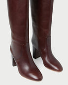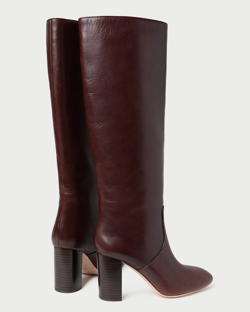 Step into sophistication with the Loeffler Randall Goldy Tall Boot in rich espresso dark brown vachetta leather. This tall shaft boot features a striking 3.5-inch high heel and an elegant almond toe, offering a flattering, polished look. Designed with a padded footbed for all-day comfort and a convenient pull-on style, it perfectly blends luxury and ease. The subtle gold stamped logo adds a refined detail that completes this timeless wardrobe essential.