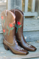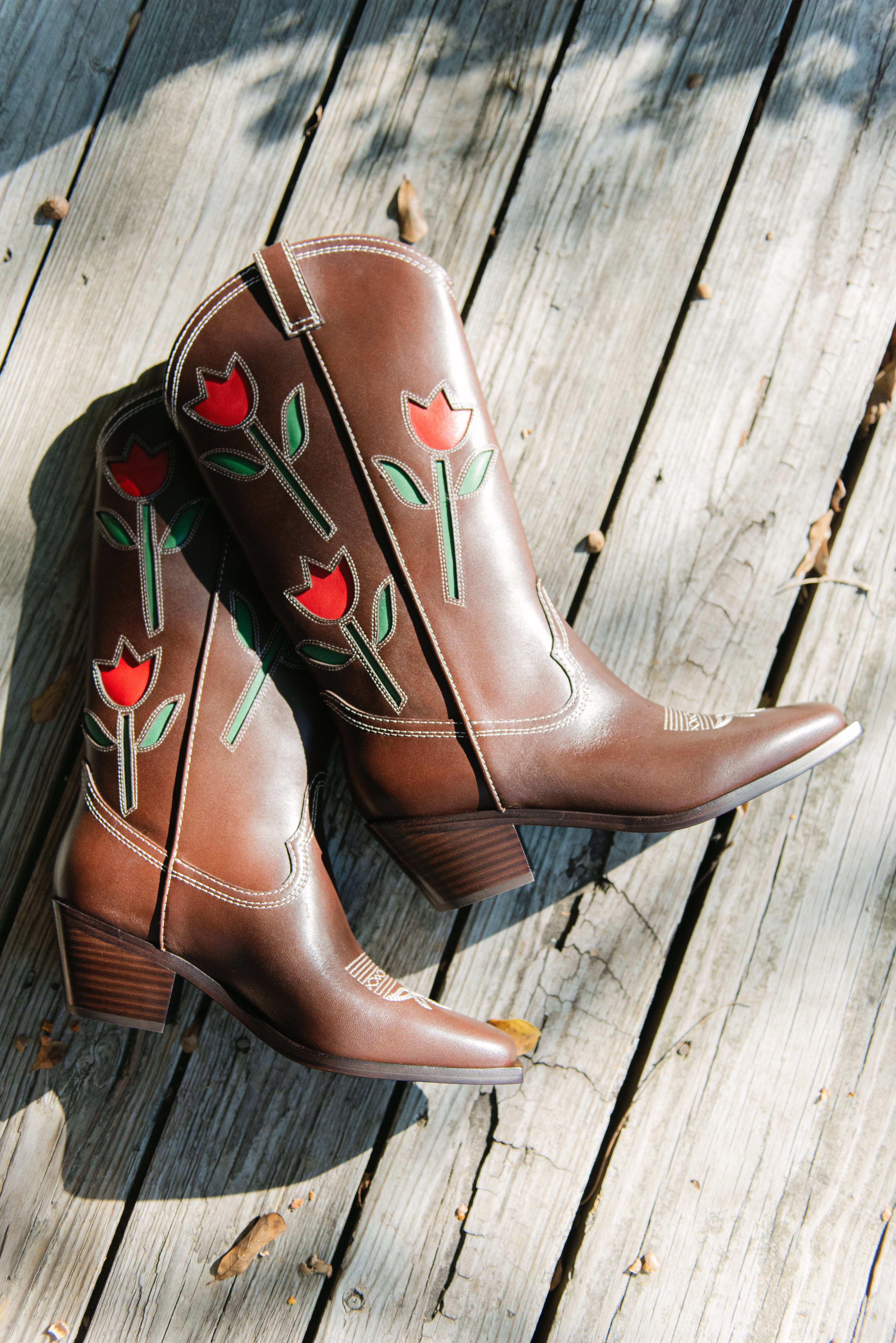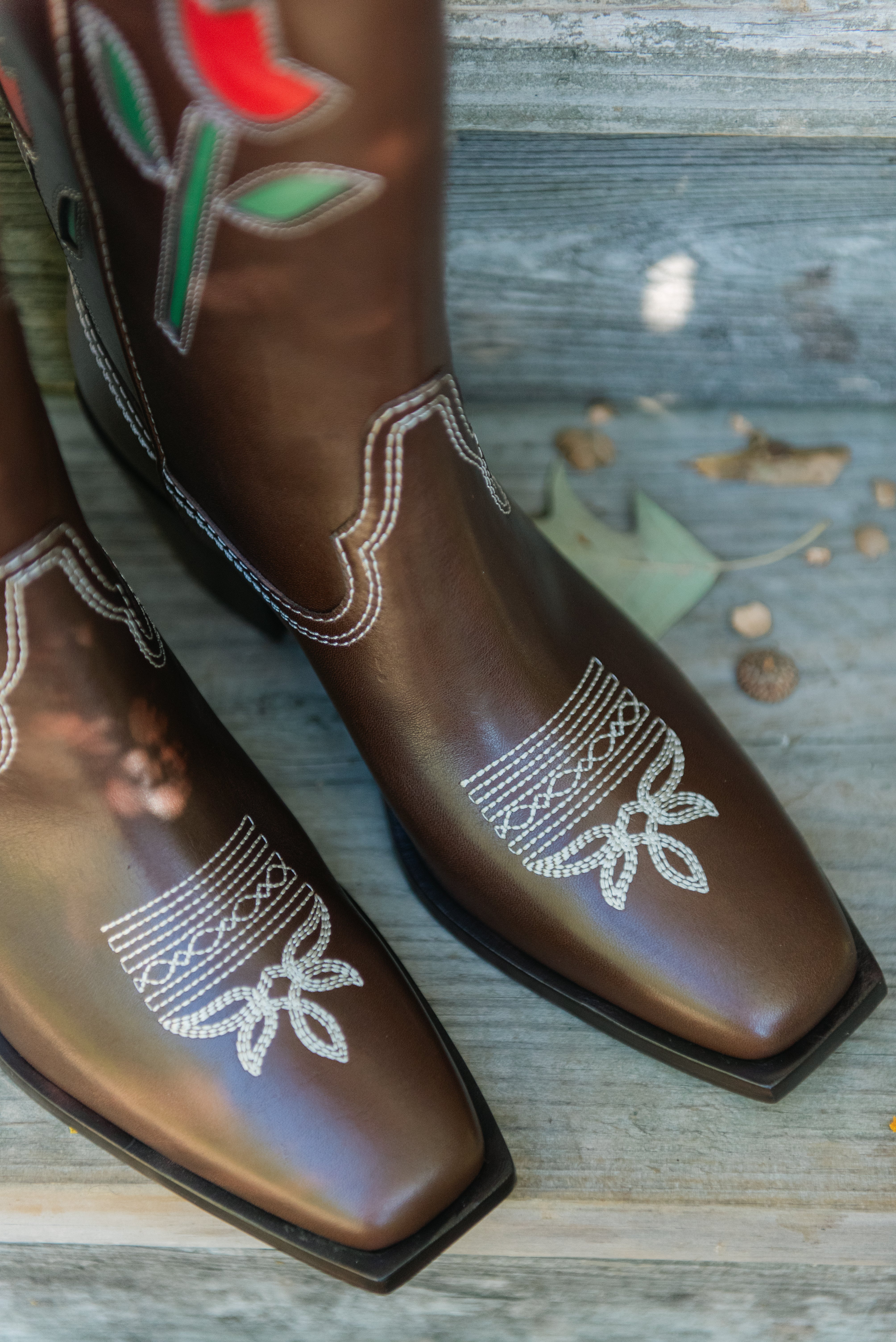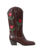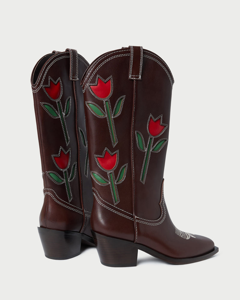 Step out in style with the Loeffler Randall Wilder Tulip Cowboy Boot in Espresso. Crafted from rich espresso vachetta leather, these tall boots feature striking red and green tulip inlays that capture a bold western spirit. The padded leather footbed with a gold-stamped logo ensures comfort all day long, while the 2.5-inch heel adds just the right amount of lift. Easy to pull on and perfectly designed for both fashion and function, these boots bring timeless flair to any outfit.
