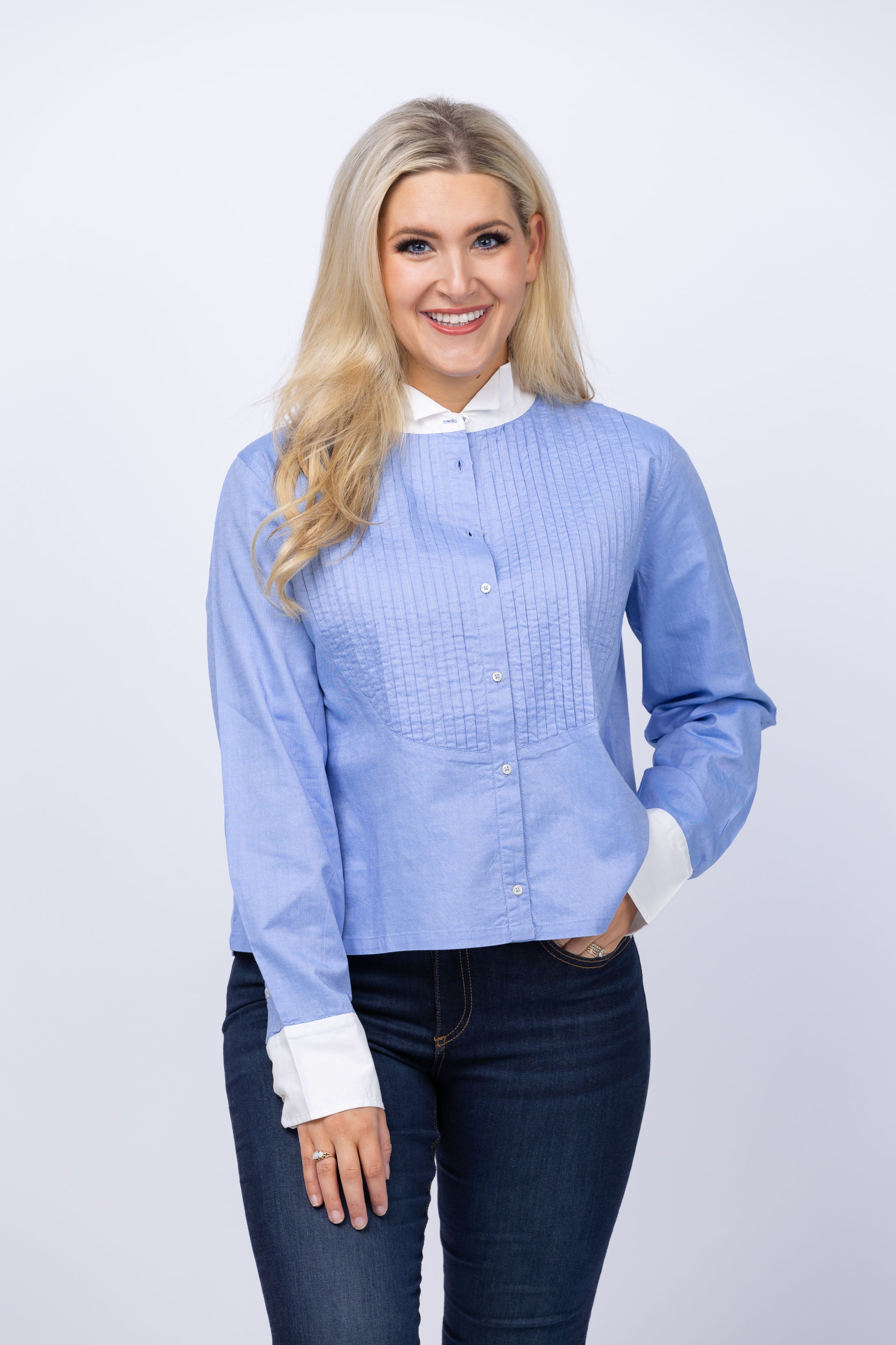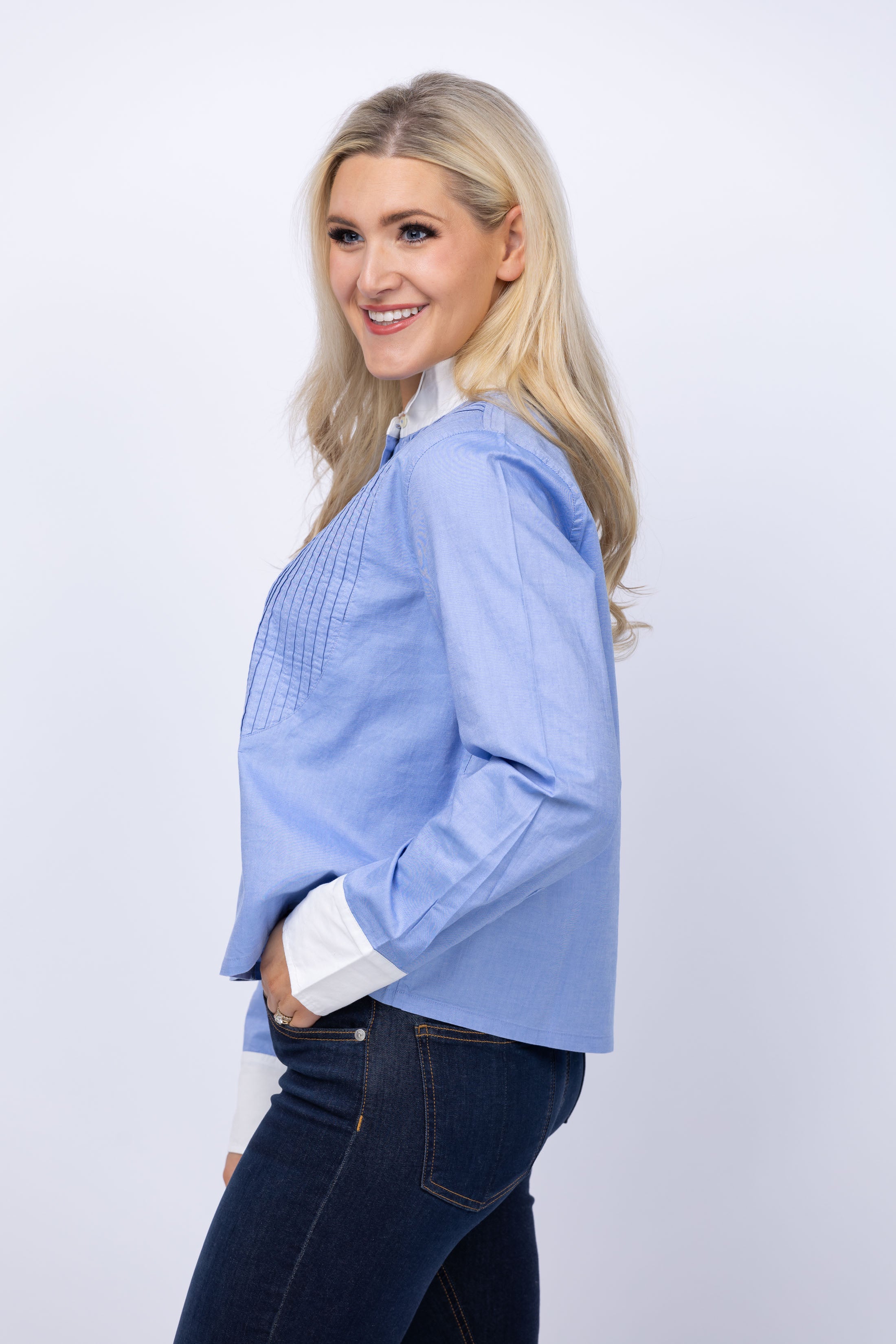 The Great. The Pleated Tux Top in Blue Oxford with White Poplin Trim