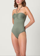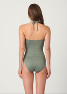 Dive into timeless style with the Shoshanna Cinched one-piece. This sophisticated swimsuit reimagines the classic silhouette in an exclusive palm wave texture that adds visual interest and dimension. The flattering shirred center front creates a sculpted look, while adjustable neck ties finished with sage and gold beads offer both style and customizable fit. Hidden interior underwire provides essential support and confidence, and full lining ensures comfort and coverage. Whether poolside or beachside, this elegant one-piece delivers refined sophistication with thoughtful details—a wardrobe essential that transcends seasons.