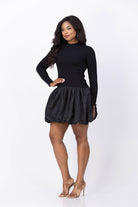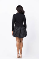 The Shoshanna Keely Dress in Jet offers a striking blend of textures and styles. Its high neckline features a delicate ruffle detail, complemented by a long-sleeve ribbed jersey knit bodice for a sleek, comfortable fit. The eye-catching full-volume, high-low bubble hem mini skirt in taffeta adds dynamic movement and modern flair. Unlined and easy to slip on, this dress is perfect for making a bold, elegant statement with ease.