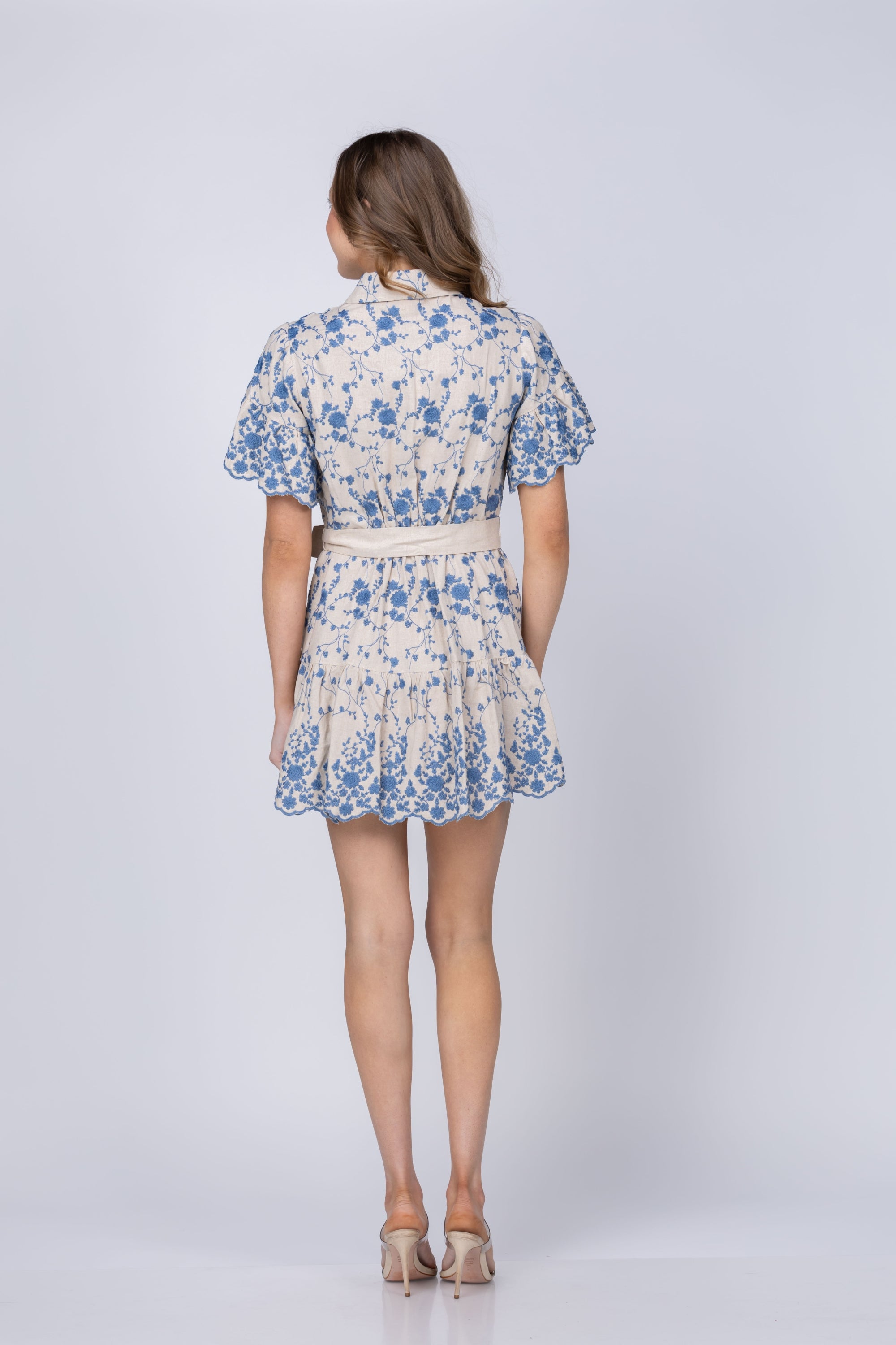 Elevate your wardrobe with this stunning shirtdress, crafted from luxurious embroidered linen that combines timeless elegance with modern appeal. The front button closure offers effortless styling, while the adjustable waist tie creates a flattering silhouette that works for any body type. Delicate ruffle details at the sleeves and hem, finished with the fabric's signature scalloped edge, add a touch of refined femininity. Unlined for breathable comfort, this versatile piece transitions seamlessly from casual days to special occasions, making it an essential investment for your everyday collection.