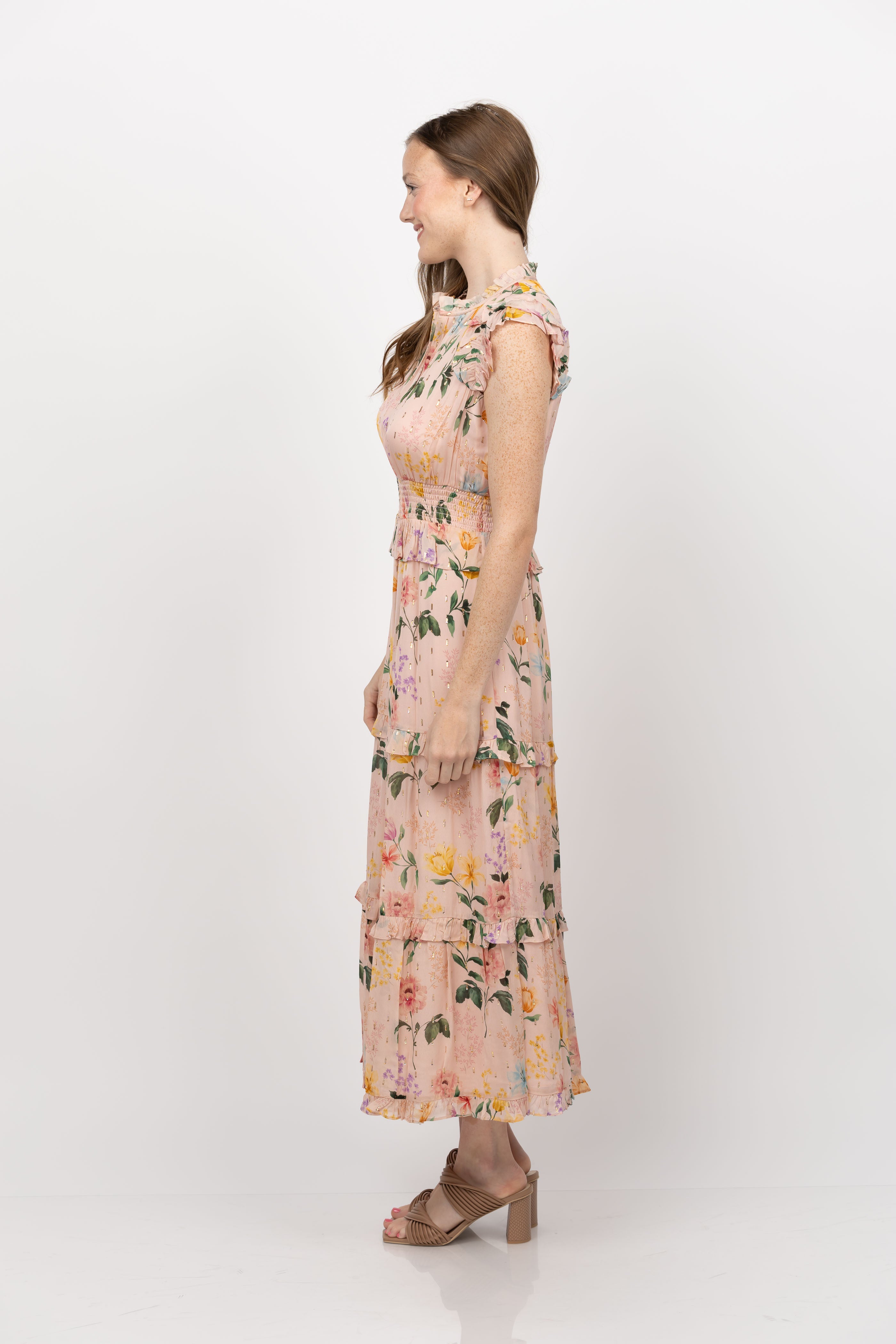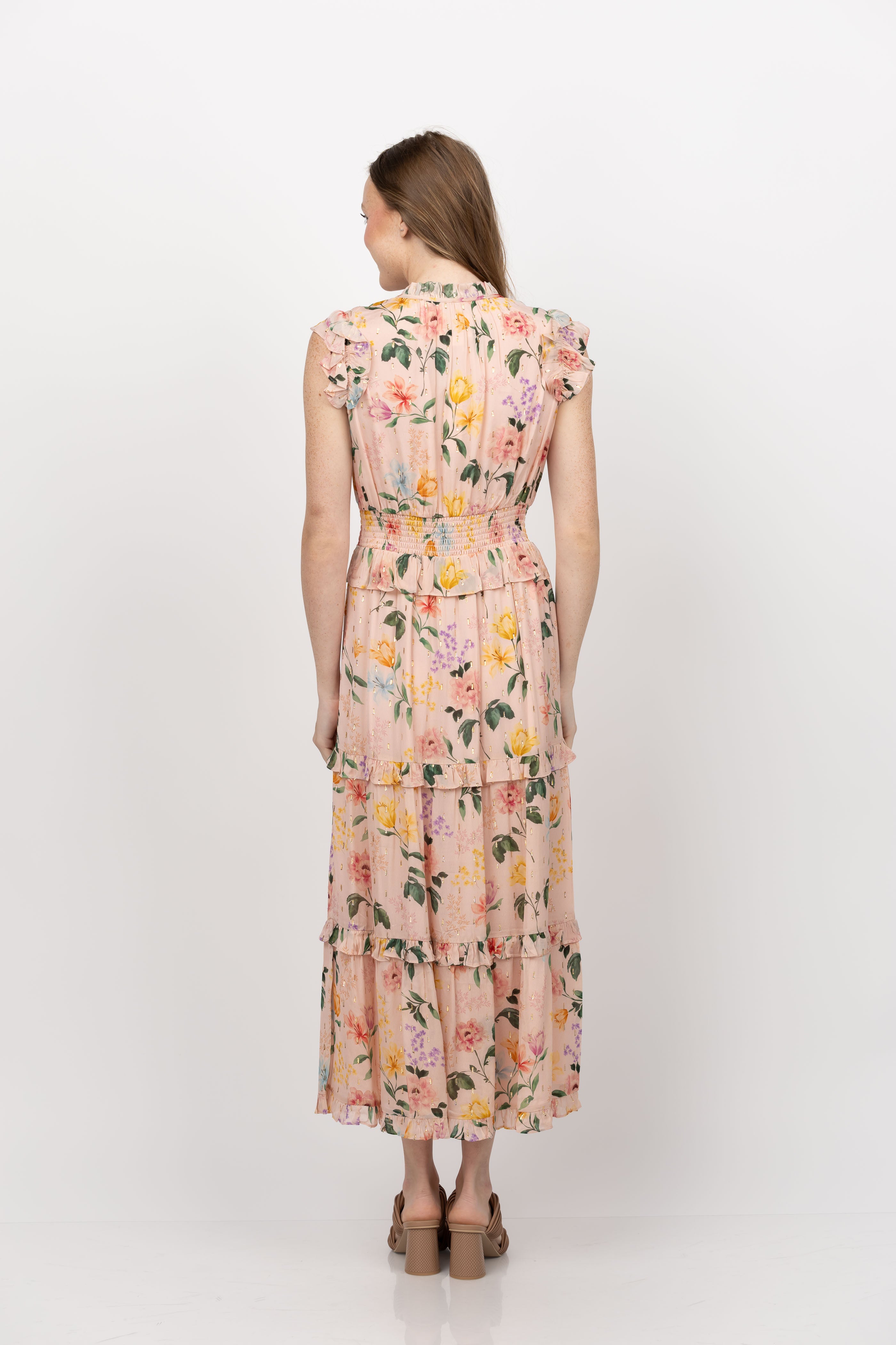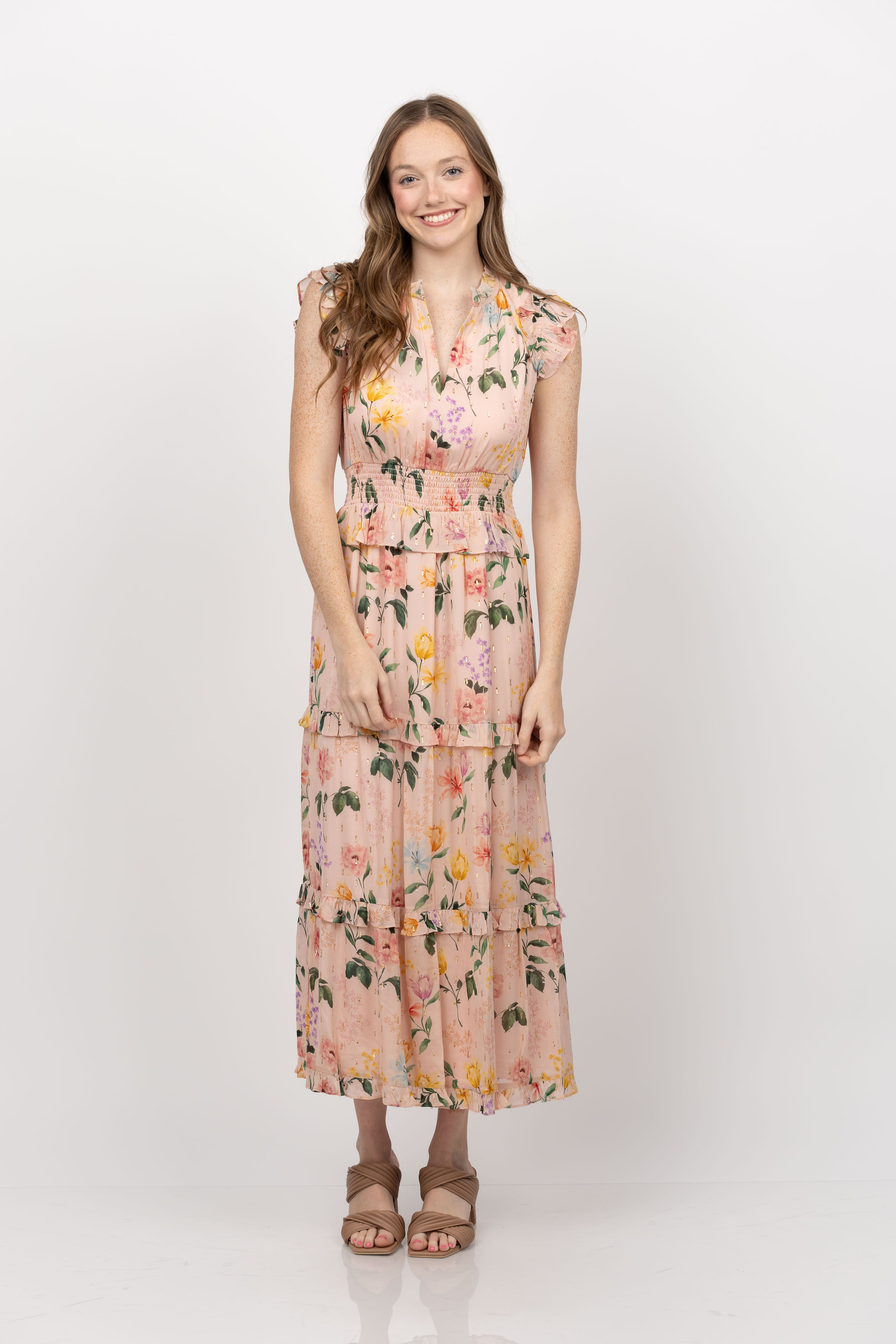 Sparkle and stand out in our Shoshanna Maren Dress! The metallic floral pattern adds a touch of elegance, while the tiered skirt and ruffle trim create a playful and flirty look. The flutter sleeves and smocked elastic waist provide a comfortable and flattering fit. Perfect for any special occasion!