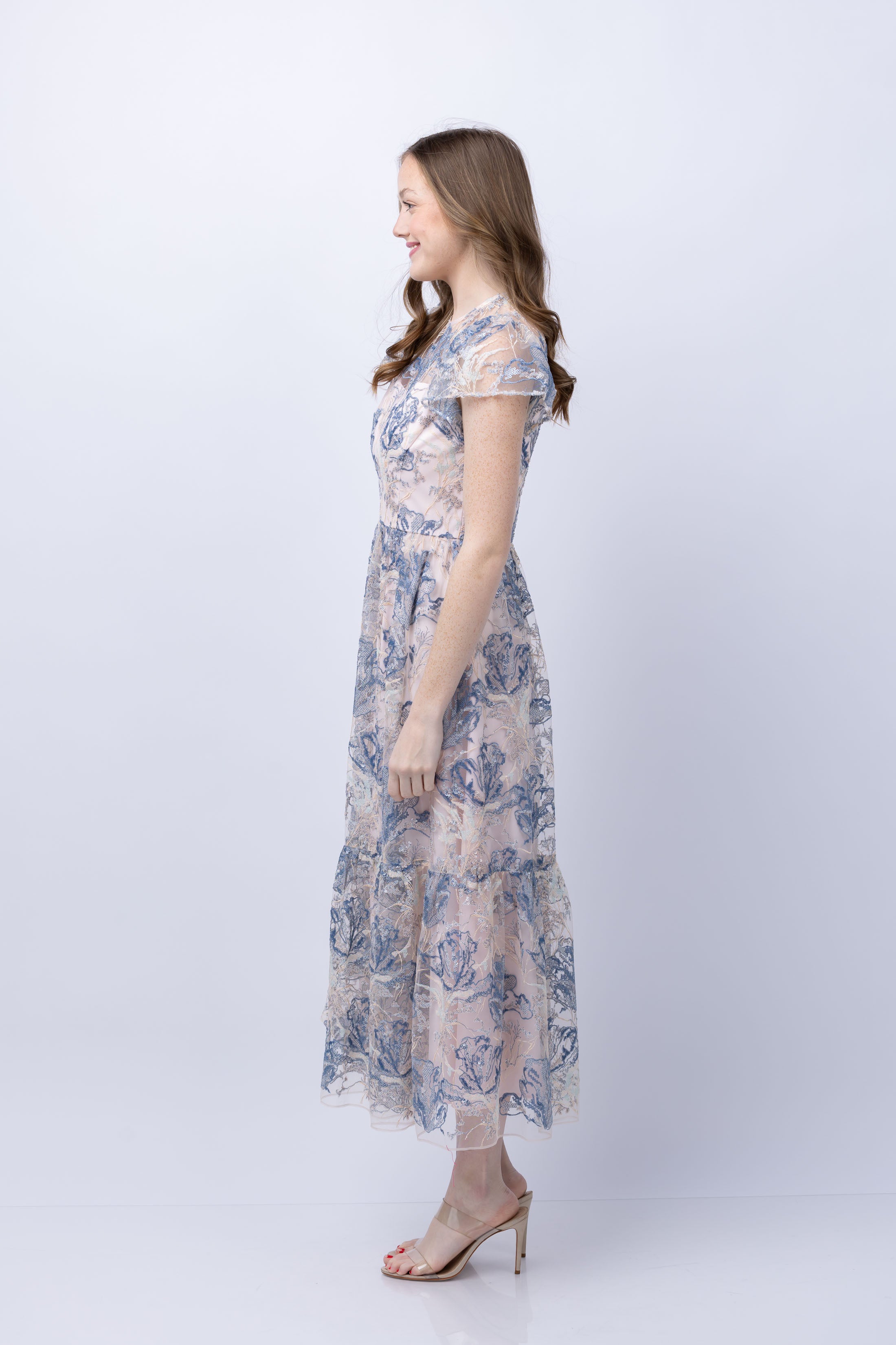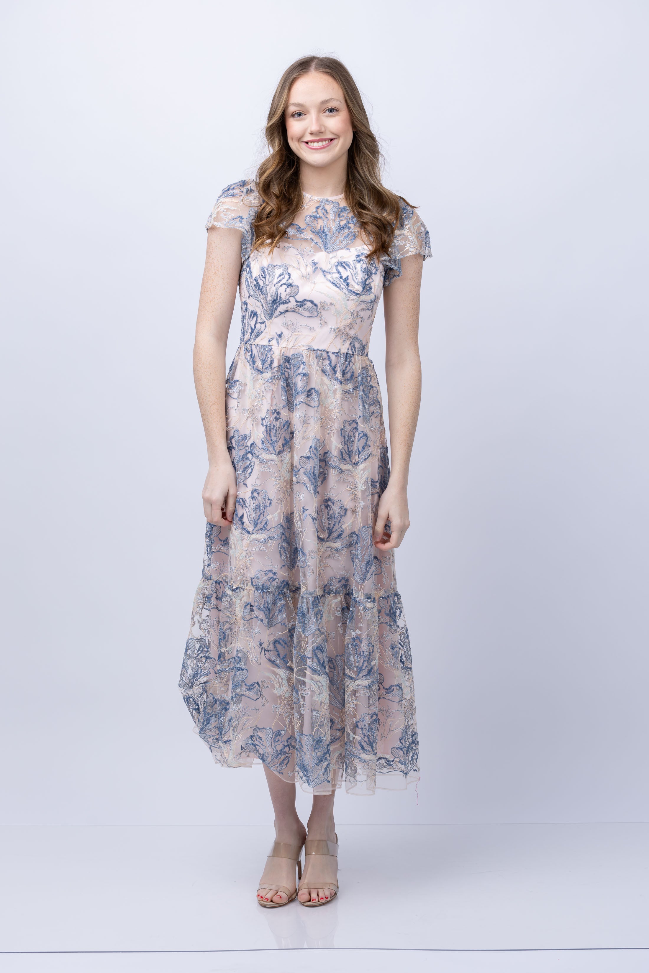 Shoshanna Midnight Josephina Dress in Beige/ Light Blue