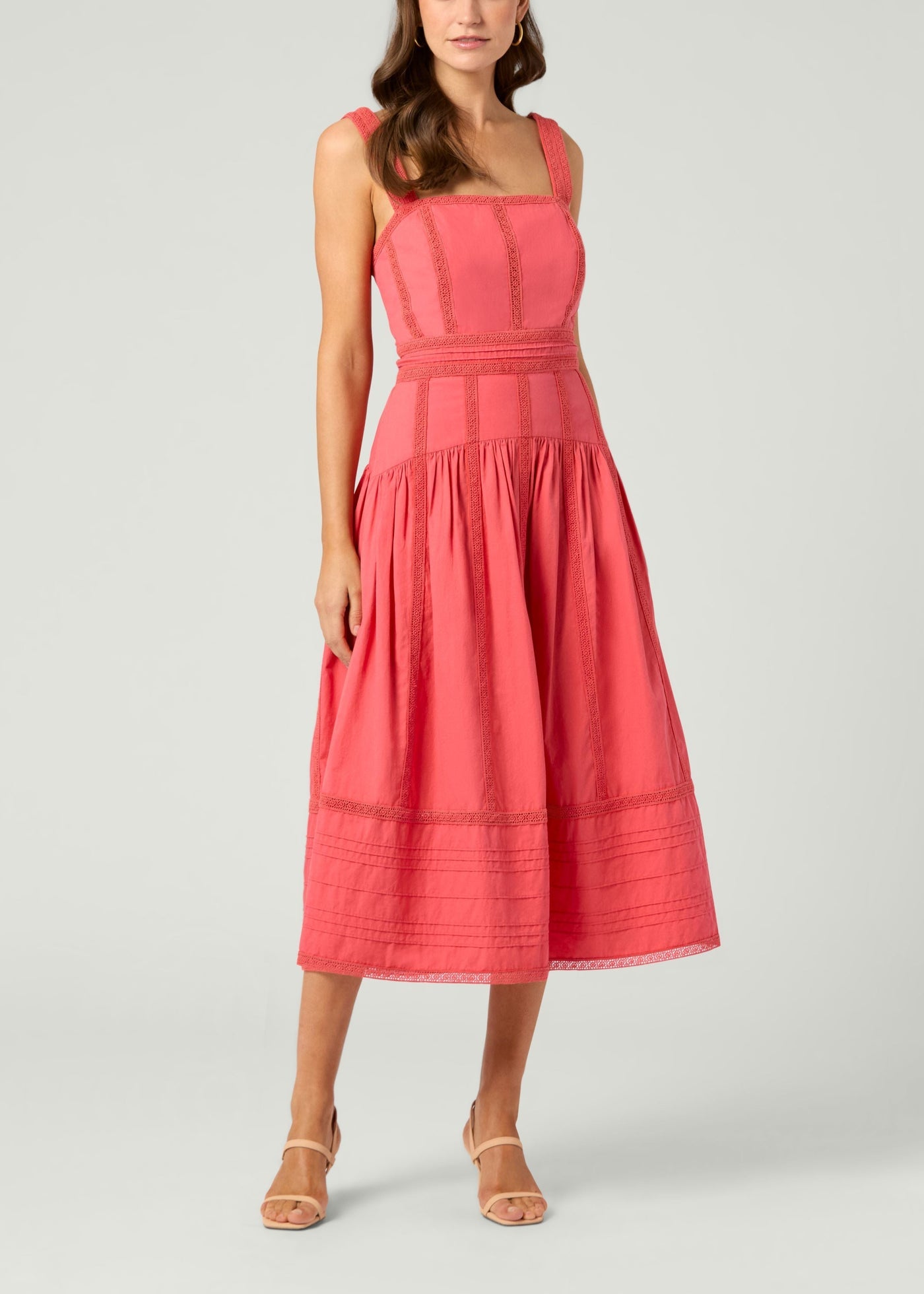Elevate your wardrobe with the Shoshanna Rosette Dress in Persimmon, crafted from breathable cotton poplin for all-day comfort. Its sleeveless design and square neckline highlight your shoulders, while the fitted bodice with elastic smocking at the back ensures a flattering fit. The A-line skirt features elegant pintuck details and side pockets, combining style with practicality. Intricate matching trim adds a refined touch along the straps, seams, and waistband. Unlined and finished with a hidden back zipper, this midi dress offers effortless sophistication for any occasion.