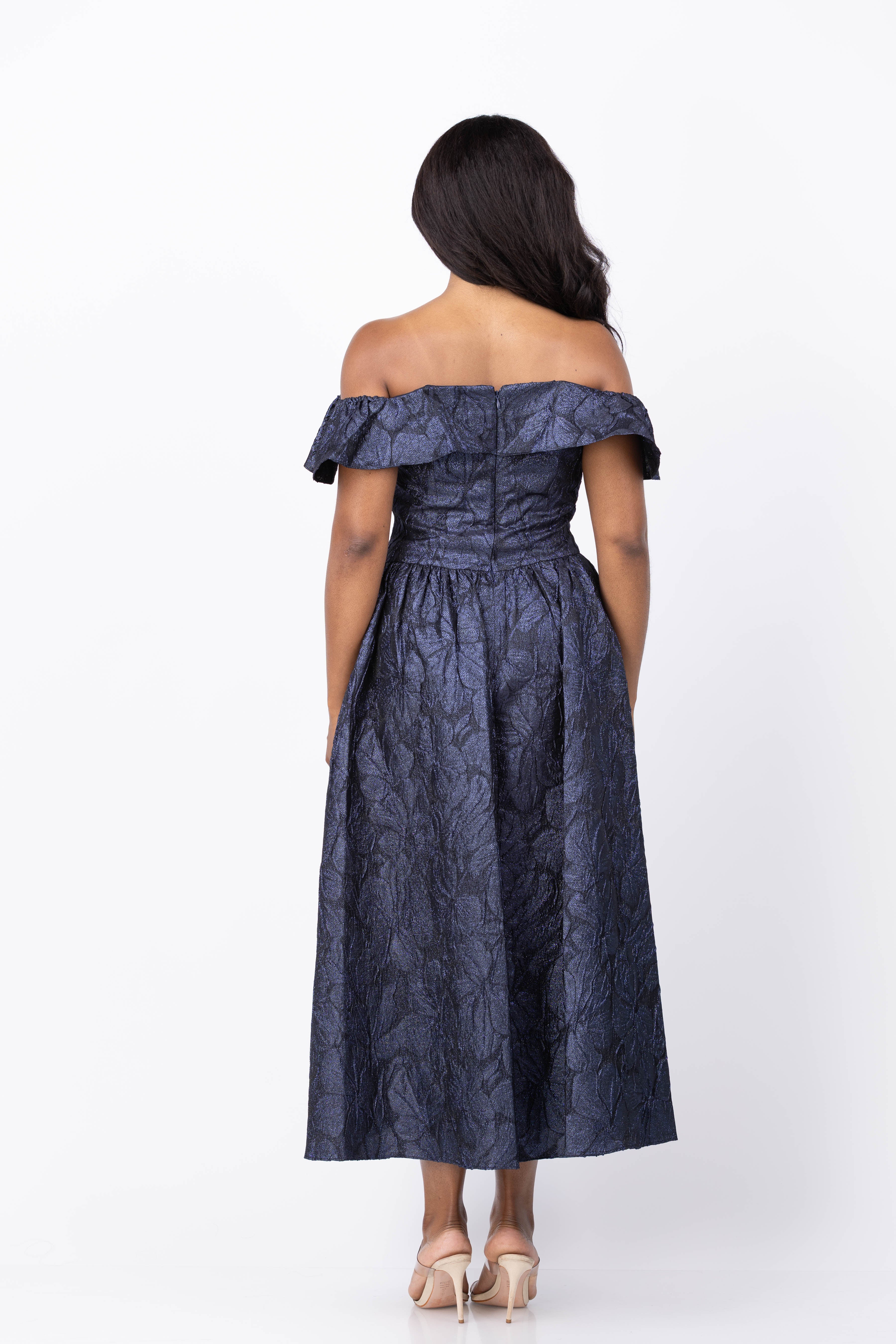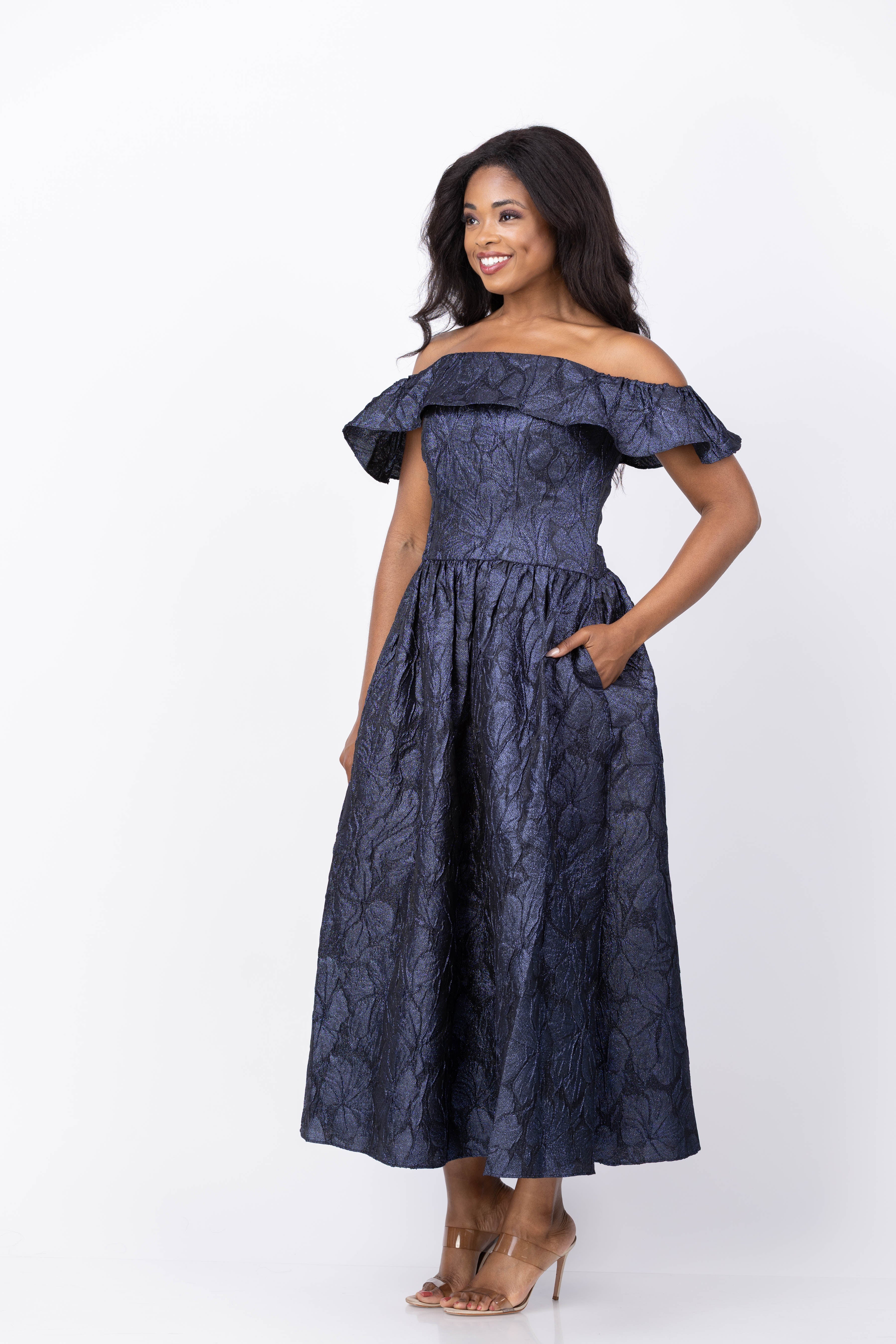 The Shoshanna Solana Dress in Navy dazzles with its beautiful lurex jacquard fabric and off-shoulder neckline accentuated by delicate ruffled sleeves. The fitted bodice features a low waistline and full bustier construction inside for flattering support. A full-volume shirring skirt creates elegant movement, while a hidden back zipper ensures a seamless fit. Perfect for cocktail events, this dress effortlessly combines glamour and sophisticated style.