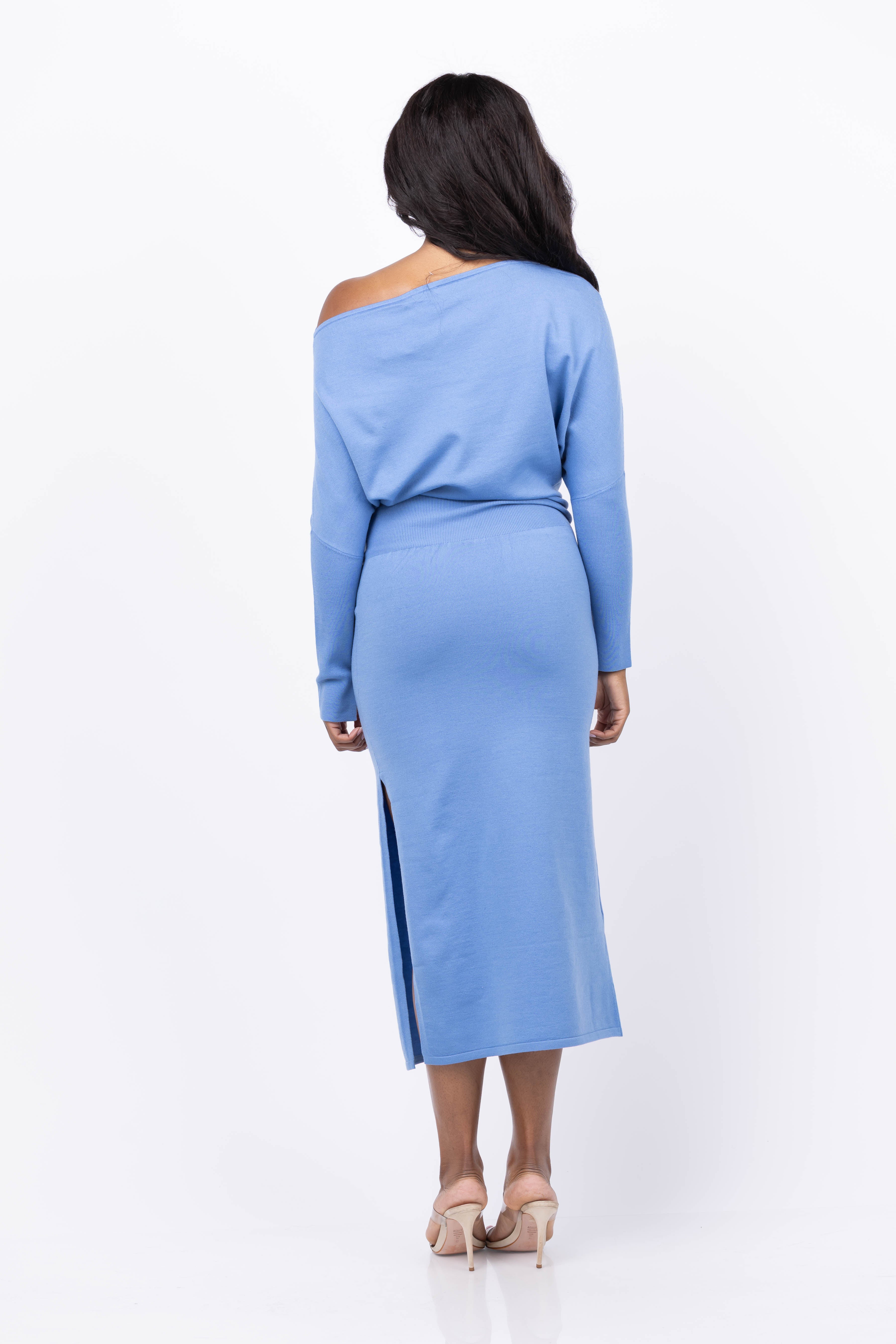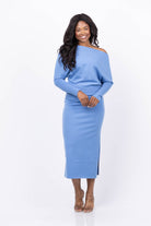 The Simkhai Janese Off Shoulder Midi Dress in Horizon blue blends featherweight wool with an elegant off-shoulder design. Its voluminous top contrasts beautifully with fitted sleeves and a banded waist, creating a flattering silhouette. The side slit adds a subtle touch of allure, making this dress perfect for sophisticated, comfortable style all day or night.