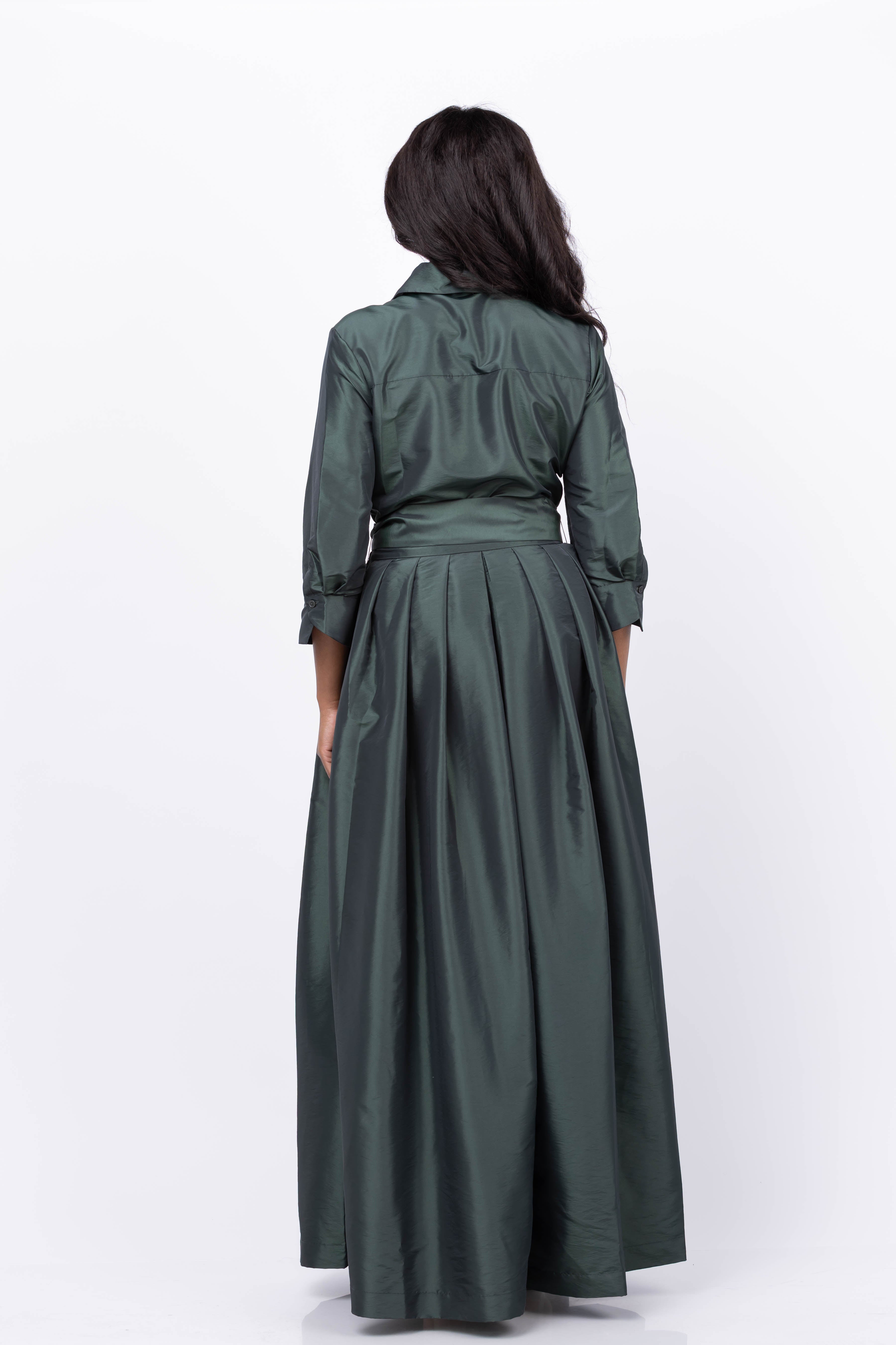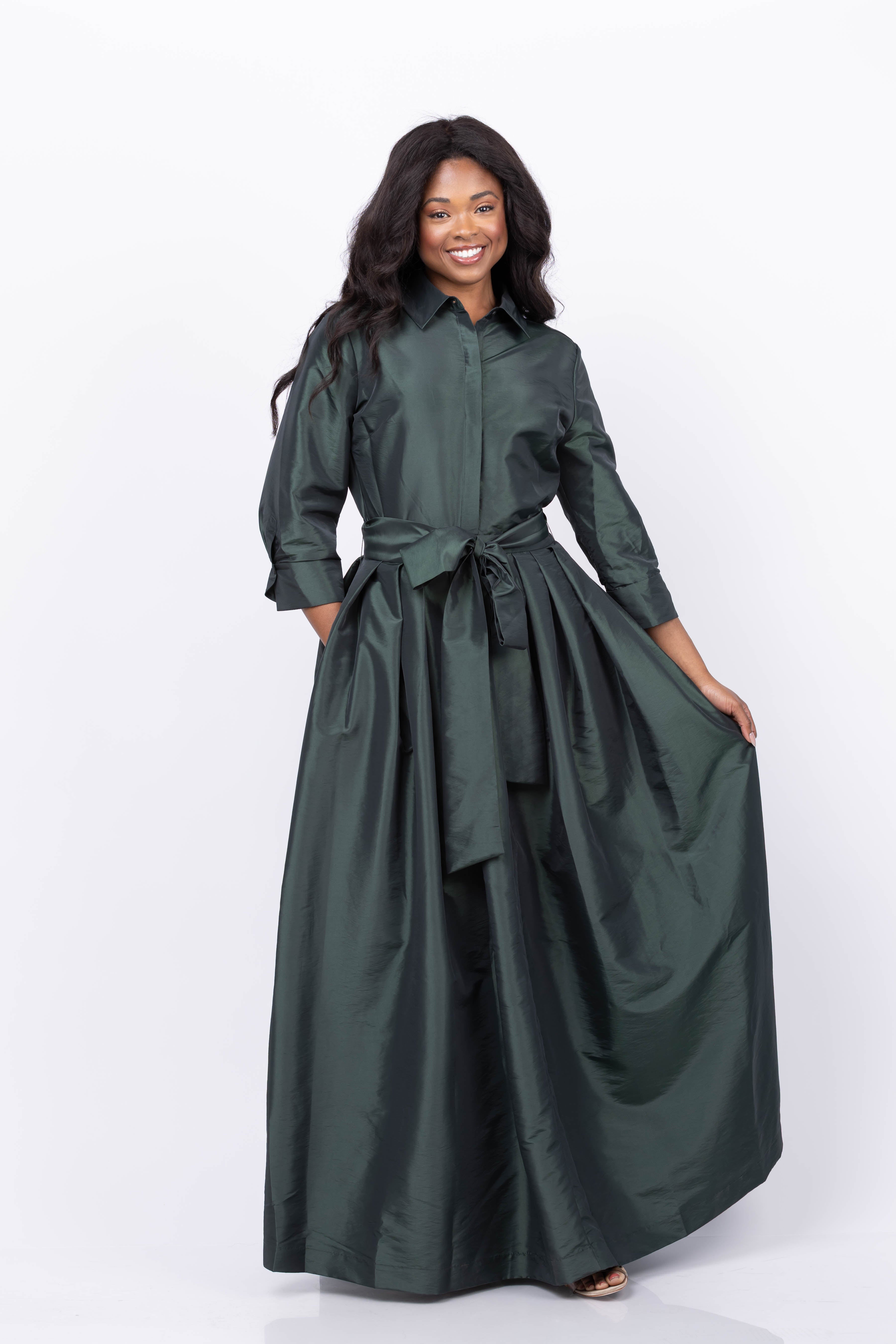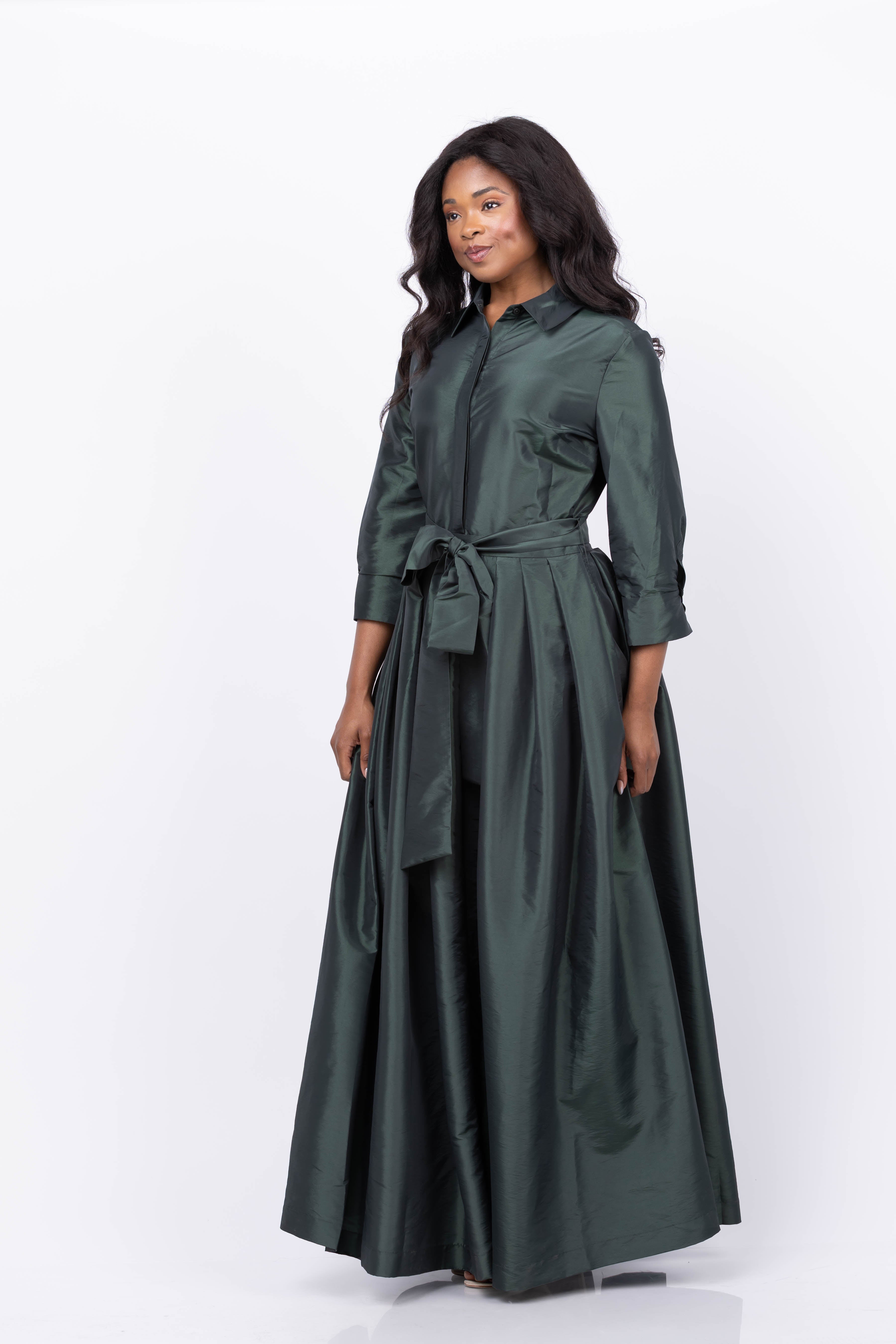 Finished in lustrous sateen, the Simkhai Julip Shirtwaist Gown in Cypress combines timeless elegance with modern comfort. Its spread collar and long sleeves with button cuffs create a polished look, while the self-tie belt defines your waist for a flattering silhouette. Practical side on-seam pockets and a button-front closure add both style and functionality, making this gown perfect for sophisticated day-to-night wear.