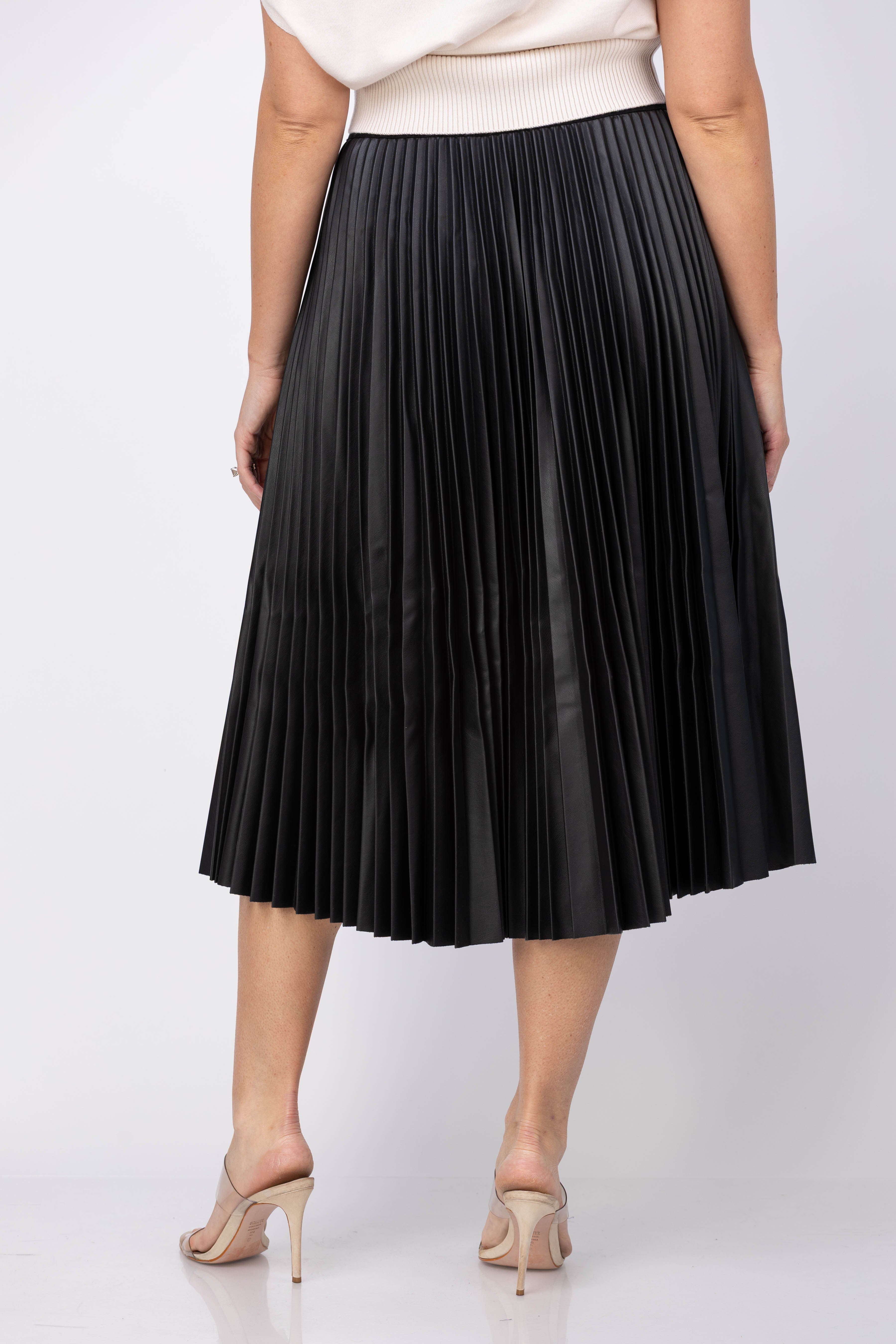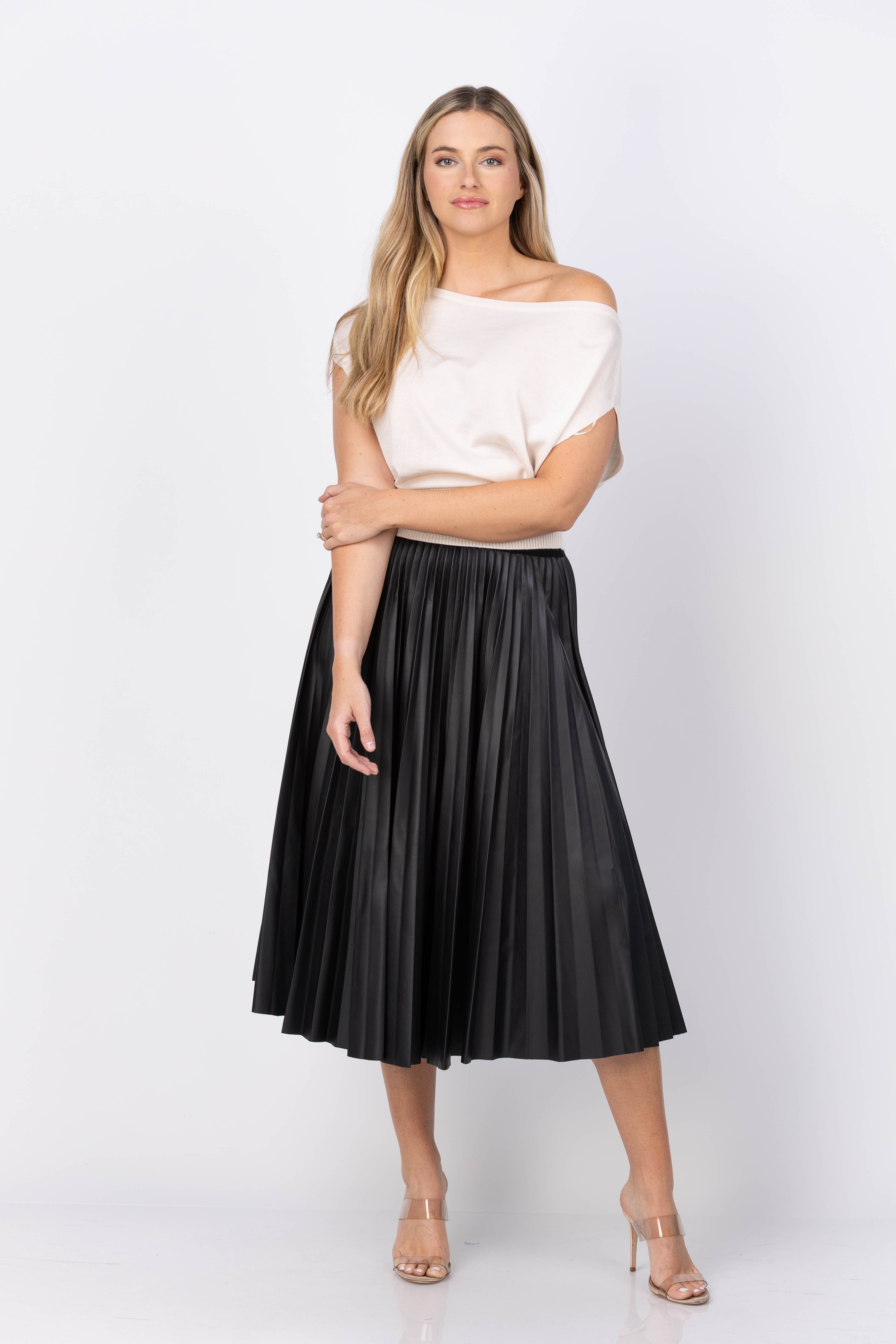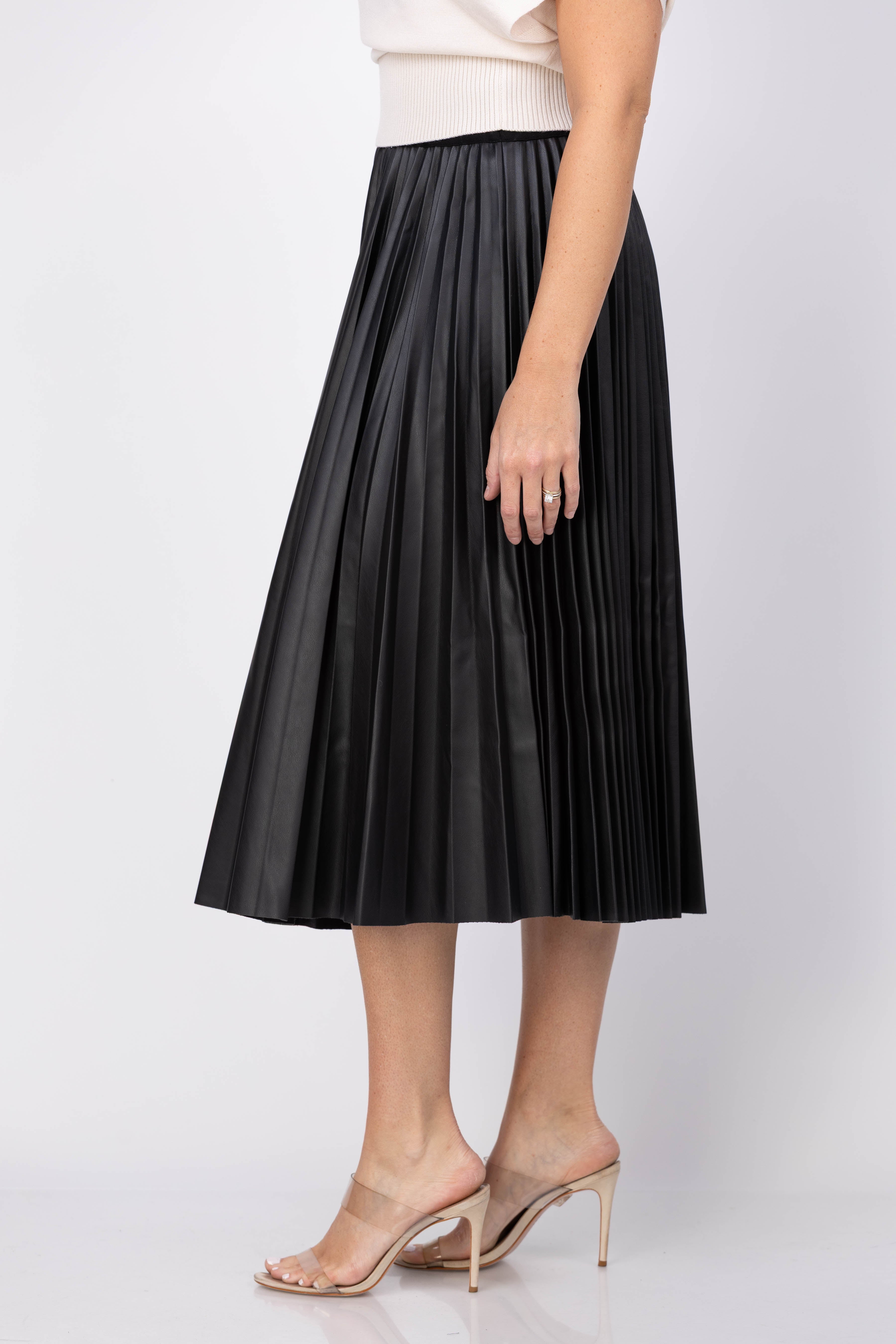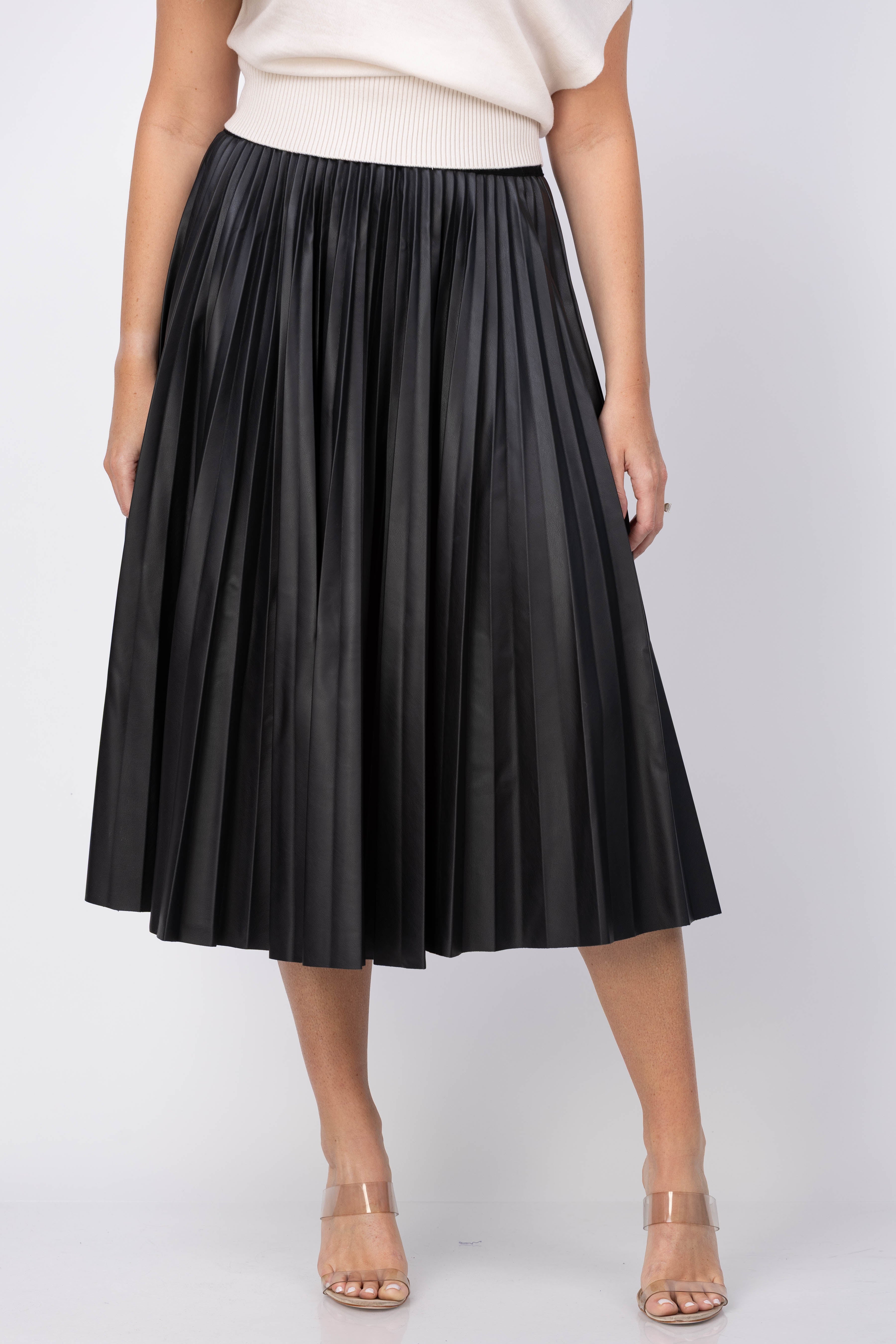 The Simkhai Kezia Midi Skirt in Black offers a bold, modern edge with its sleek vegan leather fabric. Designed with micro-pleats, this midi-length skirt combines texture and movement for a striking silhouette. Perfect for day-to-night wear, it delivers cruelty-free style without sacrificing sophistication, making it an essential addition to your wardrobe.