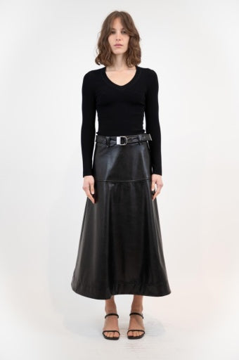 Elevate your wardrobe with the Simkhai Mayson Belted Skirt in Black. Crafted from smooth leather, this skirt features a stylish belted waist that enhances your silhouette while offering a tailored fit. Its sleek design makes it perfect for both professional settings and chic evening outings, combining comfort with modern sophistication. Add a bold, polished touch to your look with this versatile leather skirt.