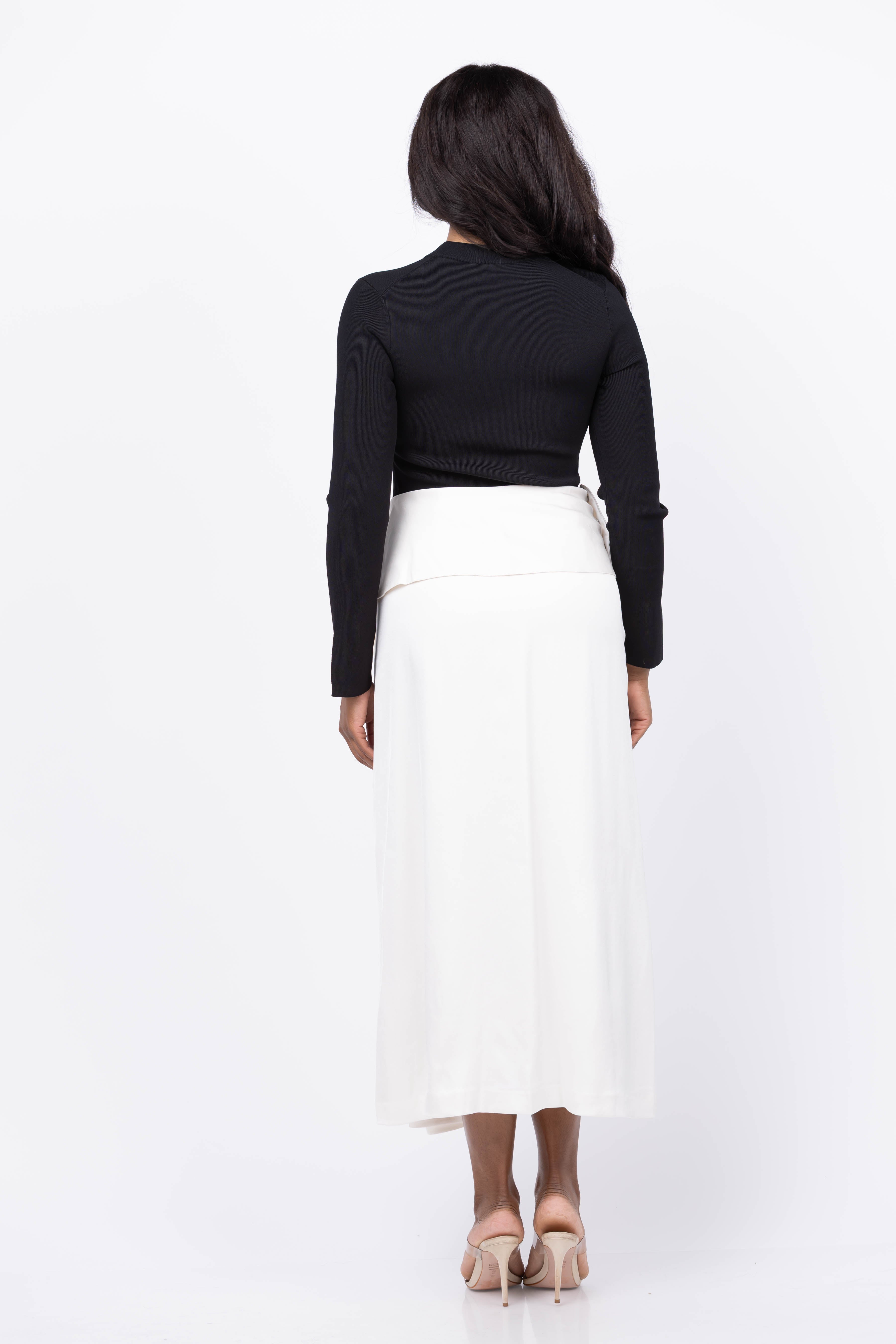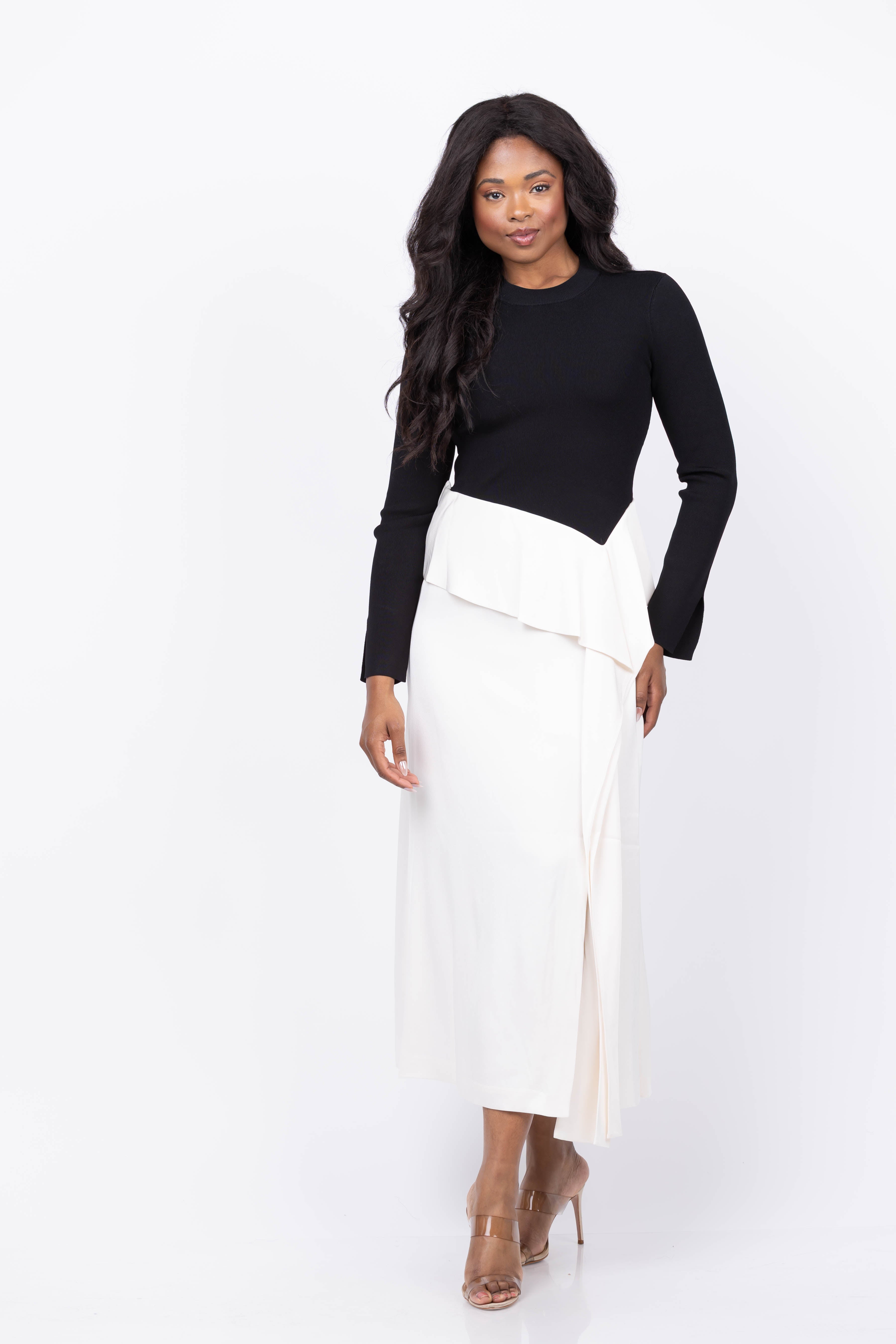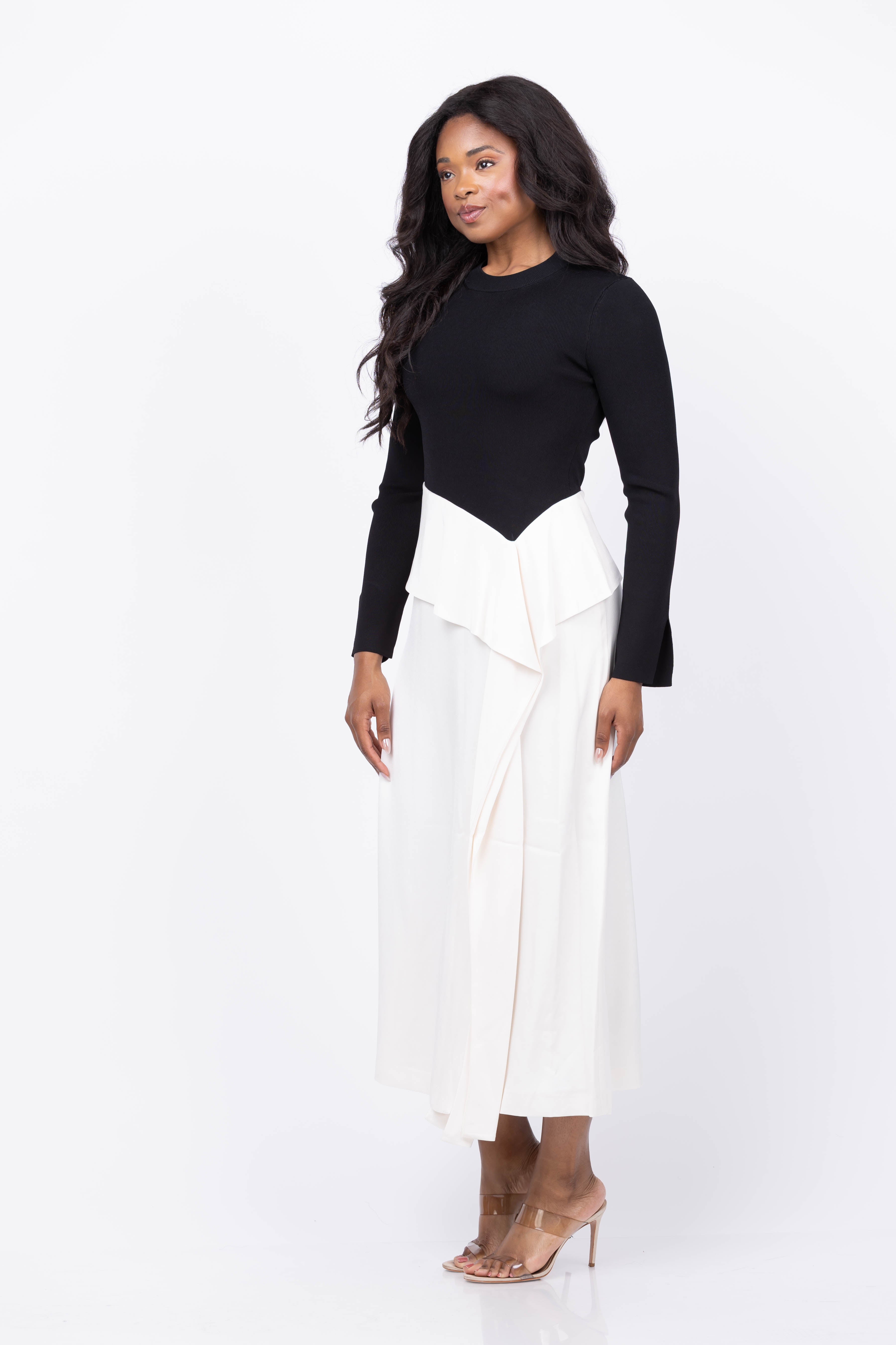 The Simkhai Ornella Long Sleeve Midi Dress in Black Multi combines a sleek, fitted knit top with a flowing satin skirt for a stunning mixed-media look. Its flattering V-waist enhances your silhouette, while the elegant foldover hemline adds a touch of sophistication. Perfect for occasions where style and comfort matter, this dress effortlessly elevates your wardrobe with timeless flair.