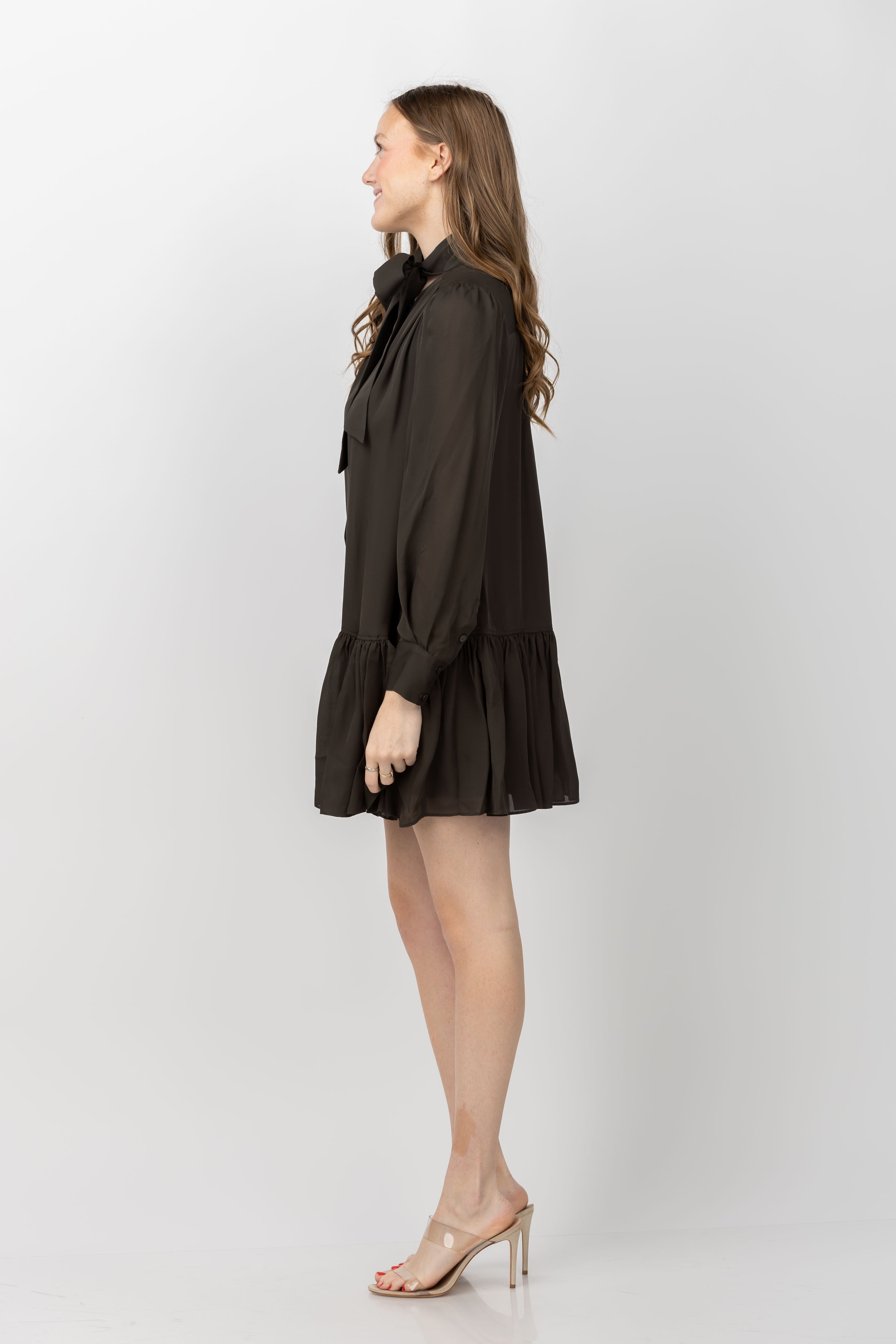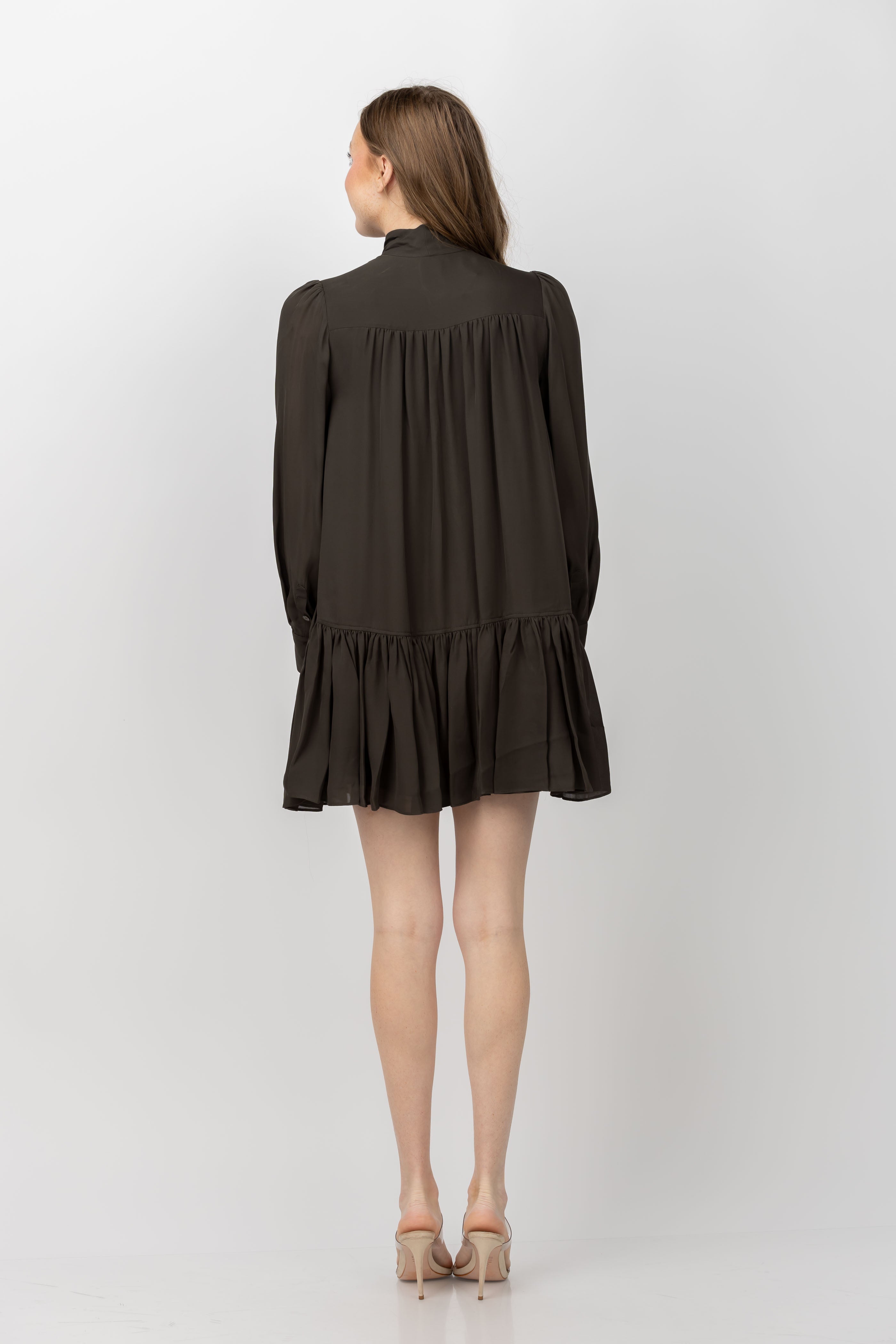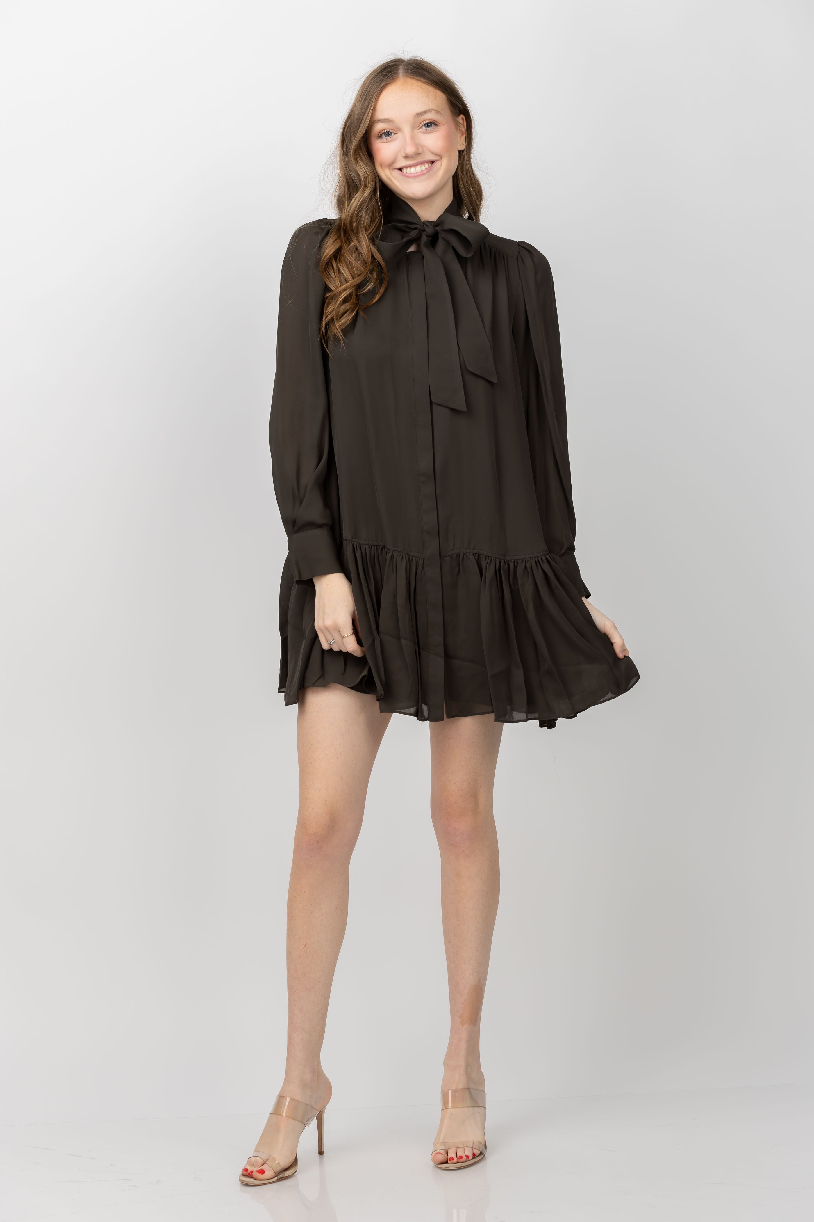 Experience timeless chic with the Simkhai Quince Long Sleeve Mini Dress in Moss. This 100% silk dress features a relaxed silhouette, button-up front, drop waist, and delicate pleating at the hem. Elevate your style and feel effortlessly elegant in this must-have piece.