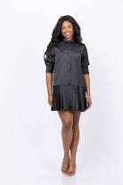 The Simkhai Regina Mini Dress in Black Multi redefines classic style with a modern twist. Featuring a timeless spread collar and hidden button front, this dress offers a sleek, polished look. The updated drop waist and structured pleated twill skirt add contemporary flair and flattering movement, making it a chic choice for day-to-night wear.