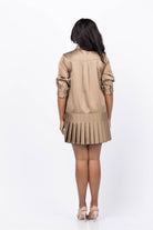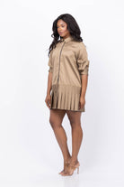The Simkhai Regina Mini Dress in Bronze Multi features a mid-weight, silky twill fabric that drapes beautifully without stretch. Designed with a classic collared neck, elbow-length sleeves, and a pleated skirt, it combines elegance with playful mini length. Practical details like a partial covered button placket, button cuffs, and on-seam side pockets enhance both style and convenience. Perfect for making a confident statement, this dress balances sophistication with modern charm.