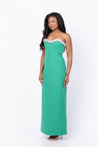 The Riona Embellished Bustier Gown in Kelly Green is a sophisticated choice for those seeking timeless elegance with modern edge. Crafted from luxurious crepe, this strapless column silhouette flatters with its elongating lines while the structured bustier bodice commands attention. Sparkling embellishments trace the neckline, infusing the design with understated glamour. Perfect for galas, weddings, or formal events, this gown seamlessly balances refined simplicity with intricate decorative detailing—a statement piece that transforms any occasion into an unforgettable moment.