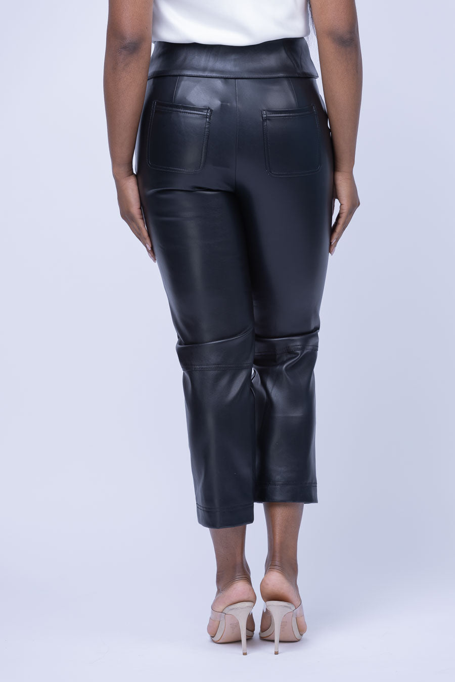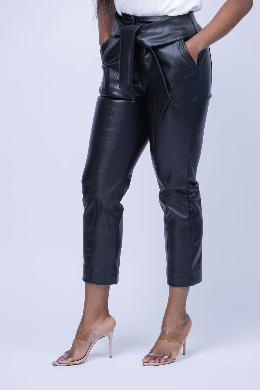 Experience sleek sophistication with Simkhai's Tessa Leather Tie Pants in Black. Expertly crafted from mid-weight, stretch faux leather, these pants feature a fold-over tie at waist and hook and eye closures. Completed with patch front and back pockets, these timeless trousers will elevate any look. Dare to be daringly stylish.