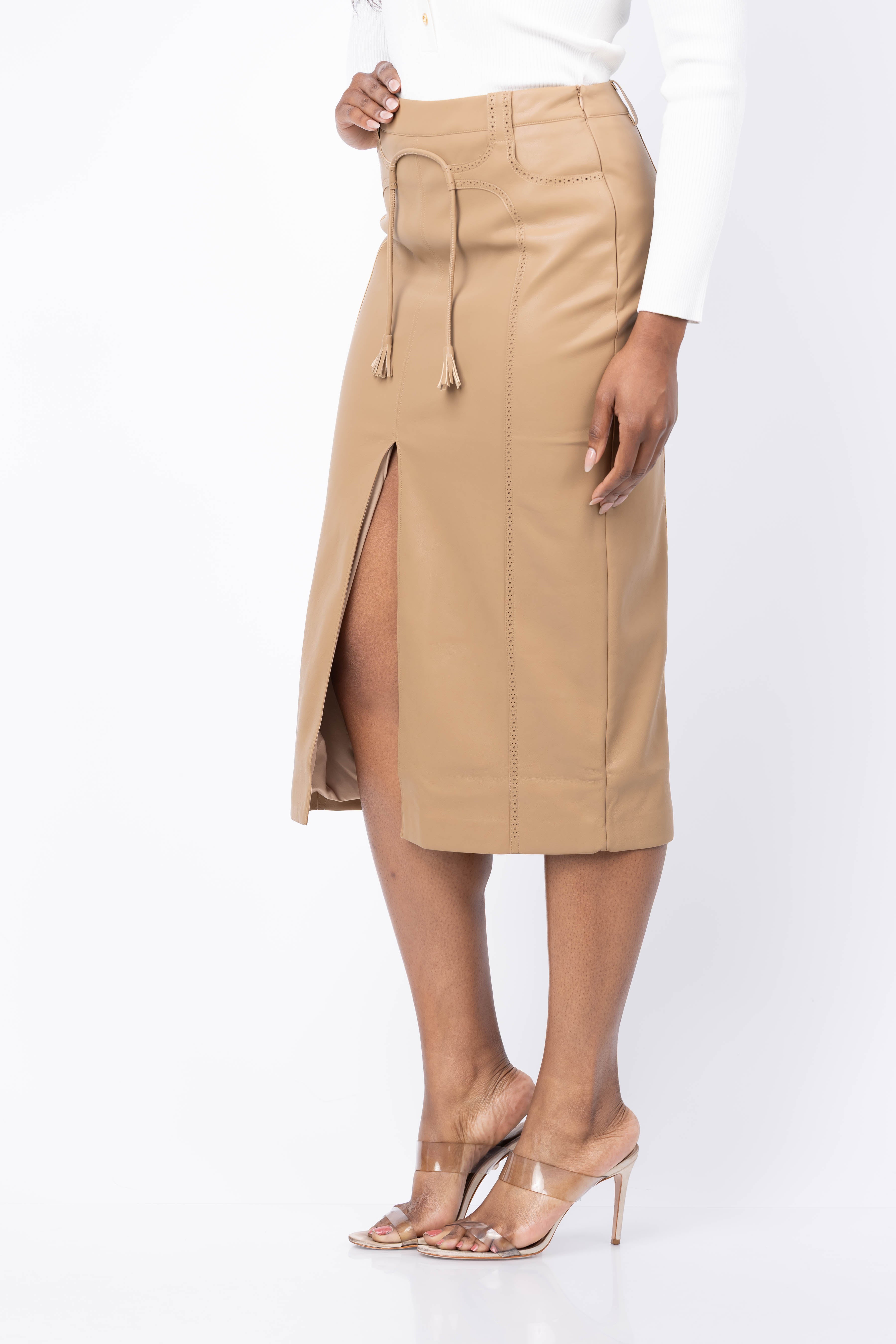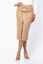 Elevate your wardrobe with the Karina Grimaldi Mona Vegan Leather Midi Skirt in Chestnut. This sophisticated piece features a sleek vegan leather construction that delivers luxury without compromise. The midi length offers timeless elegance, while the strategic slit provides movement and modern flair. Adjustable ties at the waist ensure a customized fit that flatters your silhouette. Perfect for transitioning from office to evening, this versatile skirt pairs effortlessly with everything from crisp blouses to fitted tees. Invest in a statement piece that combines ethical style with undeniable polish.