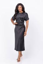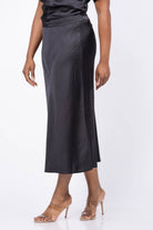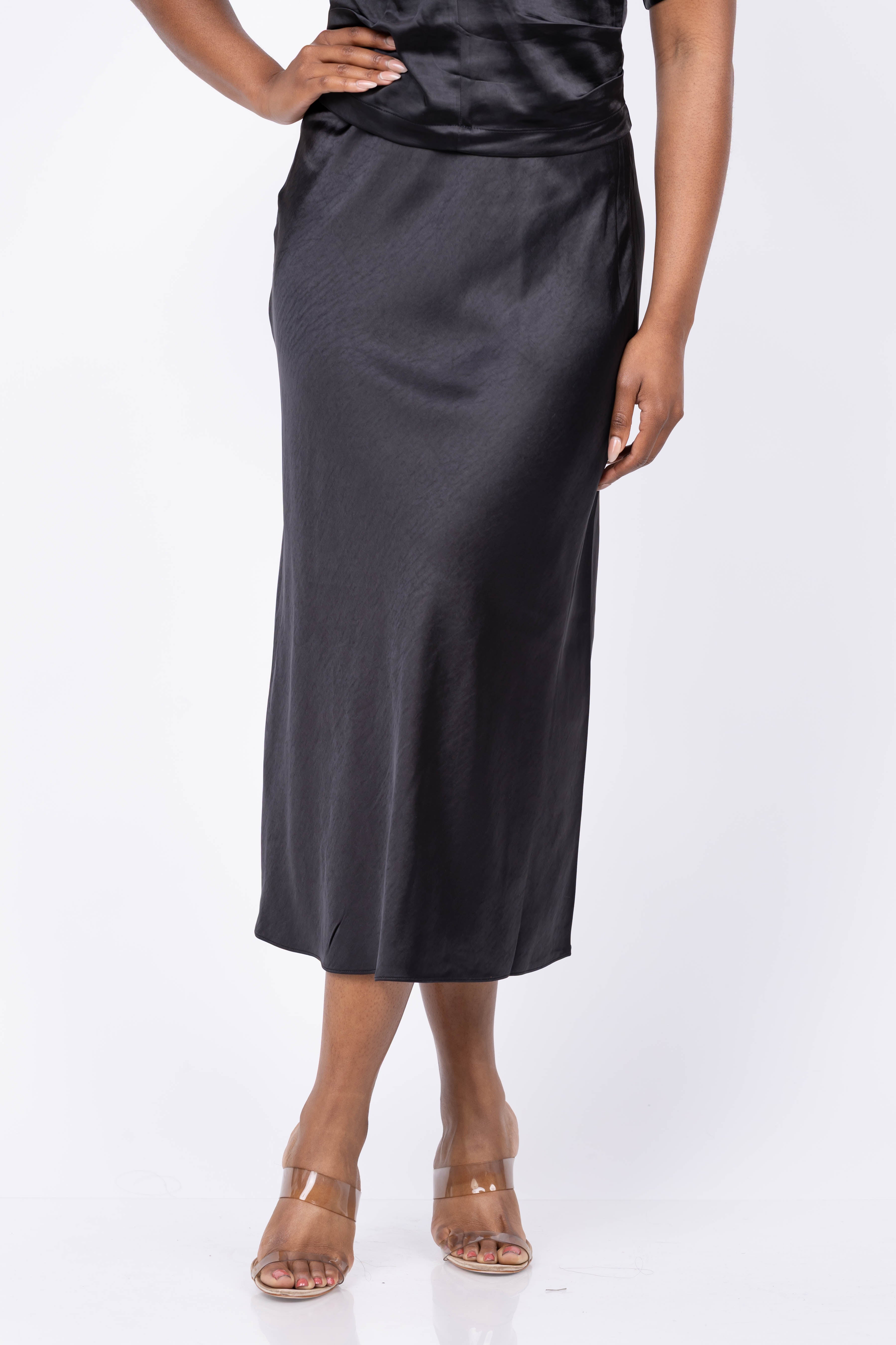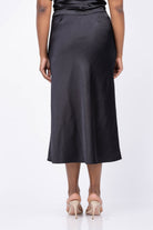 The Lilla P Satin Bias Maxi Skirt in Black offers a sophisticated extension of the classic bias cut, crafted from luxurious satin twill for effortless elegance. Its hidden elastic waistband and precise dart detailing create a sleek, flattering silhouette that moves beautifully. Versatile and timeless, this skirt pairs beautifully with matching satin tops, cozy sweaters, or casual sweatshirts, making it a stylish choice for any season beyond the holidays. Elevate your wardrobe with a graceful piece designed for comfort and year-round wear.