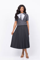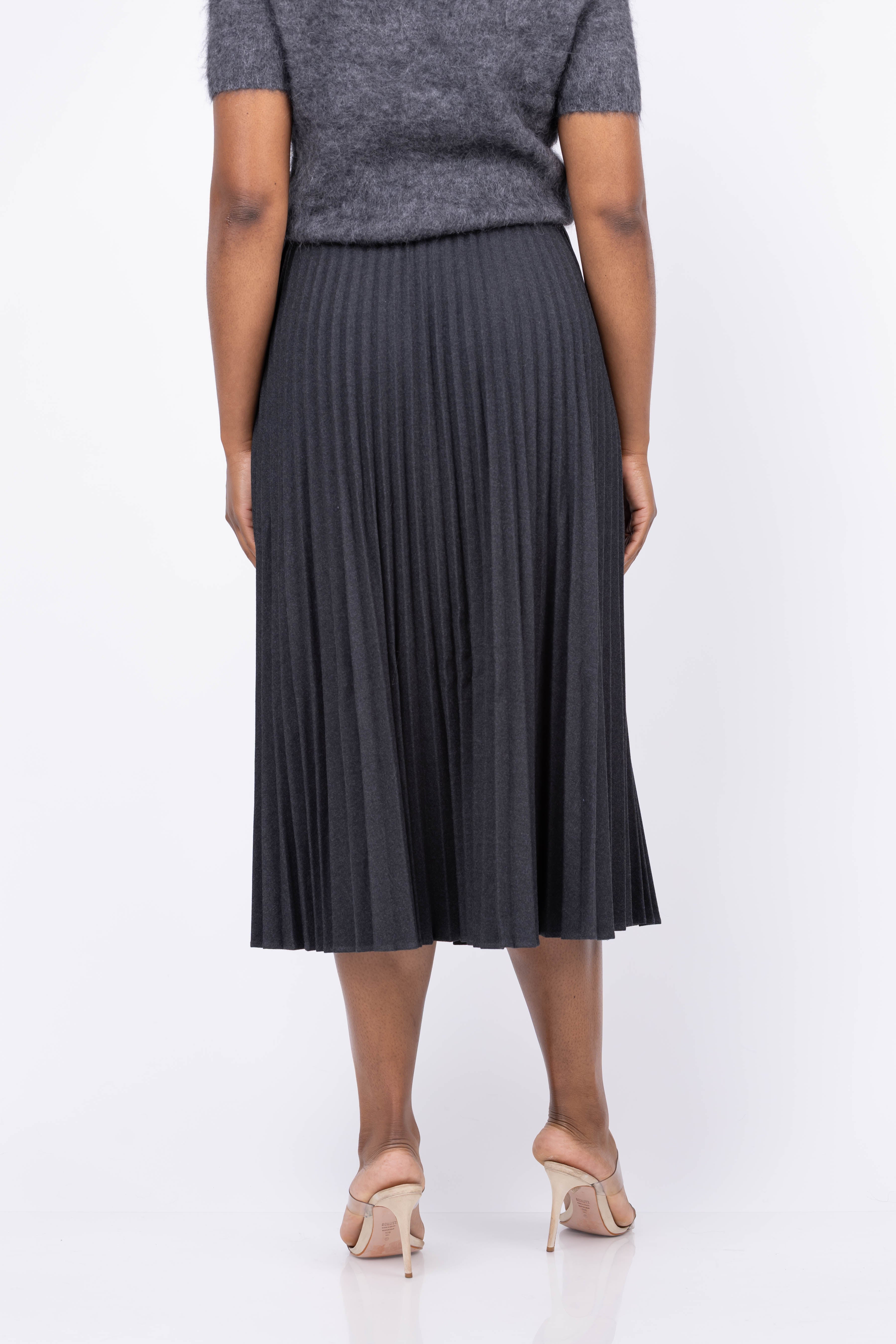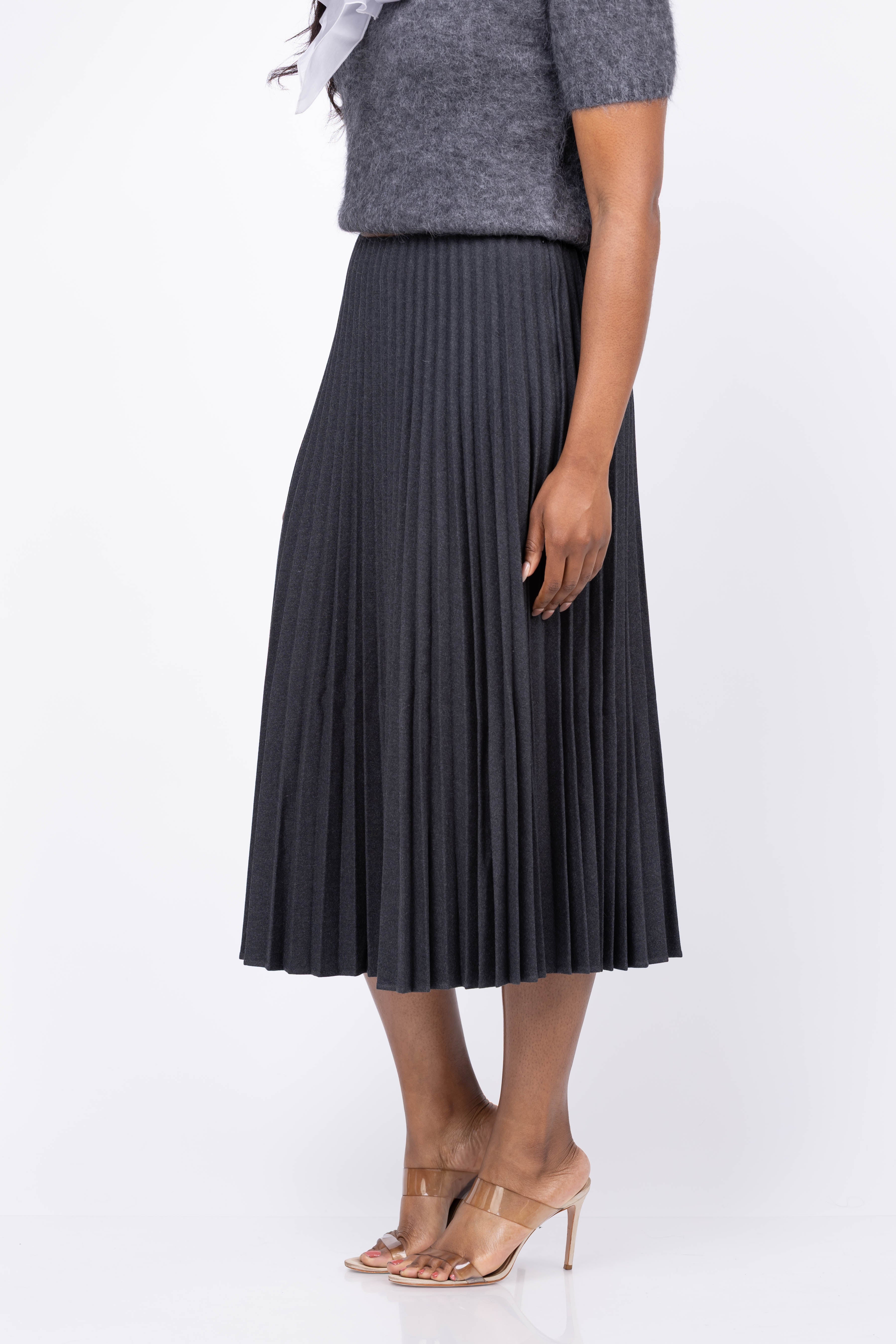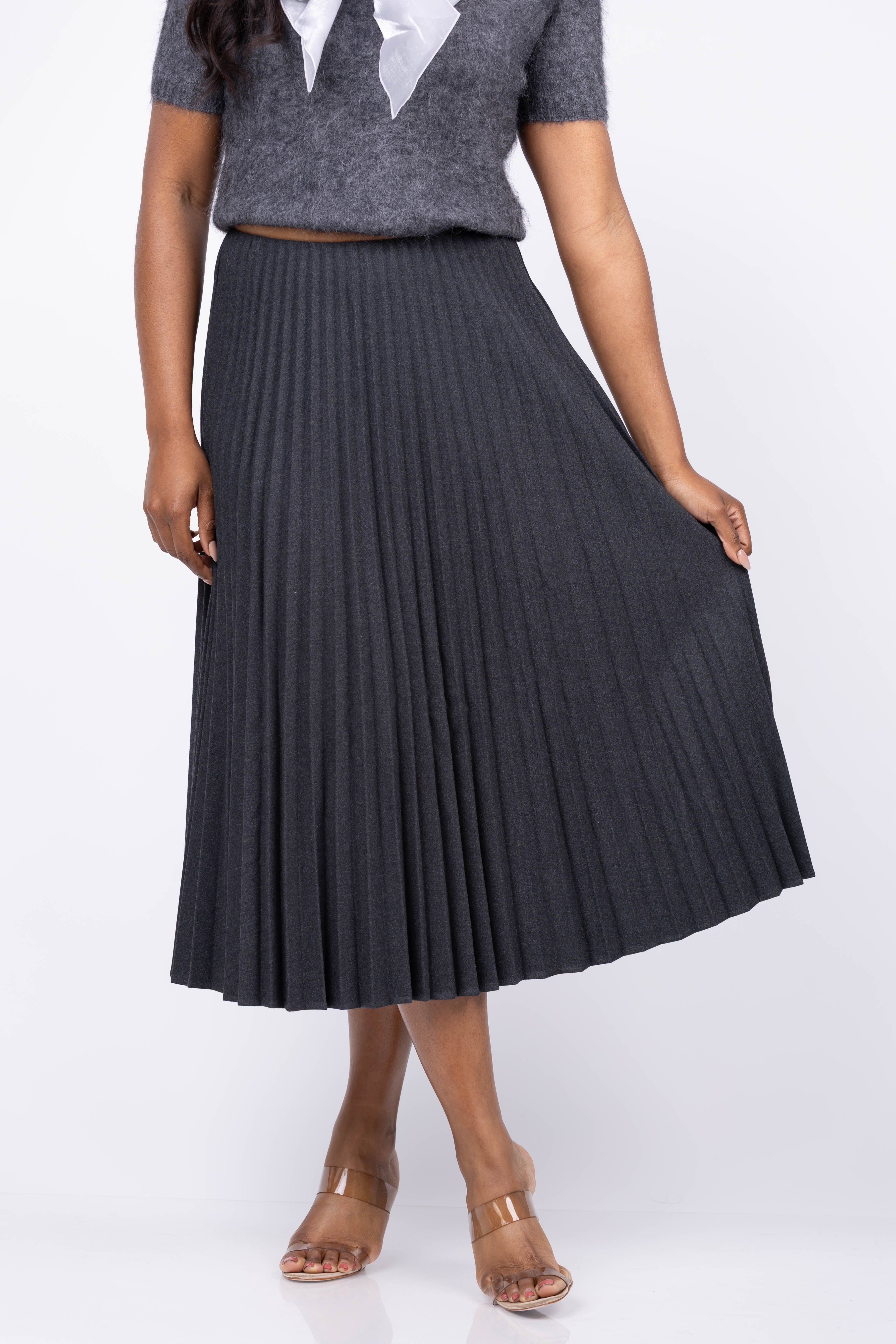 Elevate your wardrobe with the Milly Pleated Midi Skirt in Grey, crafted from a thicker wool-like fabric for cozy warmth without sacrificing style. Its signature pleats create a timeless silhouette that transitions effortlessly from office to outdoor wear. Pair it with a tie-neck blouse for a polished work look or layer it under wool coats to stay chic and comfortable against the cold. This skirt combines elegance and practicality, making it a perfect choice for the season.