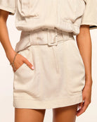 Introducing the Ramy Brook Dara Skirt, featuring a chic buckle belt for a customizable fit. With utility-style side patch pockets, this skirt combines function and fashion. The elasticized, shirred back waist ensures comfort and style. Elevate any outfit with this must-have mini!