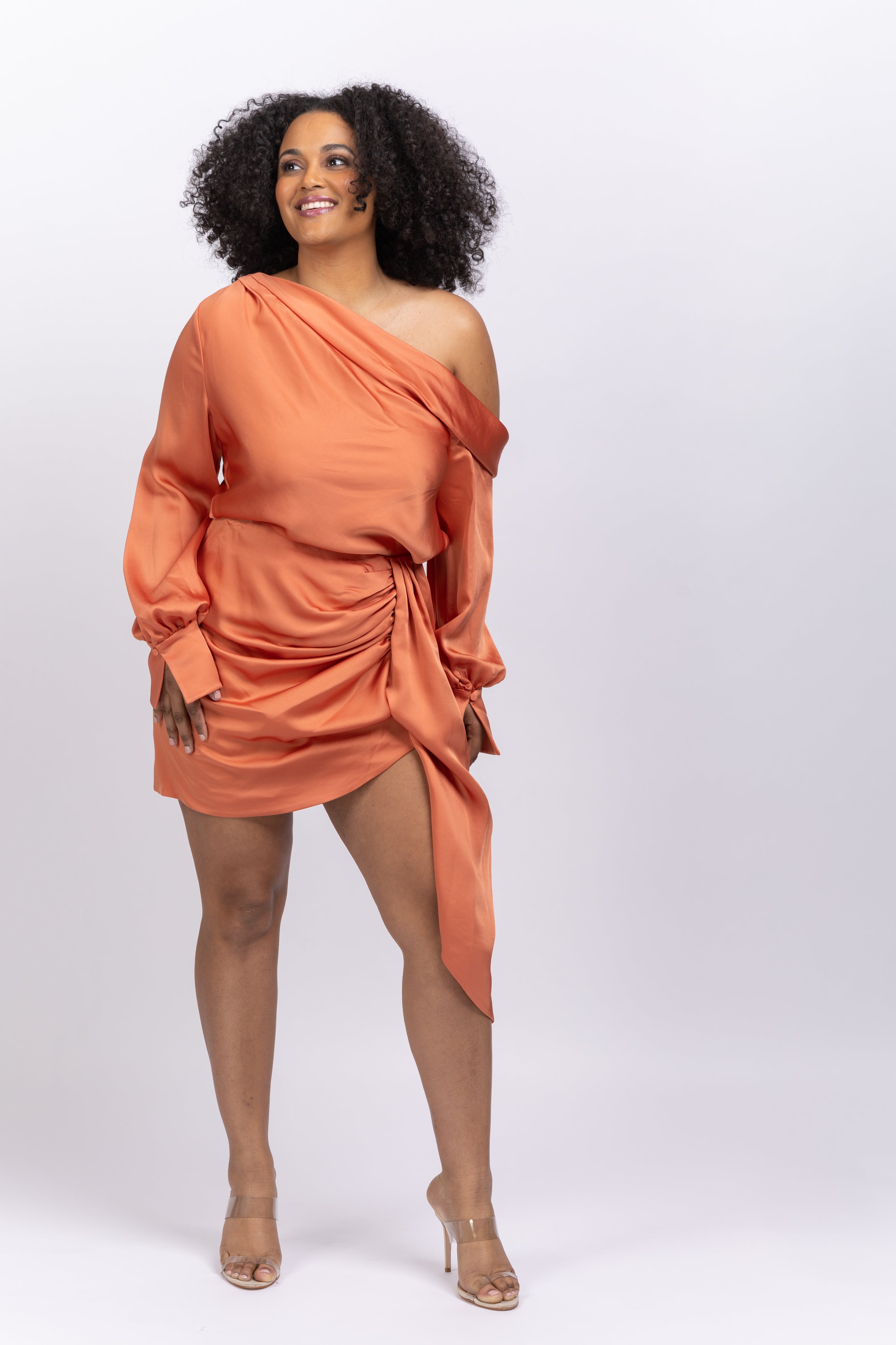 The Mae Draped Mini Skirt in Coral. Satin draped mini skirt with asymmetrical side sash in a seasonal coral hue.
