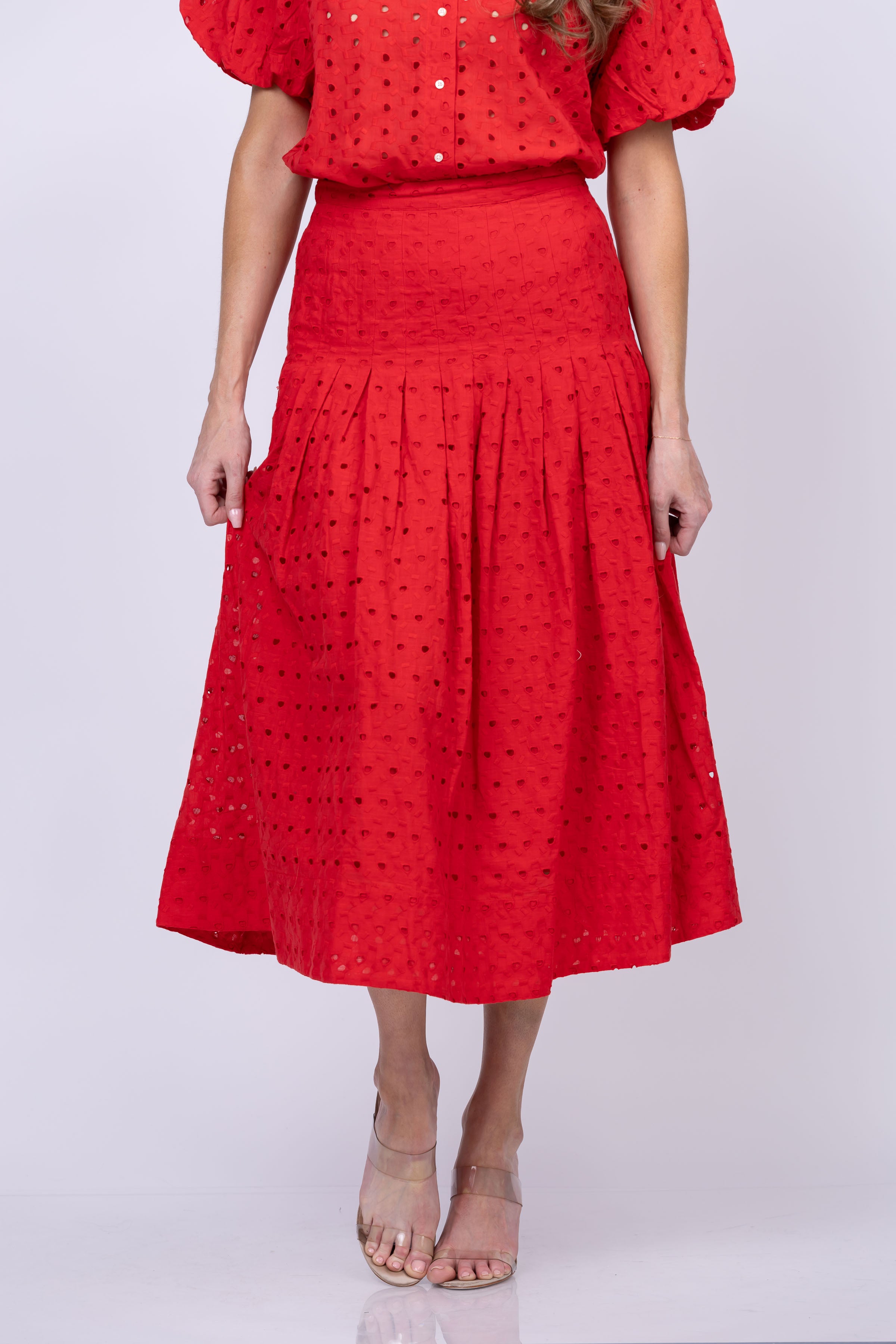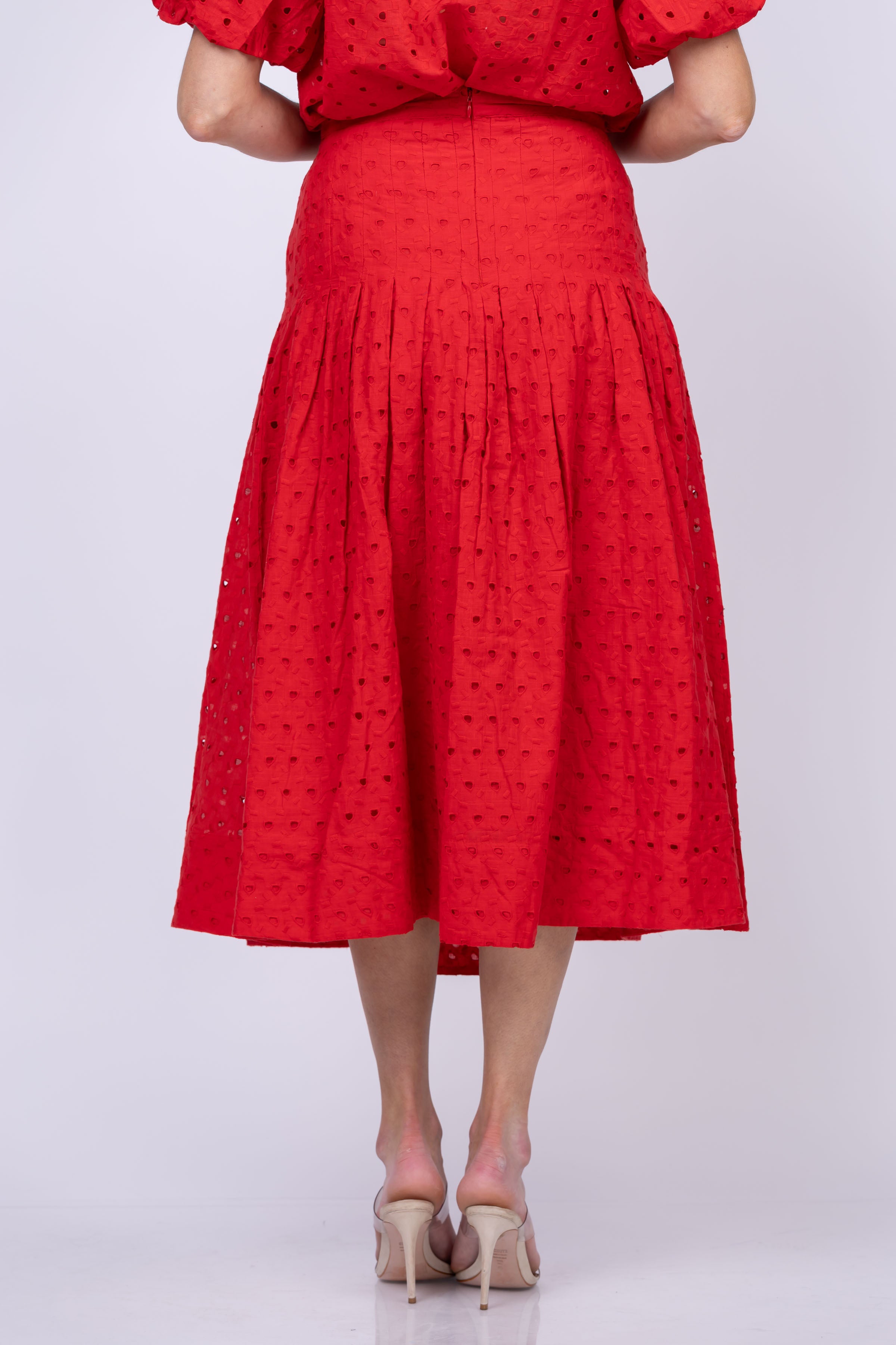 Add a touch of drama to your wardrobe with The Rhythm Skirt in Red Rose. Inspired by Victorian fashion, this midi skirt is made from lightweight cotton eyelet with a flat waist band and pleated pintucked details. Slim through the hips, it flares into a full, swingy skirt with a chunky metal zipper at the back. (Get ready to spin like a Victorian dancer!)