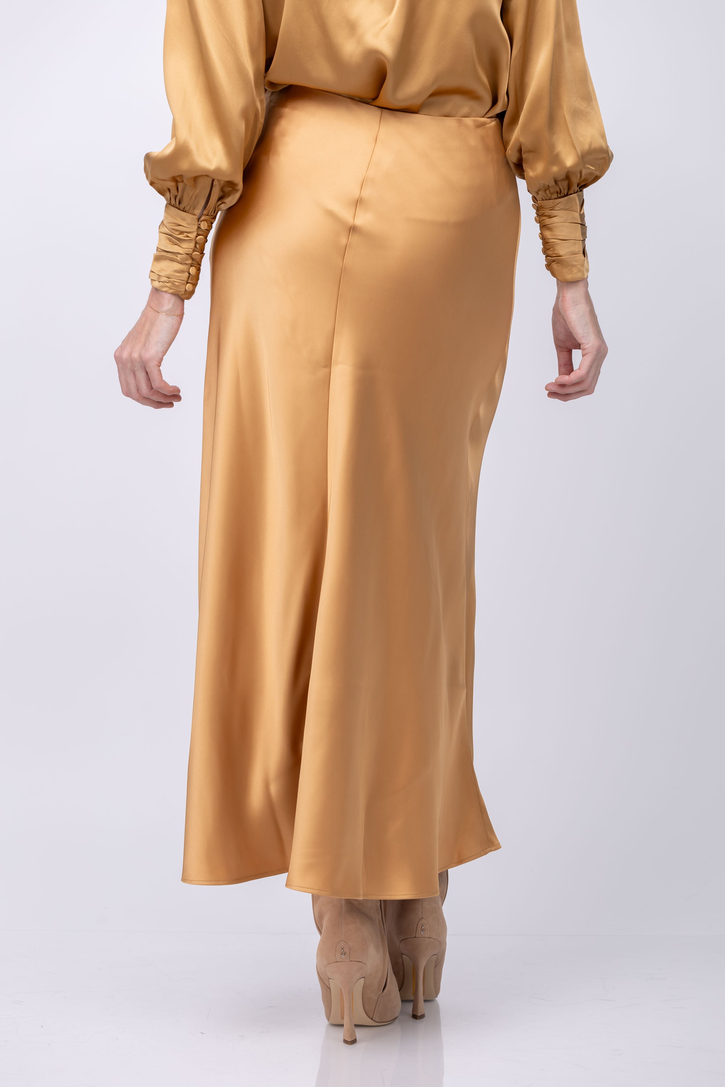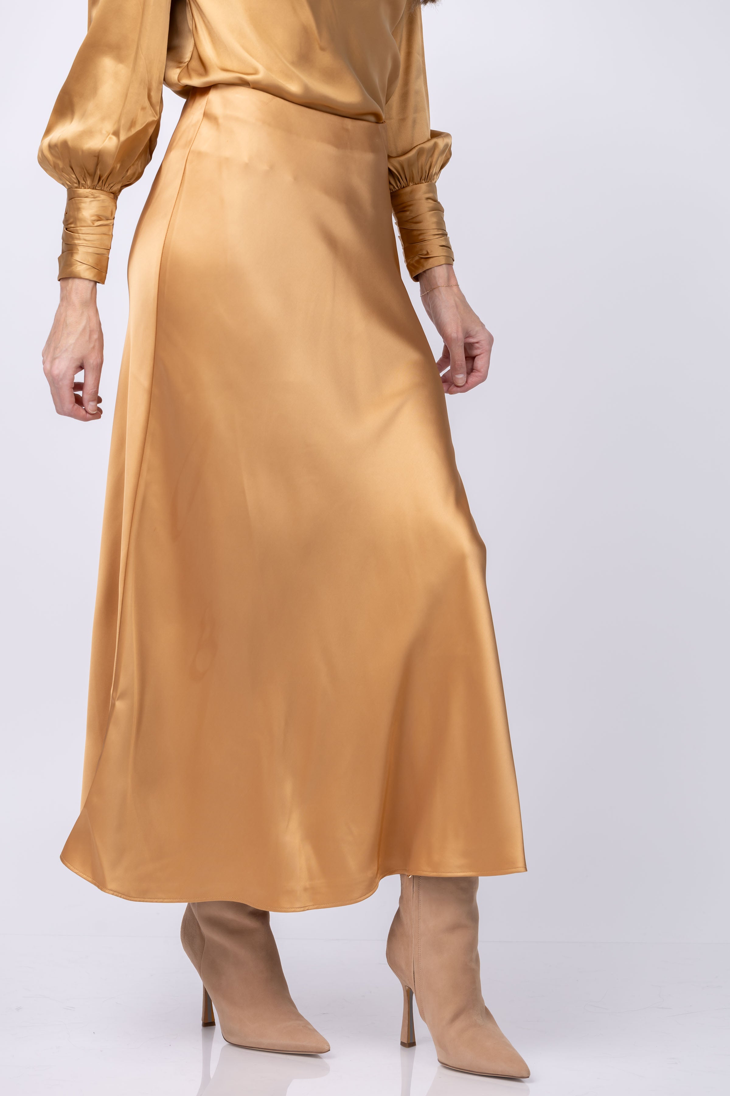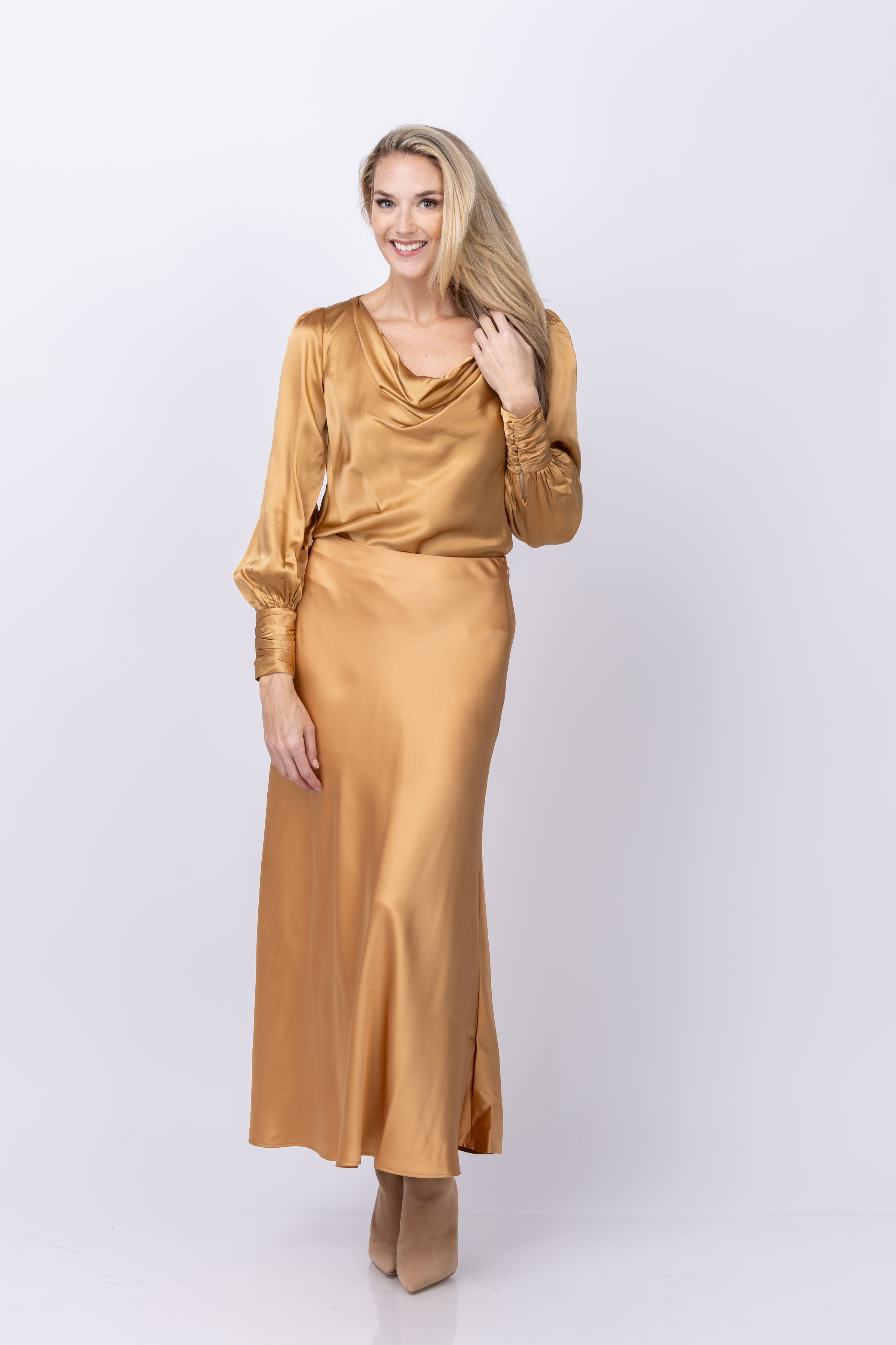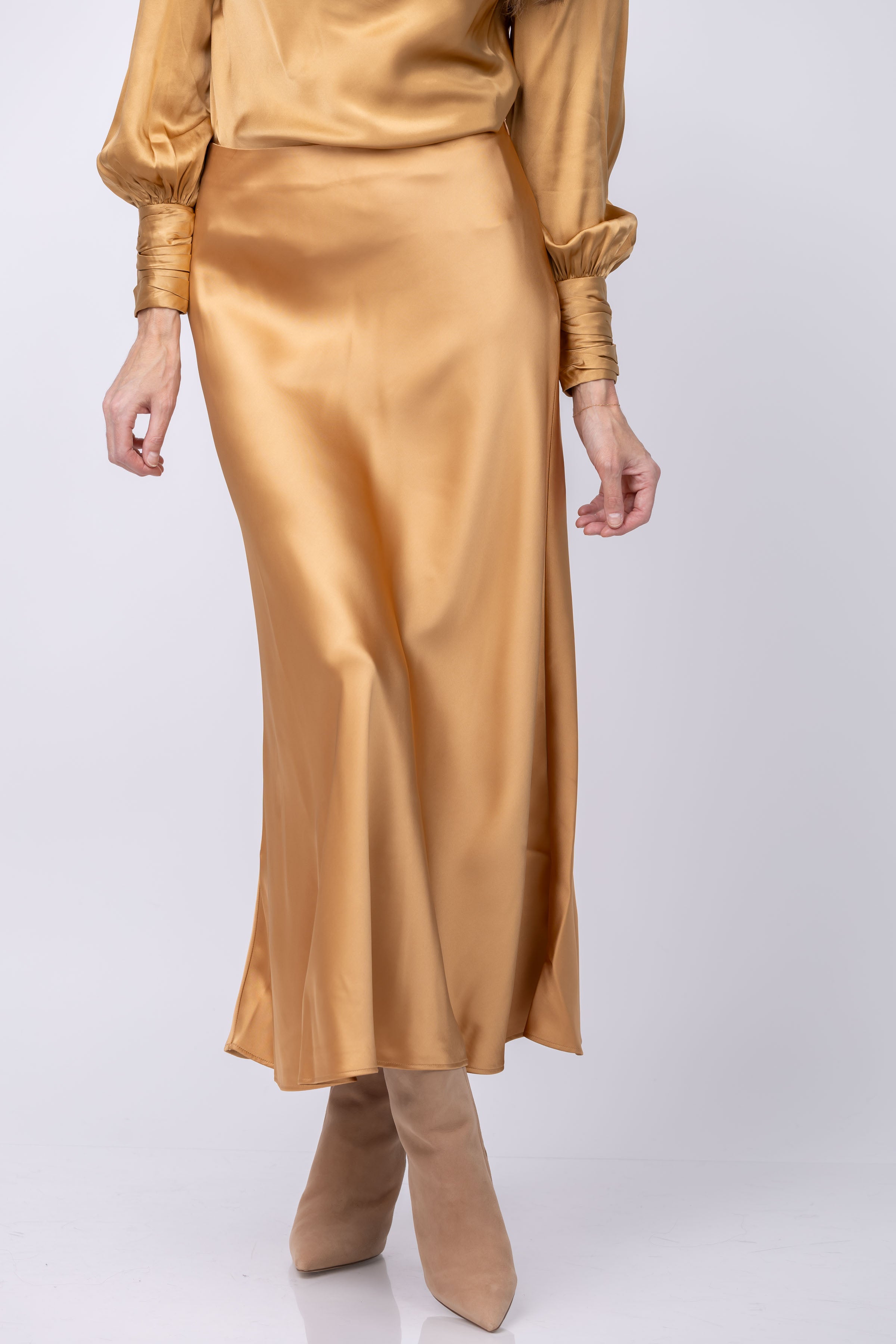 Introducing the must-have Tyler Boe Edie Charm Skirt in Champagne. This versatile piece is a perfect addition to your wardrobe, easily transitioning from fall to winter. Made from silky charmeuse for a luxurious touch, you can effortlessly dress it up or down for any occasion.