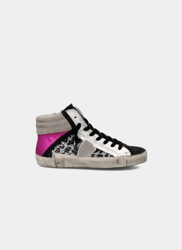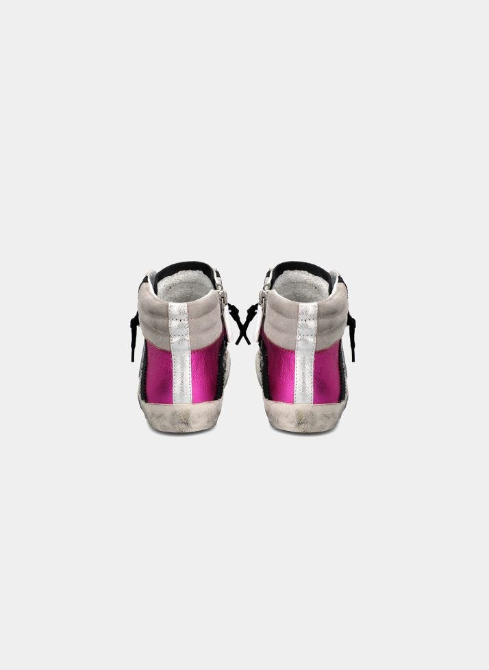 - High-top sneaker with an upper in suede, laminated leather and animal-print, glitter leather. Sole wrapped in rubberised fabric with a vintage treatment and an asymmetric design. Terry cotton lining and 2.5 cm high rubber sole.