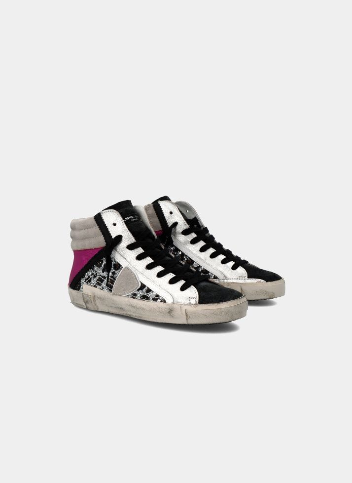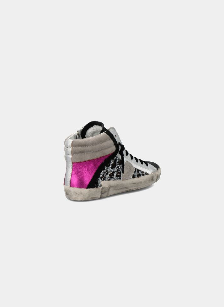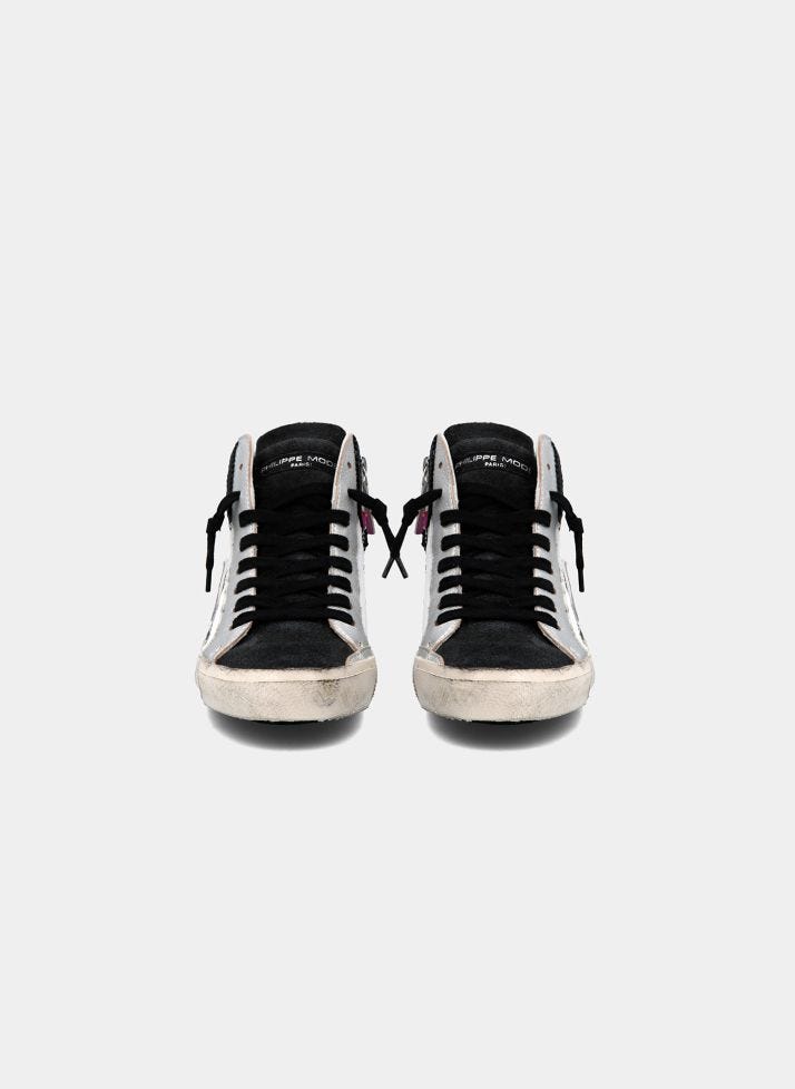 The markings and laminated details are an aesthetic reference to the New York scene, paired with a high top for a full immersion in street style: the Paris sneaker for women is the essence of Philippe Model’s style. The suede and laminated leather upper is combined with glitter and spotted inserts, with an internal zip for a quick fit. The hand-milled rubber trim features a deliberately imperfect asymmetrical shape that has become iconic for the brand.