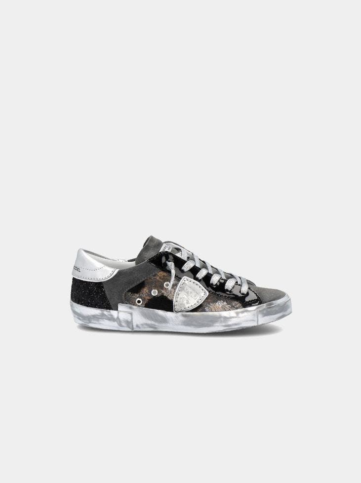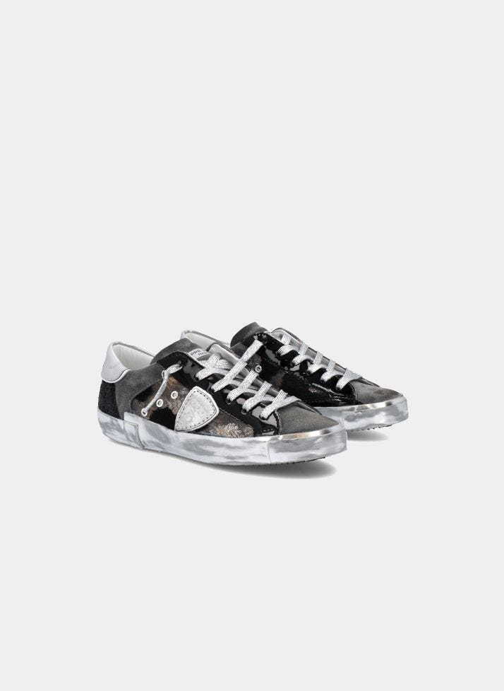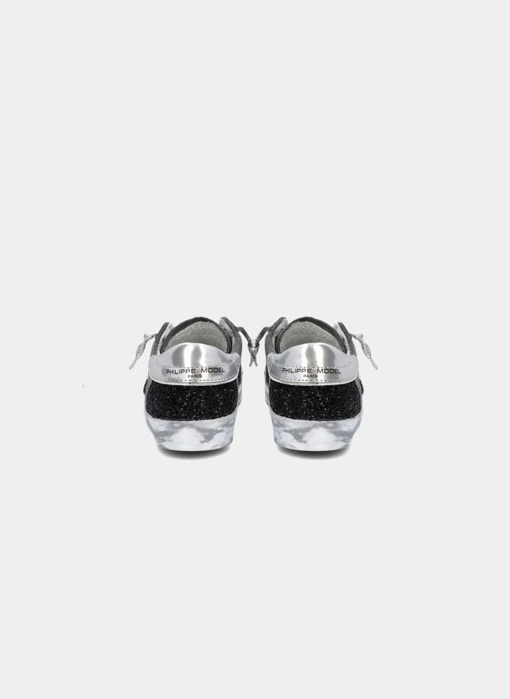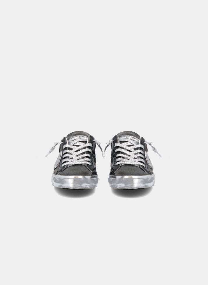 - Low sneaker in suede, silver leather, etched horse hair, patent leather and glittered leather. Lined with leather inside, it’s complemented by a removable foam insole finished in calfskin, a handcrafted milled band on a silver base and a rubber sole with a bespoke outer sole.