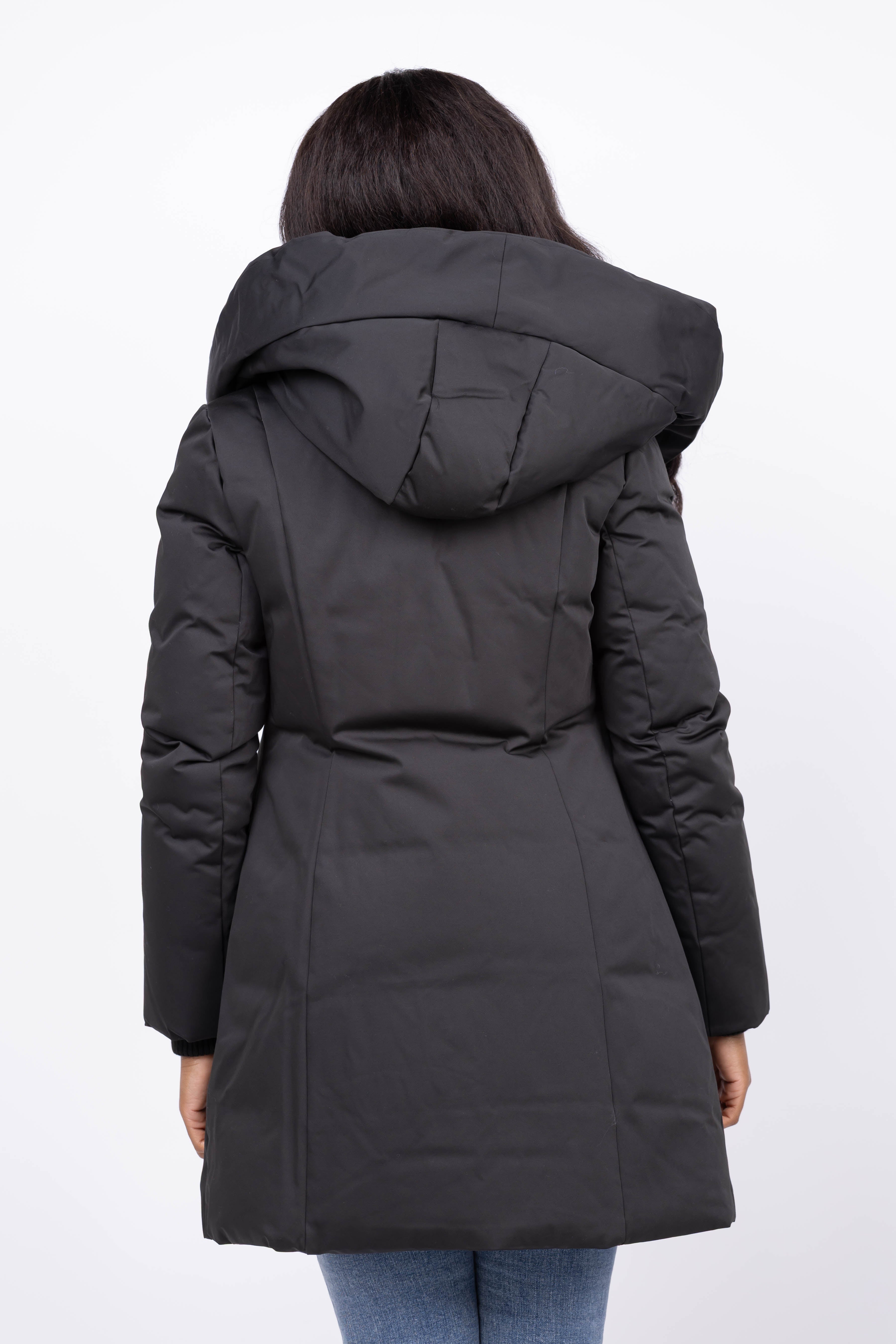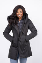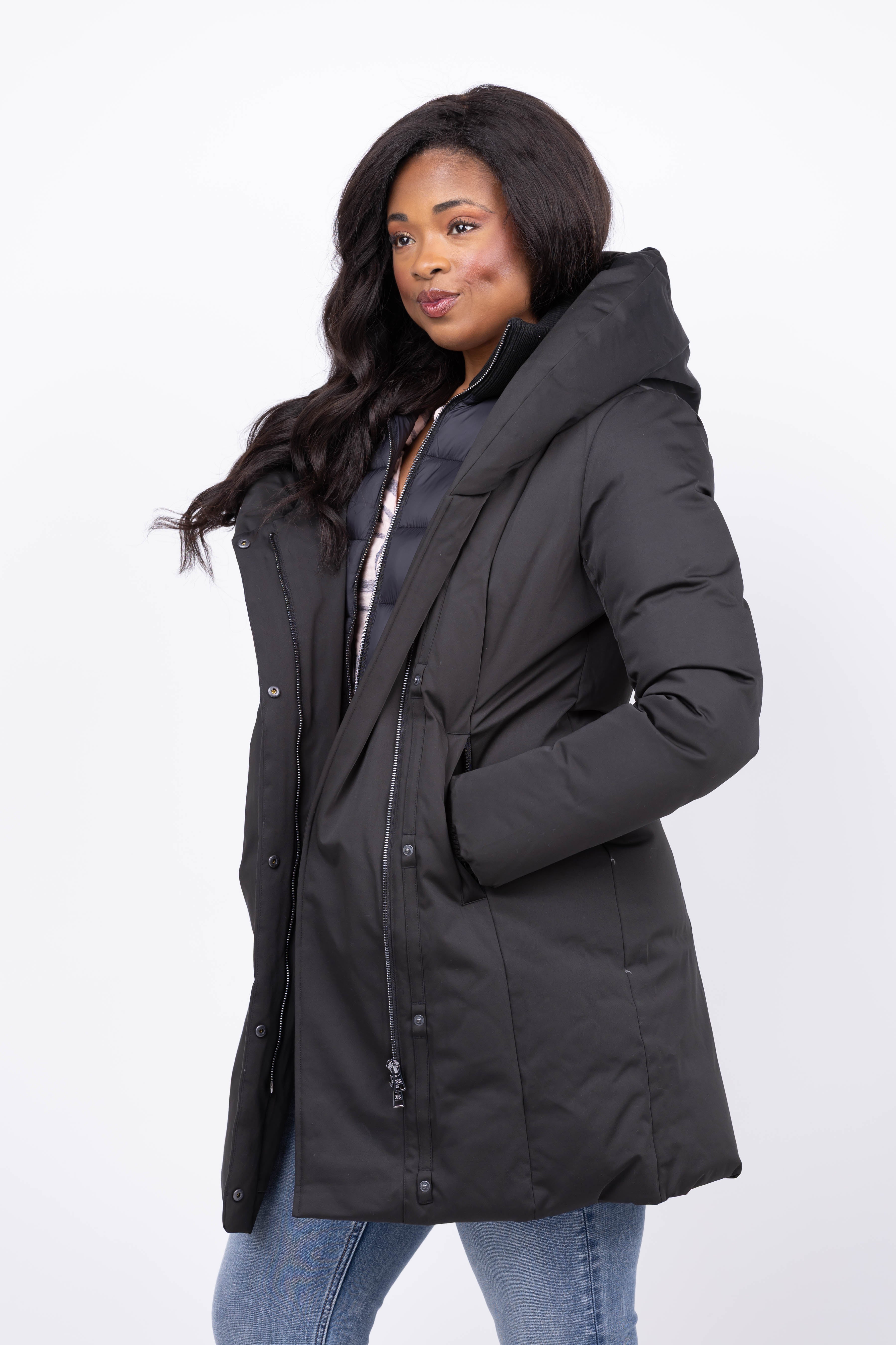 The Soia & Kyo Camelia Coat in Black combines winter-ready performance with elegant design. Engineered to withstand temperatures as low as -30 °C, it features RDS-certified down insulation and a quilted puffer bib for added warmth. Thoughtful details like a hidden zip closure, rib-knit storm cuffs, and fleece-lined pockets enhance comfort and protection. The cotton-blend shell offers a refined texture, creating a sleek, sophisticated silhouette ideal for harsh winter days. Stay warm in style with this expertly crafted coat.