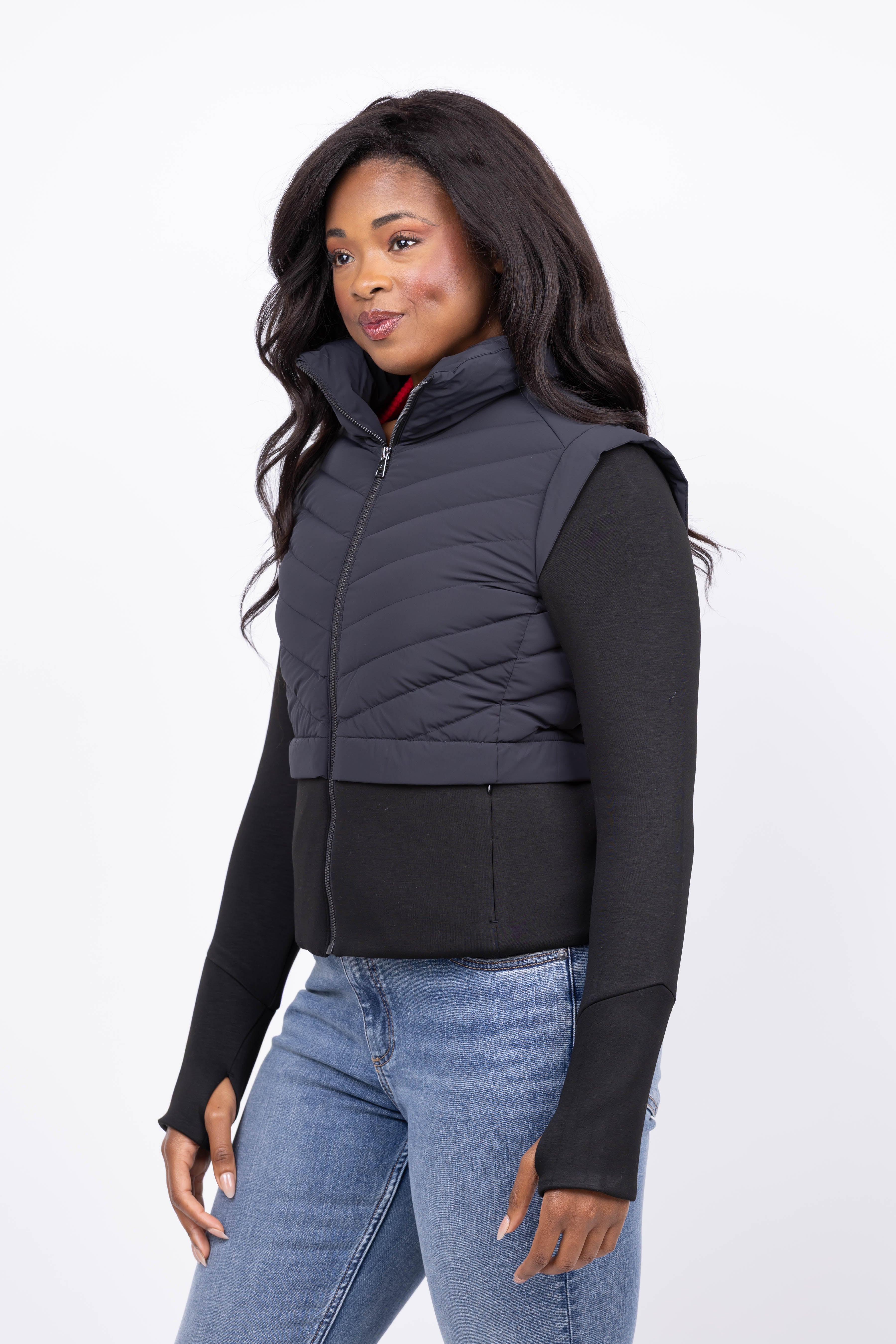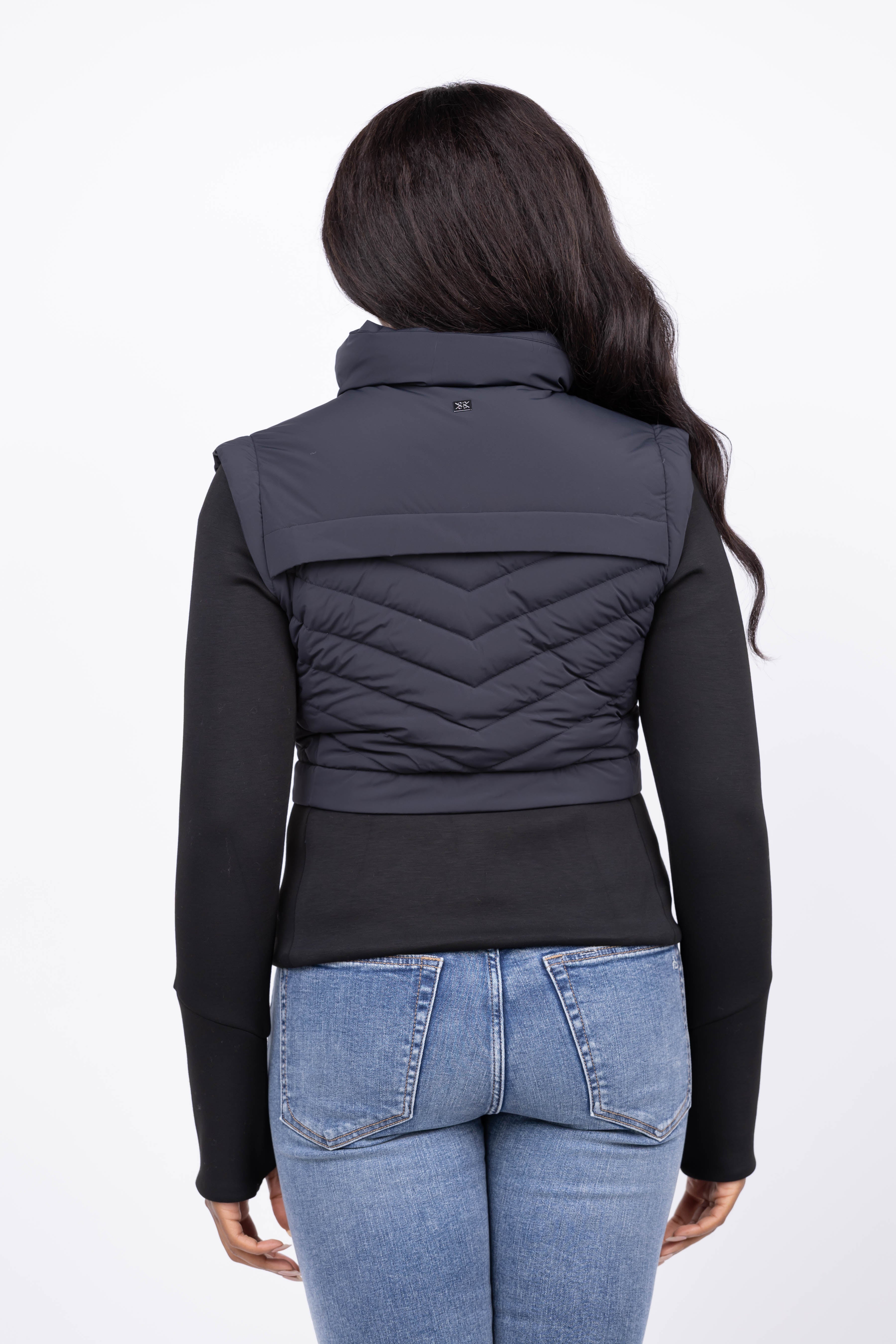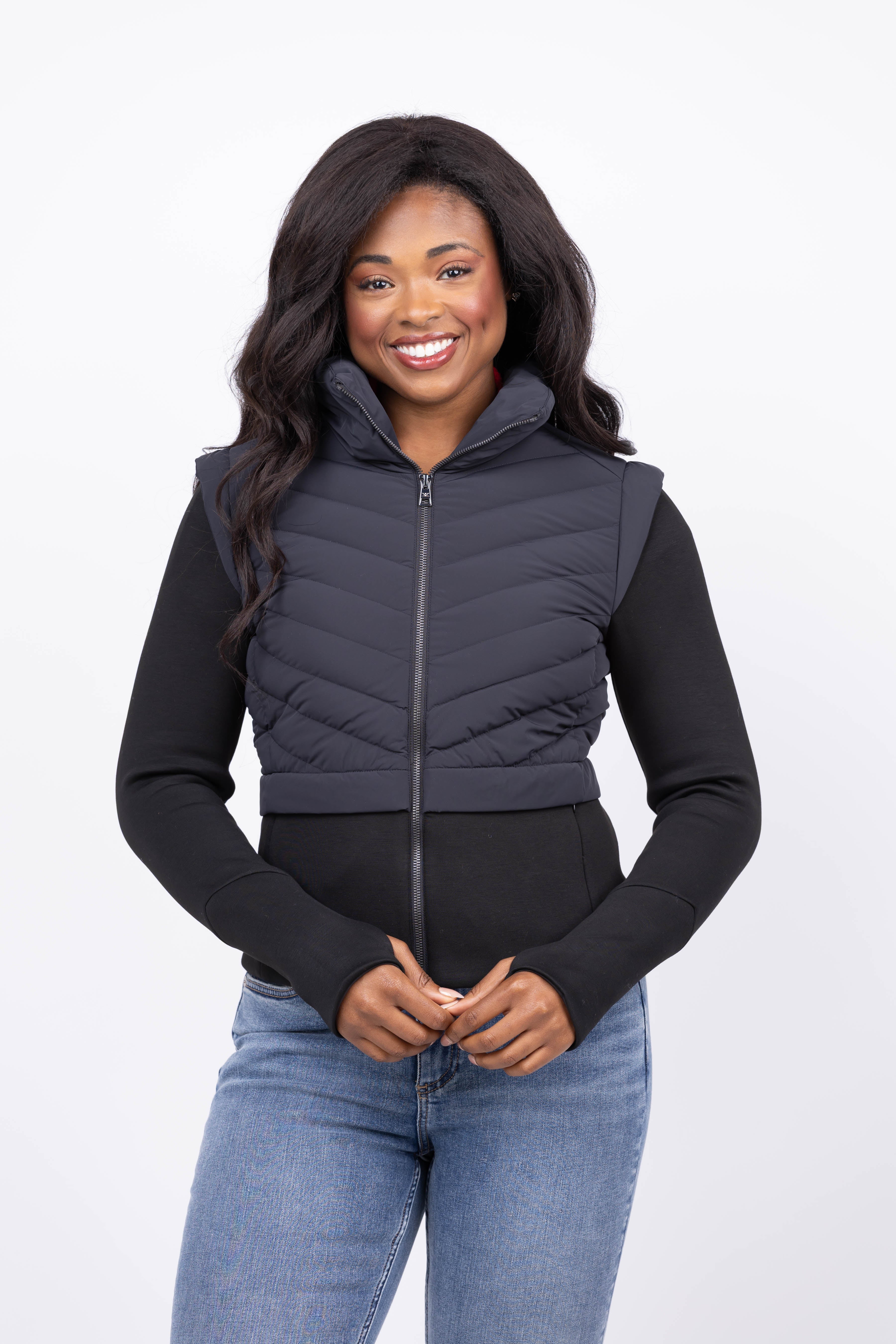 Experience unbeatable style and comfort with the SOIA & KYO Miriam Down Jacket in Black. This sleek jacket blends chevron quilted puffer sections with neoprene cap sleeves and body for enhanced stretch and mobility. Its funnel collar and waist flanges create a flattering silhouette, while brushed-knit cuffs with thumb holes provide warmth and secure fit. The invisible zipper closure completes this slim-fit design, perfect for sophisticated layering in colder weather. Elevate your outerwear wardrobe with a jacket that moves with you and keeps you cozy all day.