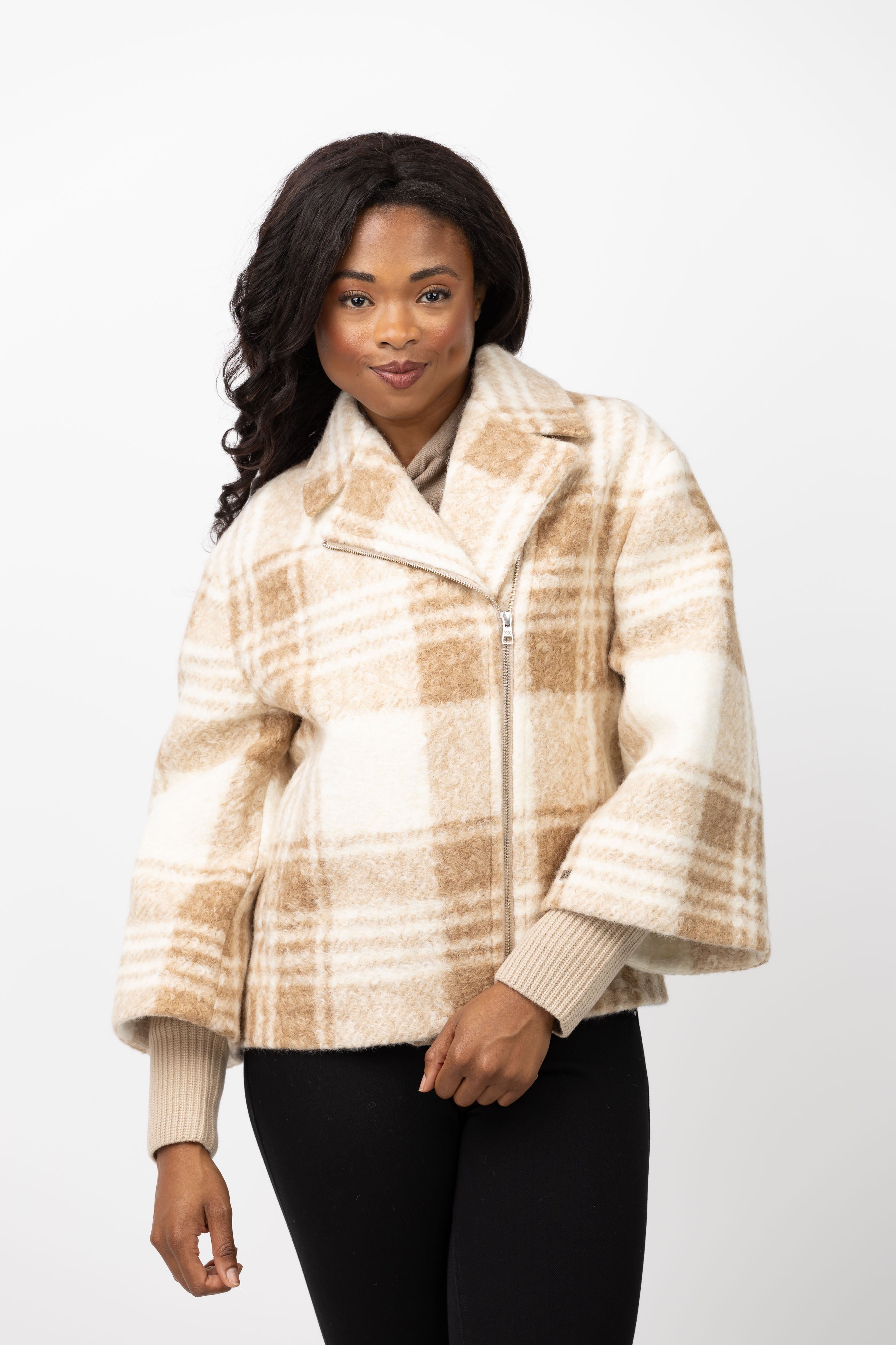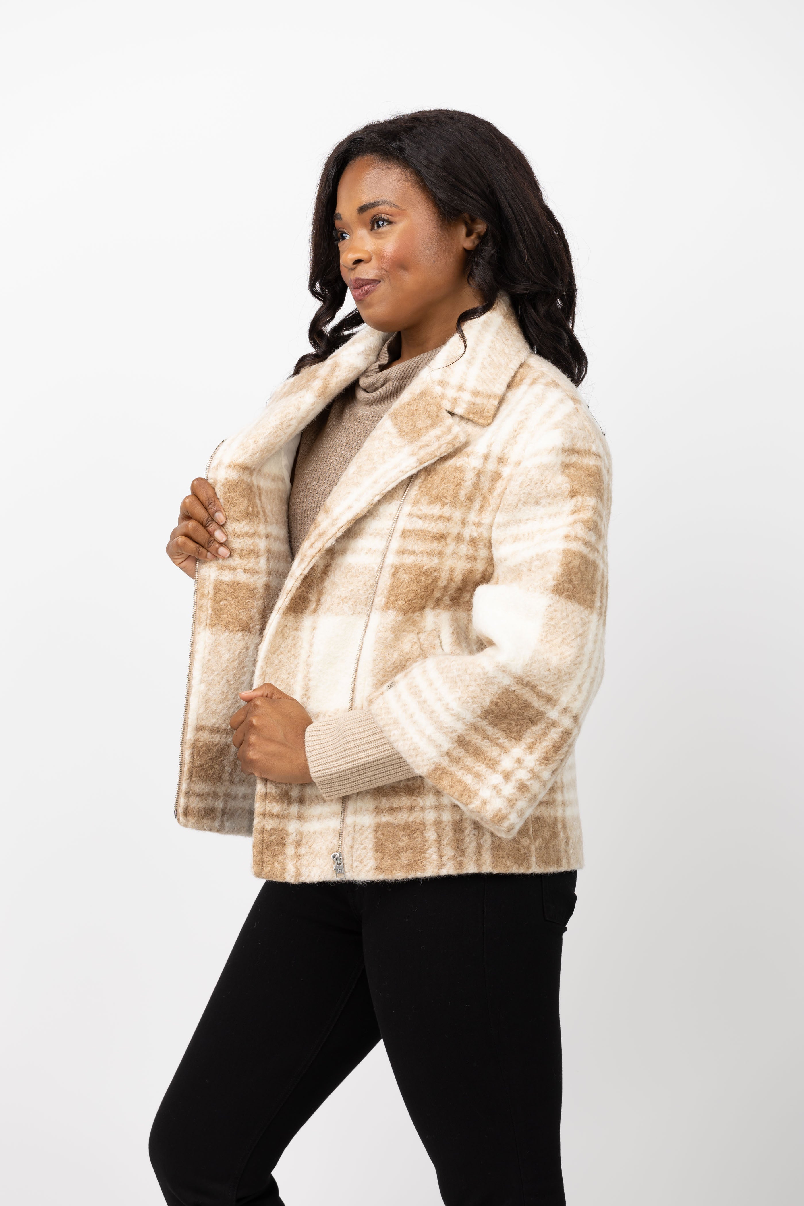 Introducing the Soia & Kyo Pauline Plaid Jacket in Hush - the perfect blend of style and comfort. With its cool biker-style collar, chunky rib-knit storm cuffs, and asymmetrical silver metal zipper, this easygoing plaid jacket delivers both fashion and function. Stay stylish and comfortable on-the-go with angled zippered pockets for added convenience.