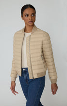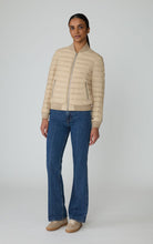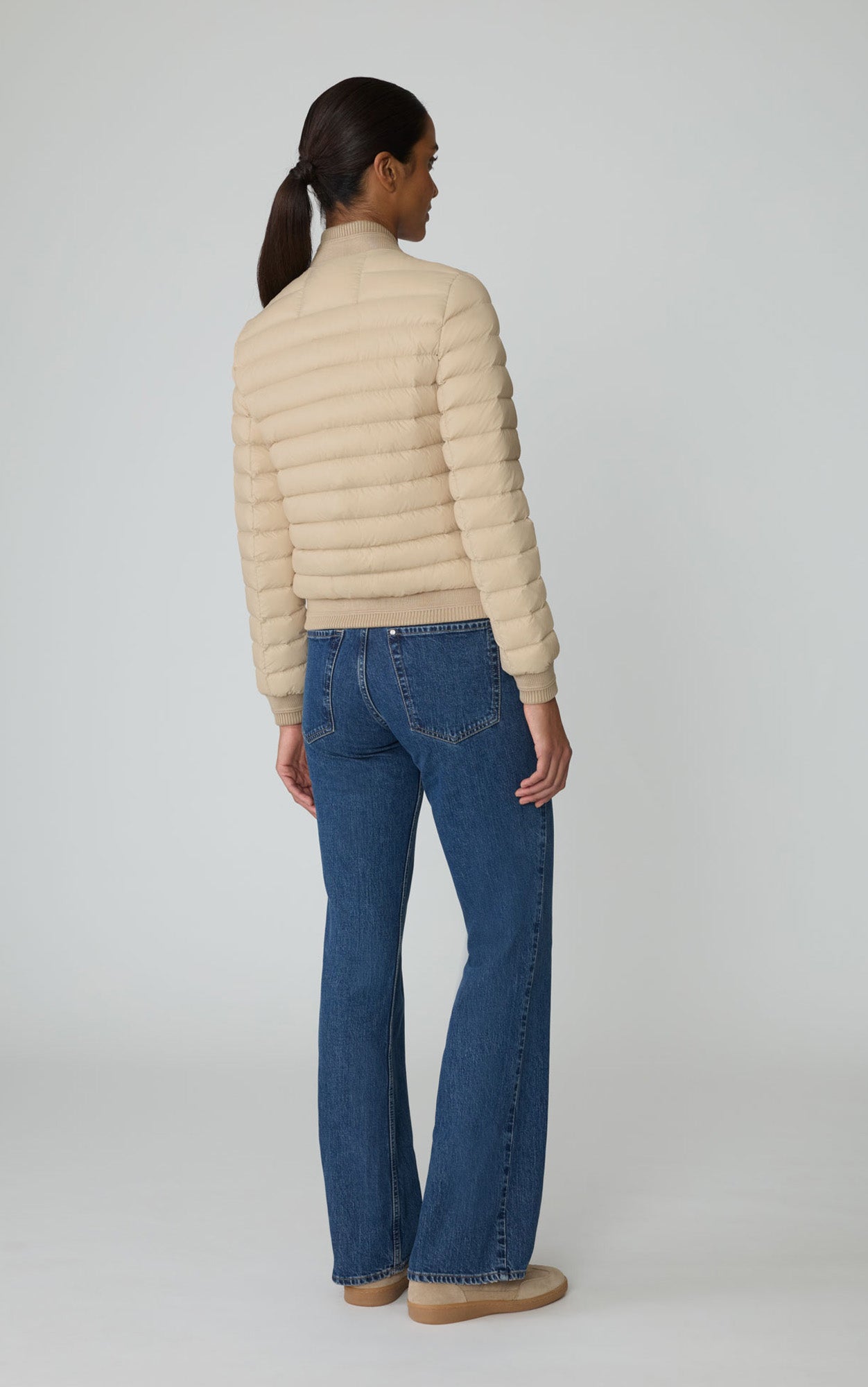 The Soia & Kyo Ronda Down Jacket in Almond offers a stylish, hip-length bomber fit crafted from 100% recycled nylon. Filled with responsibly sourced RDS certified down, it provides lightweight warmth without bulk. Featuring channel quilting and a unique rib-knit baseball collar, waistband, and cuffs, this jacket combines comfort with modern design. Practical angled exposed zipper pockets and a center front zipper closure complete this versatile piece, perfect for elevating your everyday look sustainably.