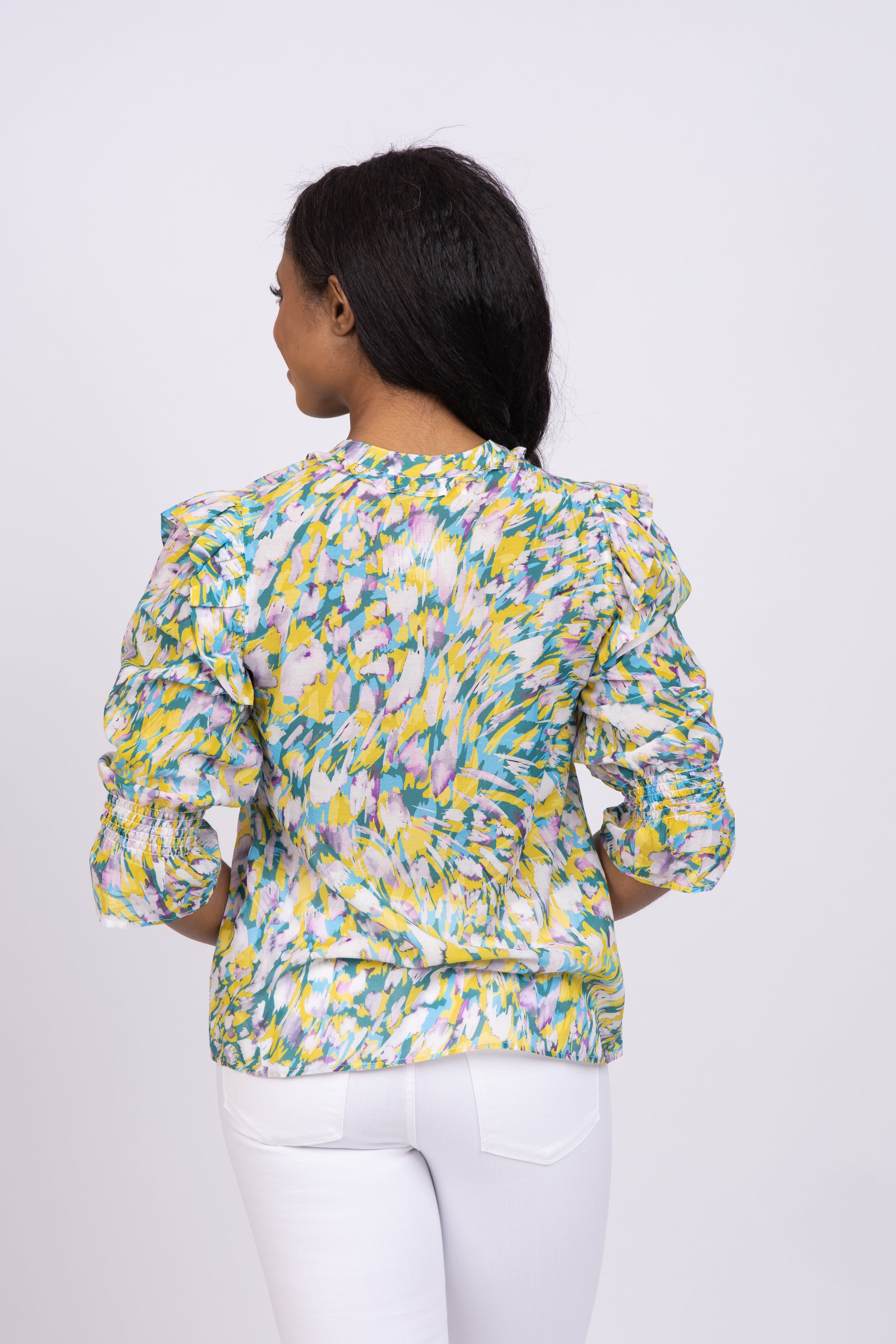 The Julia top is sure to become a closet staple - easy to wear, but instantly polishes your look! It’s the perfect bra-friendly top with soft, delicate ruffle details. The smocked sleeve cuff is comfortable, yet feminine. Printed with a feather strokes print on an ethereal chiffon with the perfect hint of soft sheerness.
