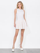 The Alice + Olivia Ella Drop Waist Mini Dress in Off White combines a sleek stretch-knit scuba bodice with a flared vegan leather skirt, creating a flattering silhouette that channels elegant ballerina charm. Its gentle pleats add feminine volume, making it perfect for special occasions or stylish evenings out. Pair it with dangly earrings and strappy sandals to complete a graceful, standout look.