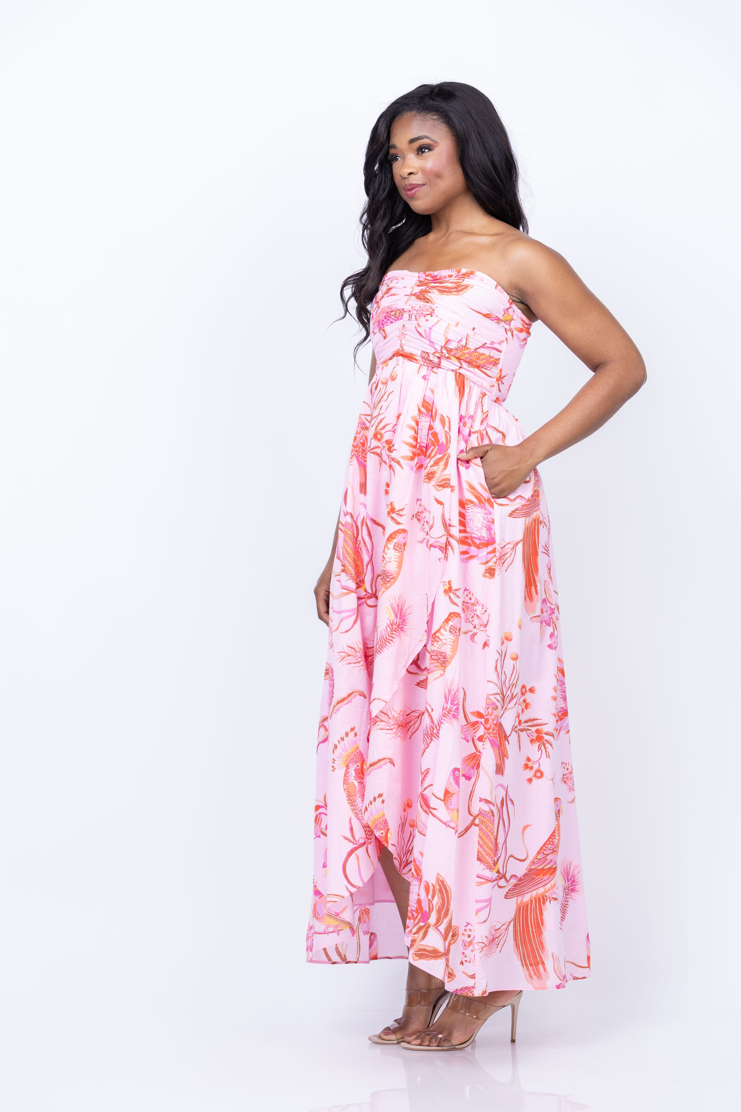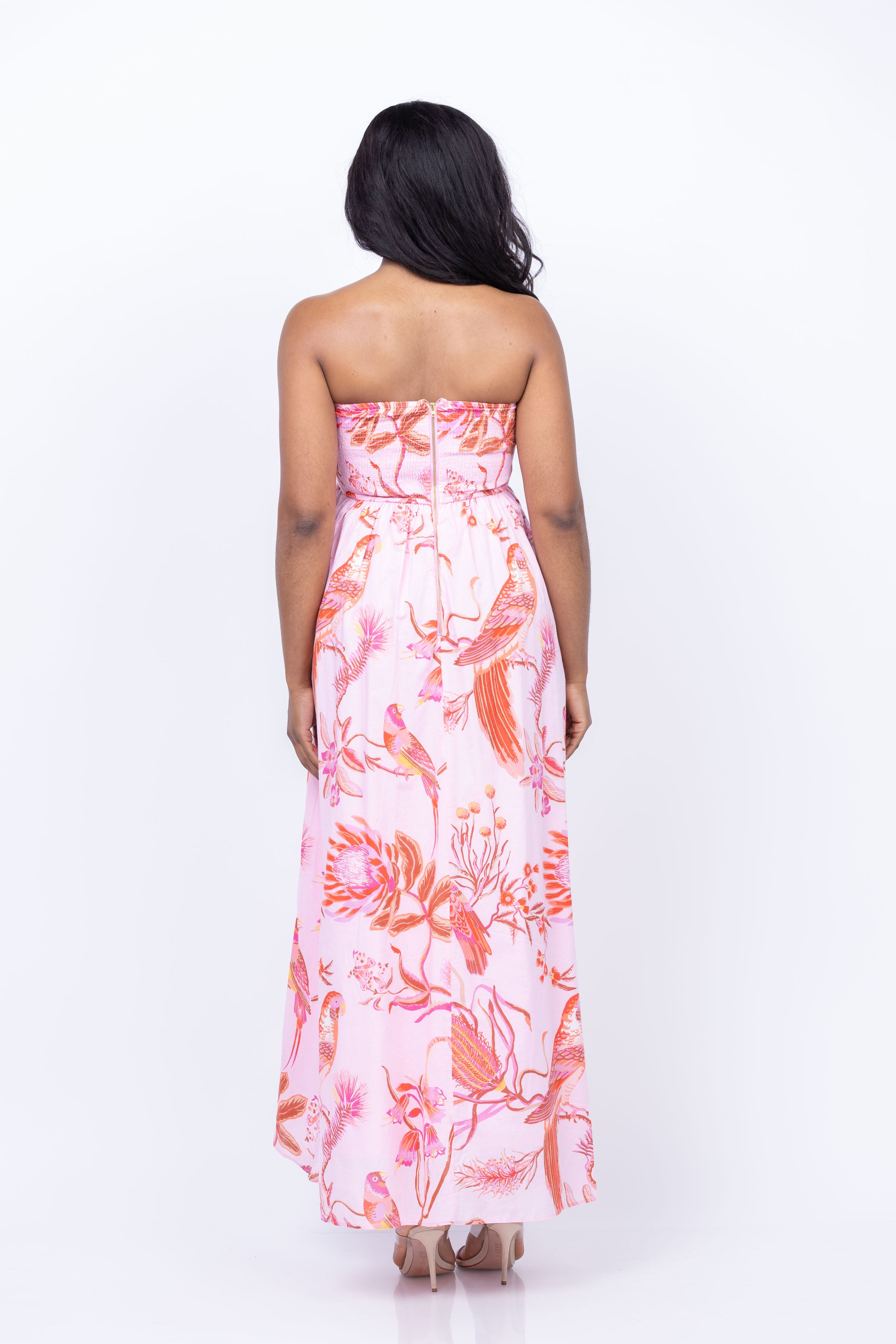 Experience the essence of spring with the Banjanan Madison Dress in Pink Mist. Perfect for celebrations and special occasions, this strapless maxi features our beautiful Botany Bay print, inspired by the colorful flora and fauna of Australia. Enjoy soft volume with ruching and a cascading layered skirt, along with the convenience of a center back zipper and side seam pockets.