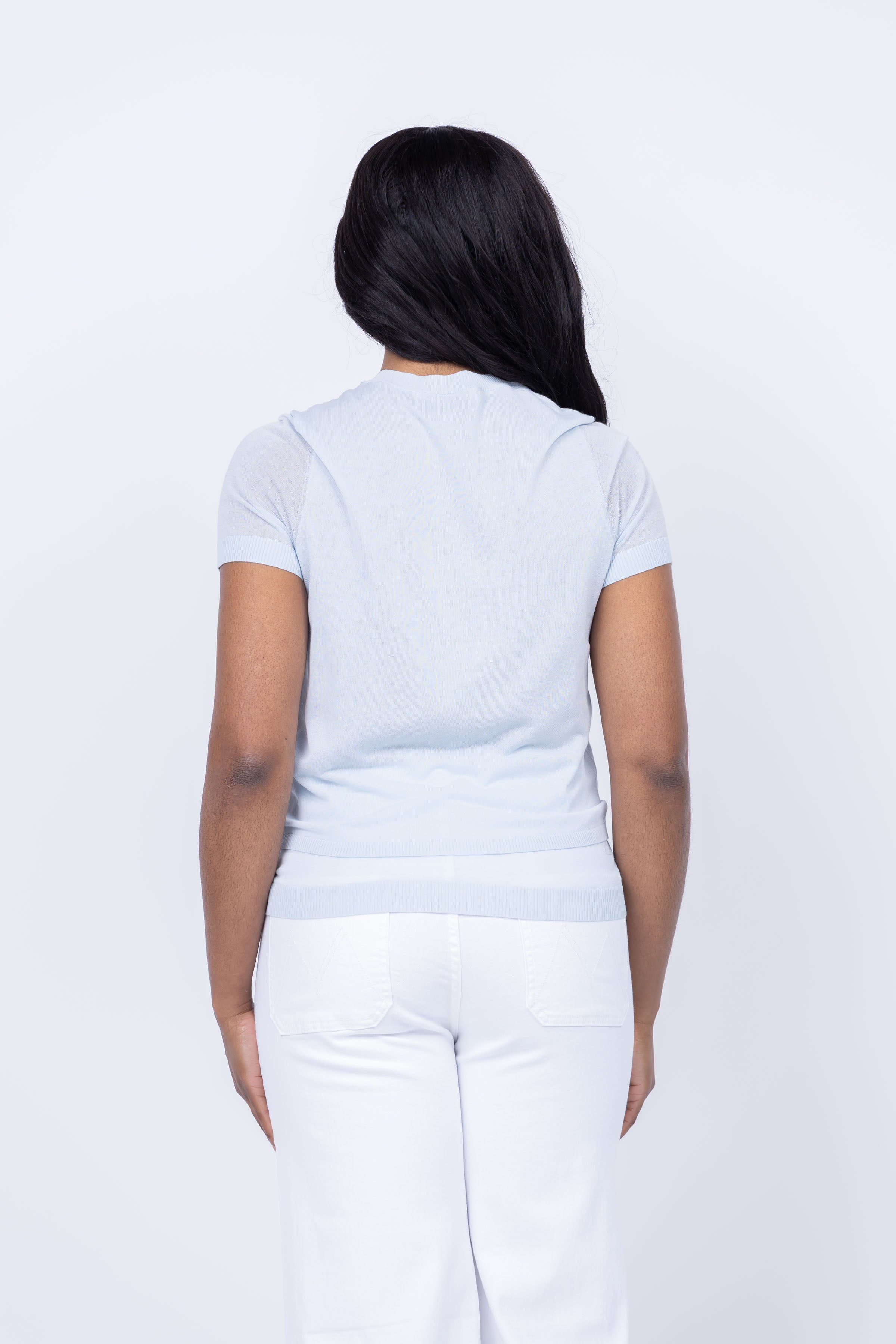 Effortlessly layer up with the DH New York Maxx Top in Pale Sky. Its short sleeves and crewneck design make it perfect for any outfit, especially with a jacket. Stay stylish and comfortable all day long!
