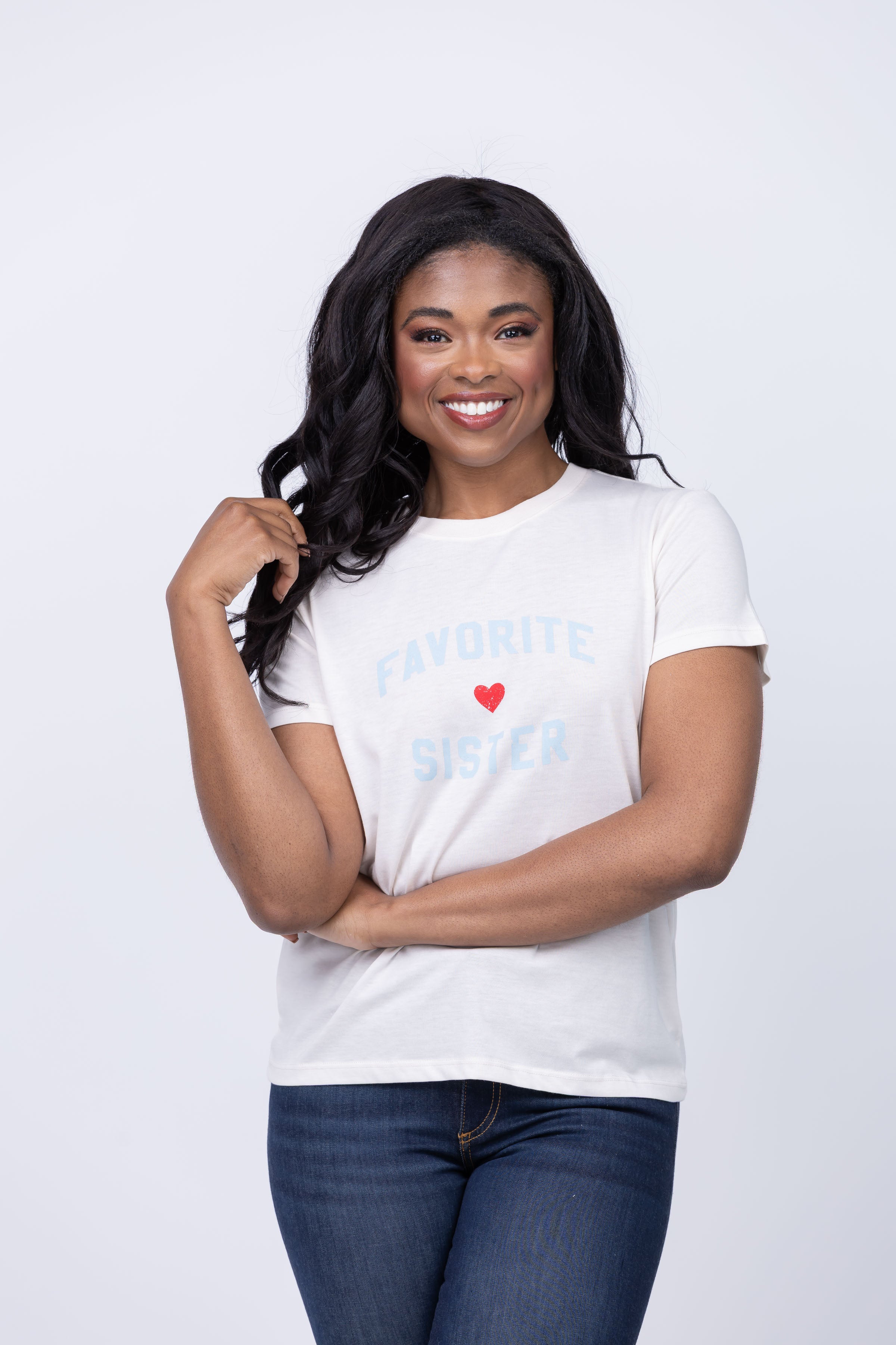 Celebrate sisterhood with our Favorite Daughter Favorite Sister Tee in Gardenia/ Baby Blue. Made with soft, breathable cotton, this tee displays a lovely gardenia print on a baby blue background. Perfect for casual outings or lounging around, this tee is a reminder of the special bond between sisters.