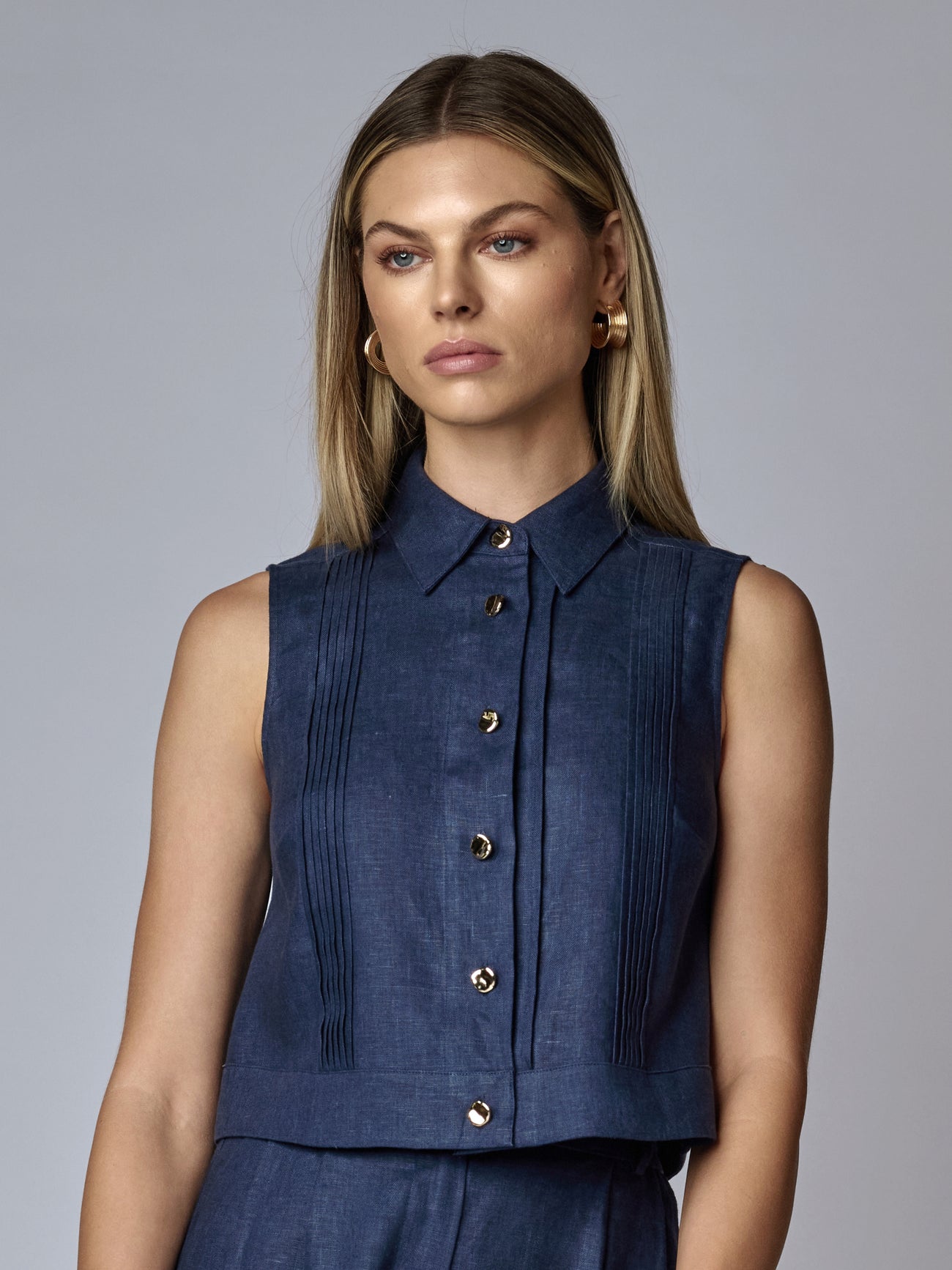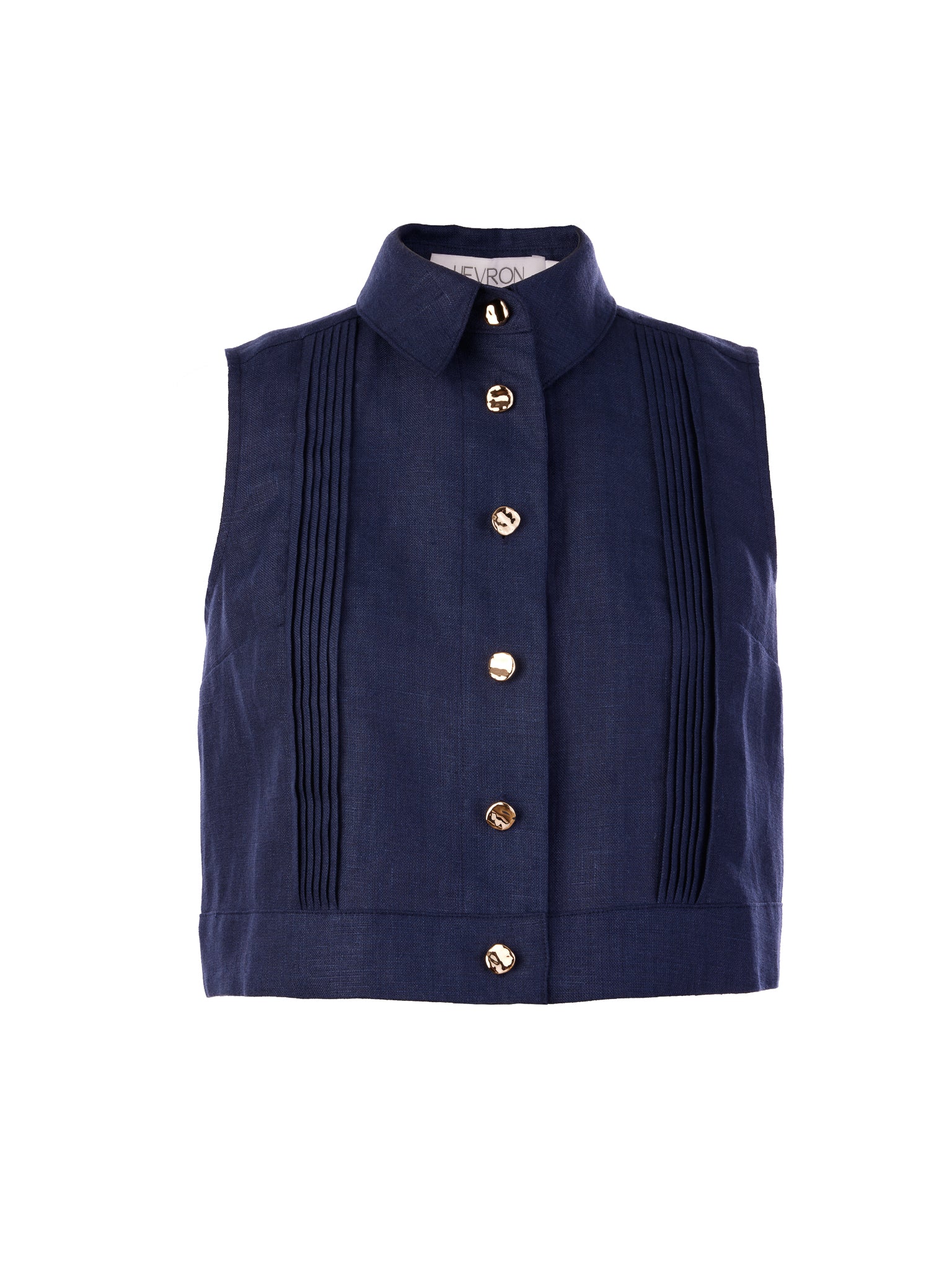 Crafted from our signature 100% linen, the Hevron Vera Top in Indigo features a straight cut silhouette with a slightly cropped hem for a modern, boxy fit that flatters without overwhelming. Delicate pintuck detailing on the bodice highlights the center front gold buttons, adding a refined touch to this versatile piece. Perfect for elevating your everyday wardrobe with effortless style and breathable comfort.
