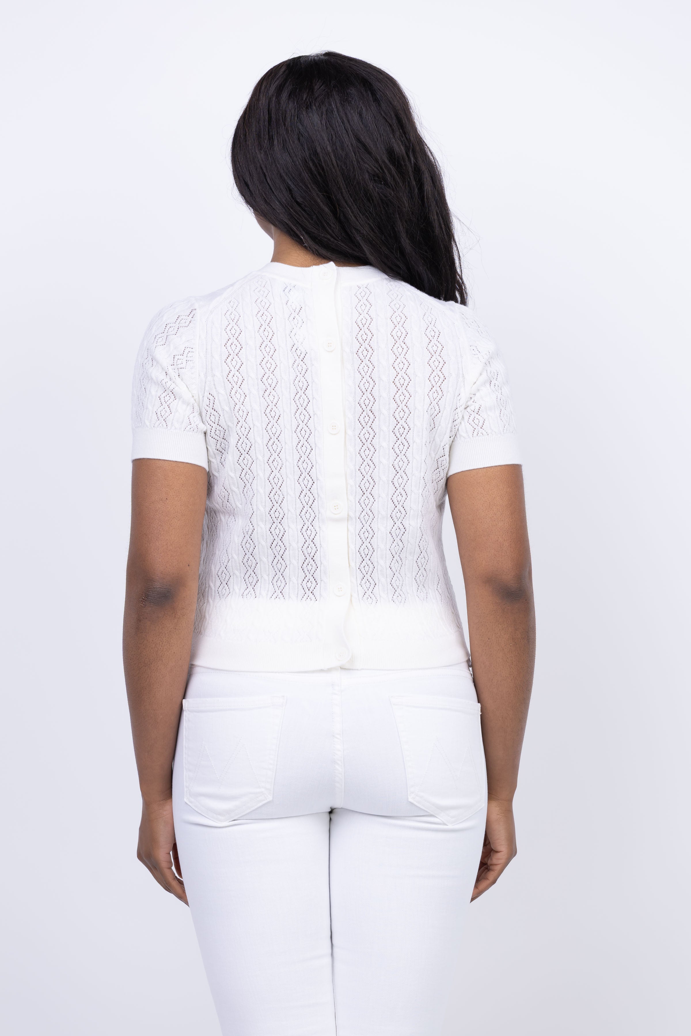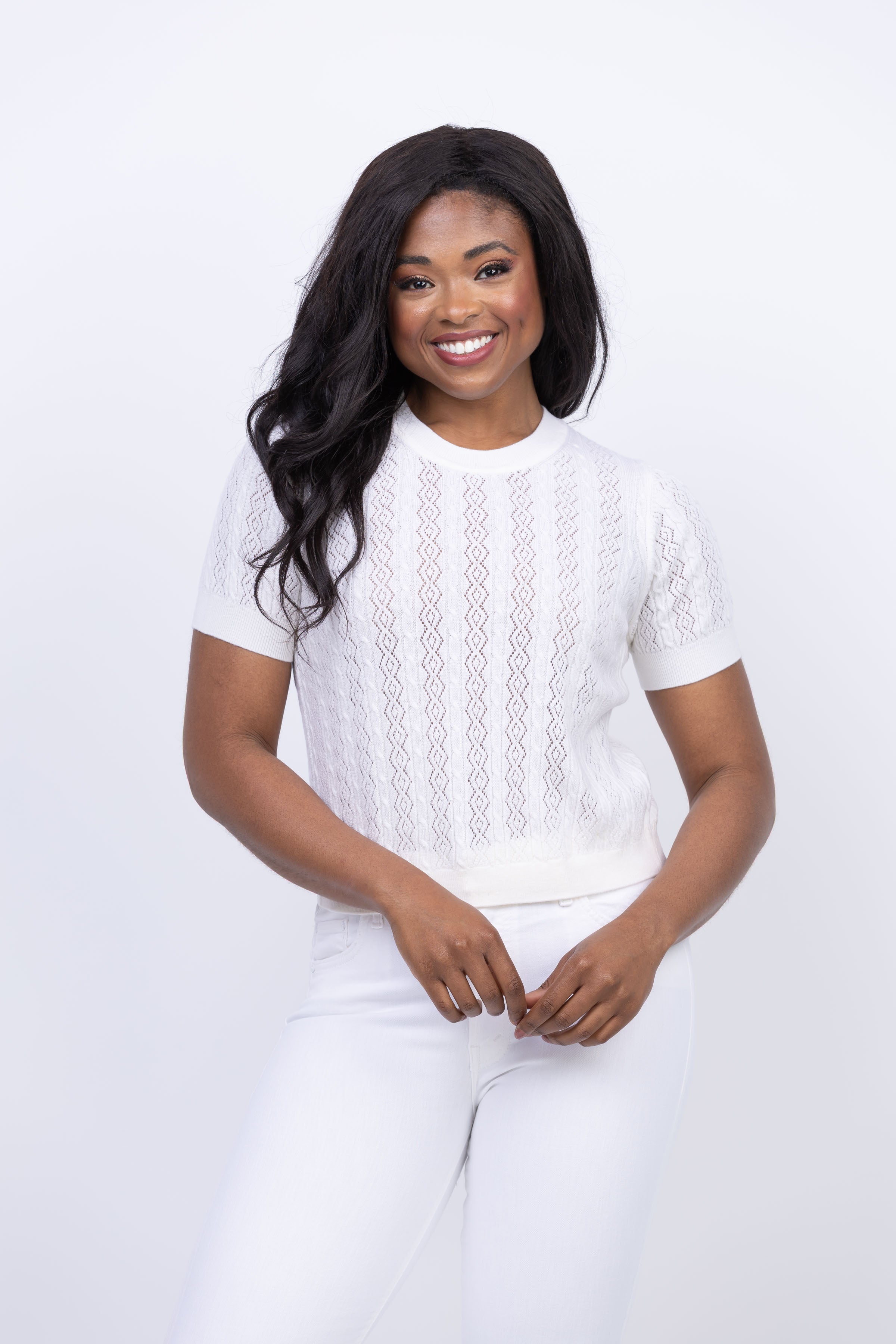 Elevate your wardrobe with the Tanya Taylor Diane Knit Top in Cream! Made from extra fine lightweight merino wool, this modern take on knitwear features a cable and diamond pointelle stitch for a luxurious feel. Versatile and effortlessly stylish, it pairs perfectly with a skirt for a day-to-night look that will turn heads.