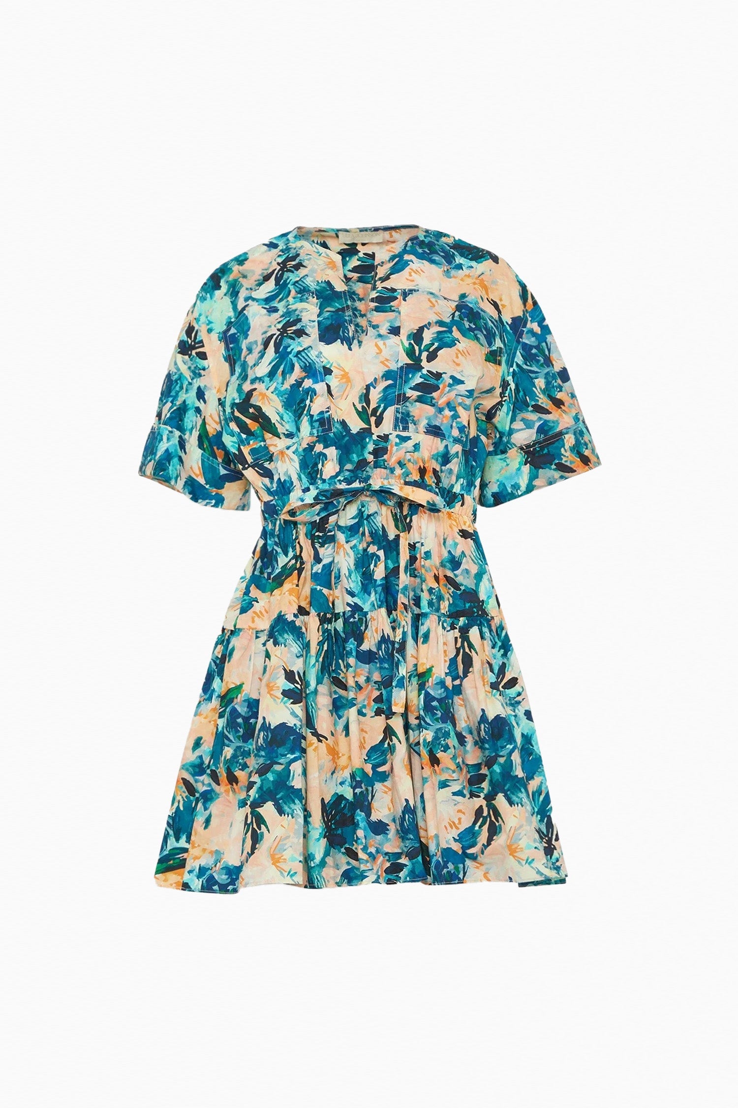 The Ulla Johnson Nadira Dress in Delphinium showcases vibrant brushstroke-inspired blooms on soft cotton poplin. Its mini silhouette offers a carefree, effortless look, enhanced by an elastic waist with an adjustable drawstring for a personalized fit. Featuring short sleeves, a flared hem, and handy side pockets, this dress blends style and practicality for your everyday wardrobe.