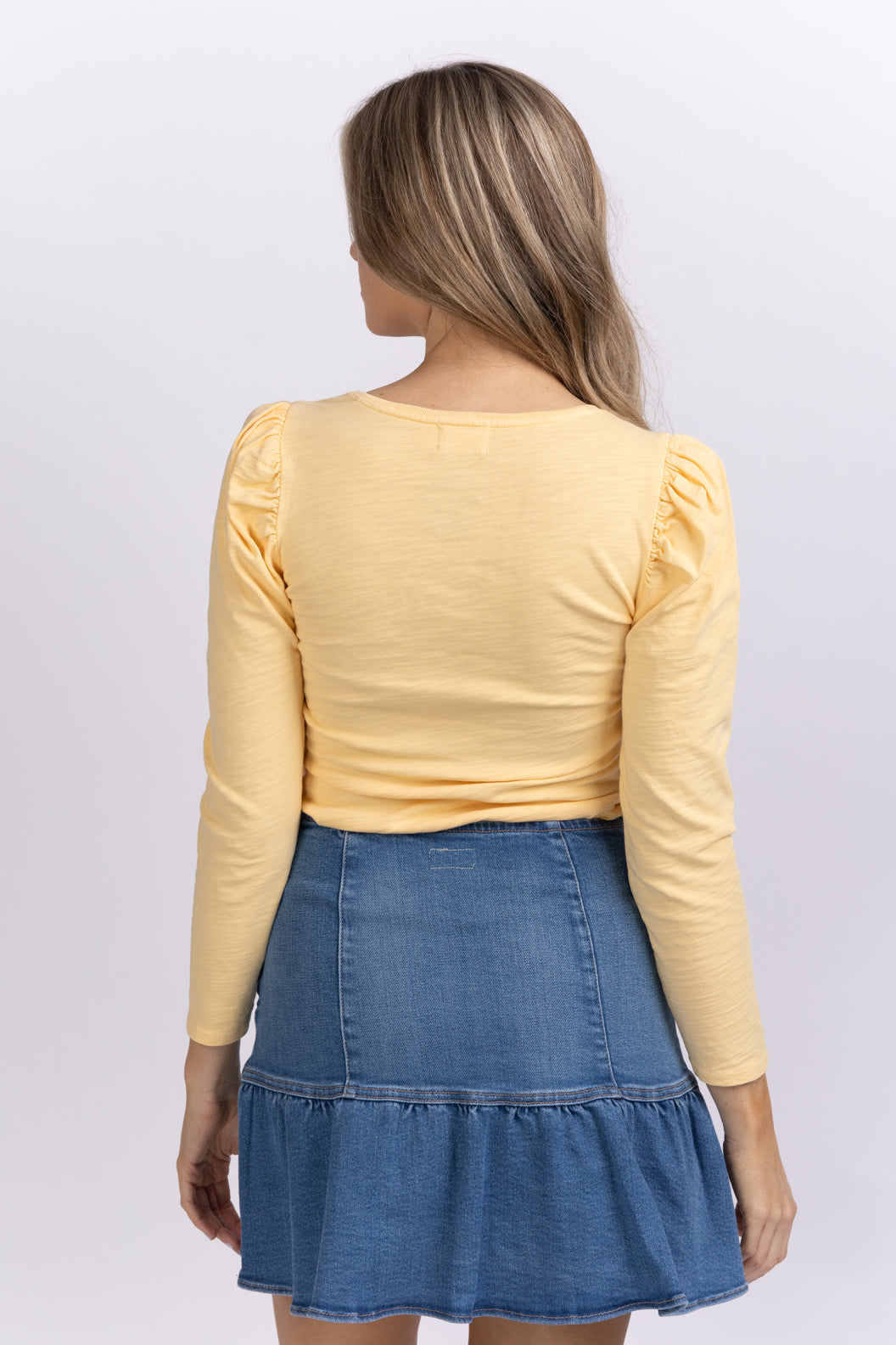 A slimming V neck, a perfectly puffed shoulder, and a bracelet length sleeve. What more could you want in an elevated tee?