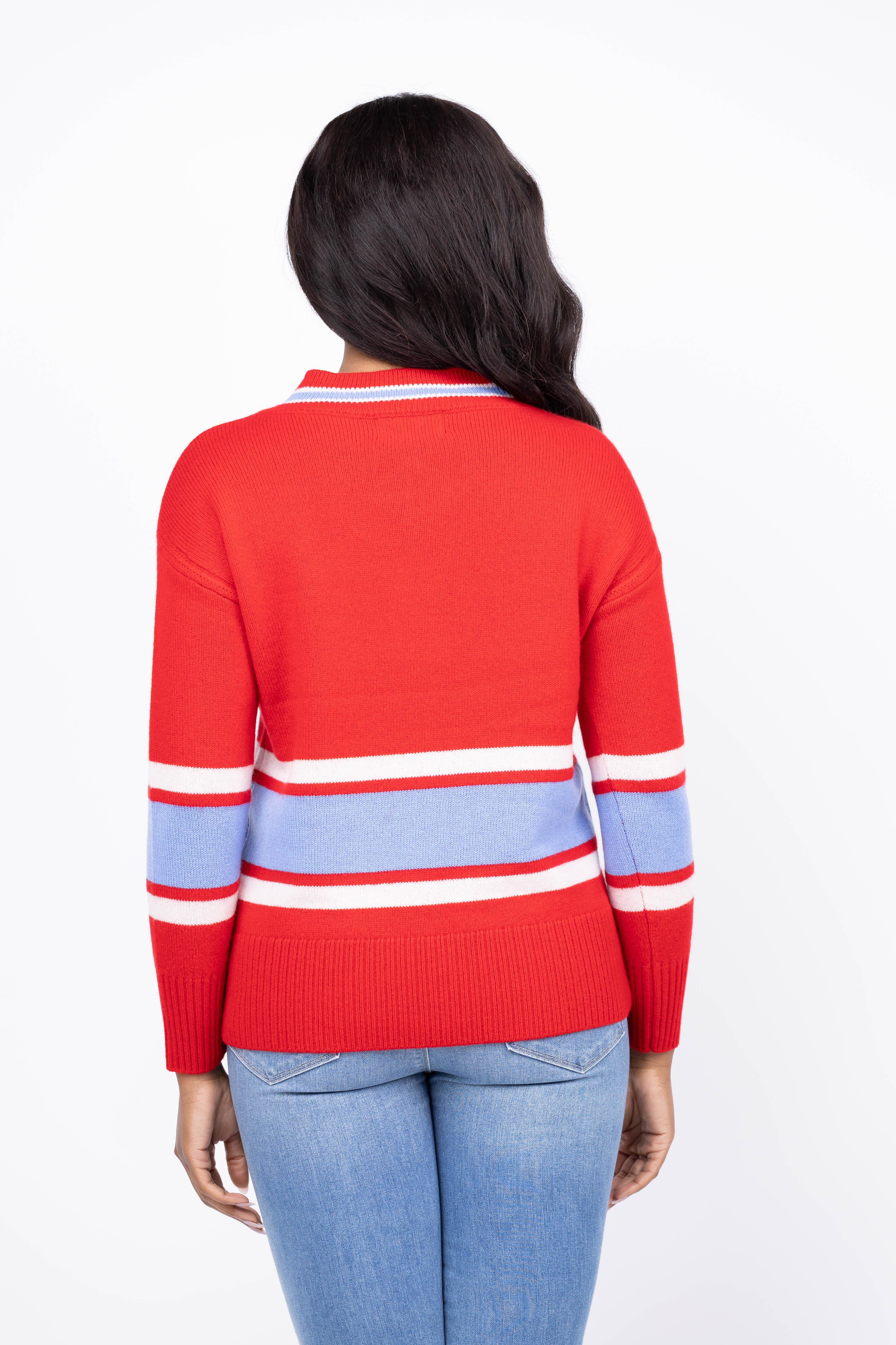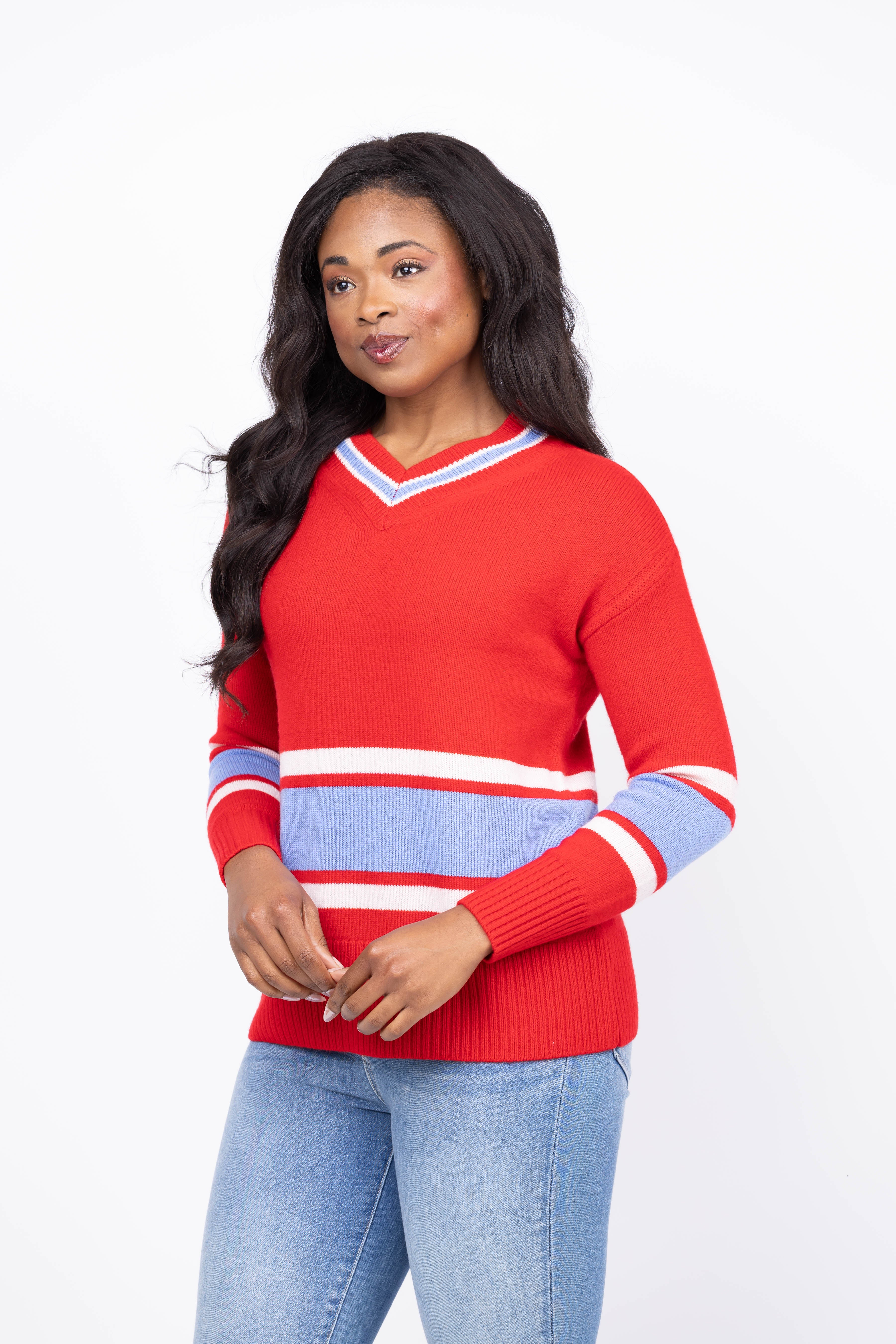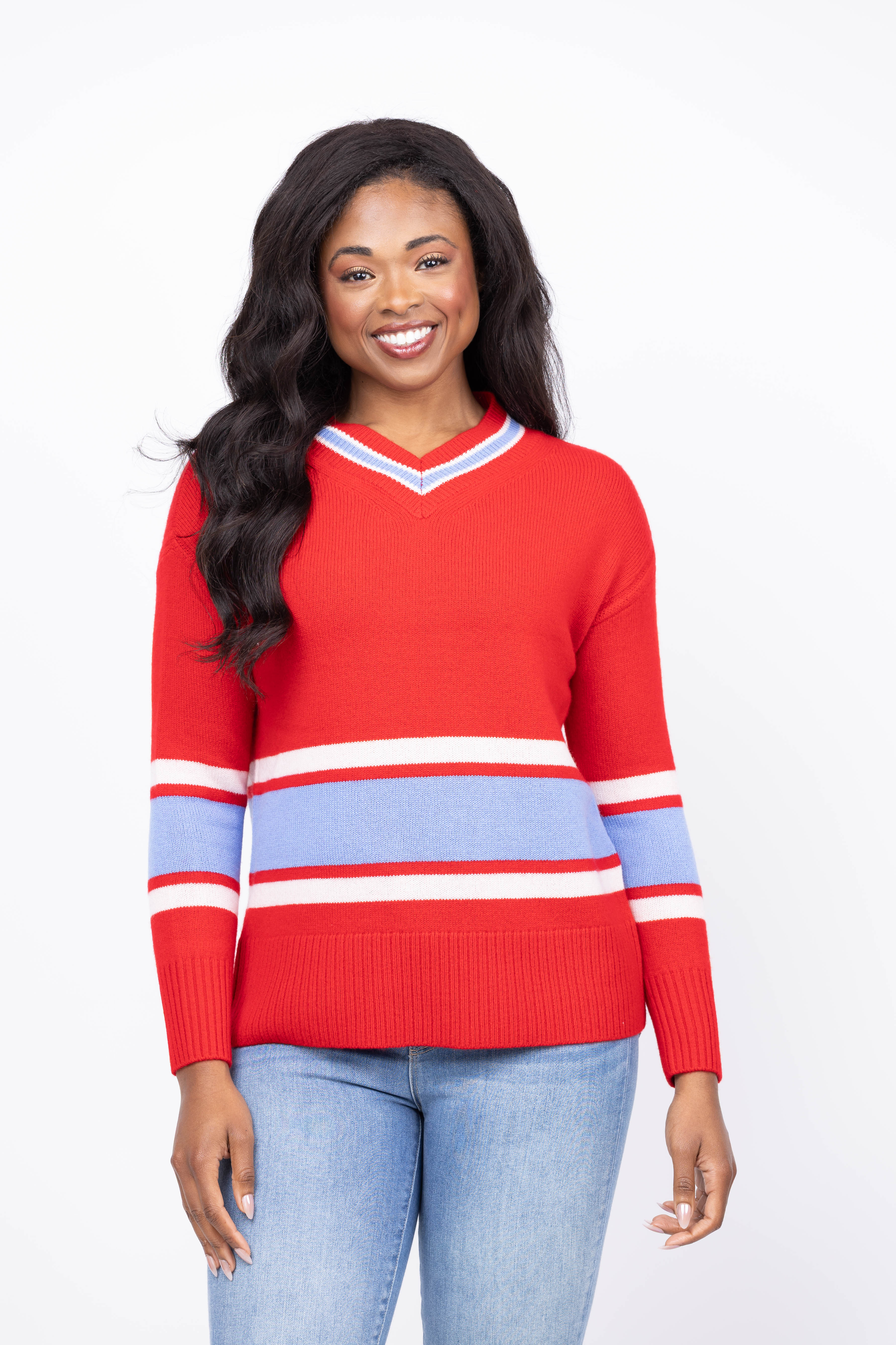 Experience timeless style and unmatched comfort with the Design History Rugby Sweater in Postbox Combo. This V-neck cashmere sweater features striking red, blue, and white stripes that add a bold touch to your wardrobe. Crafted from soft cashmere, it offers warmth without bulk, making it perfect for layering or wearing on its own. Elevate your everyday look with a piece that blends classic design and luxurious feel effortlessly.