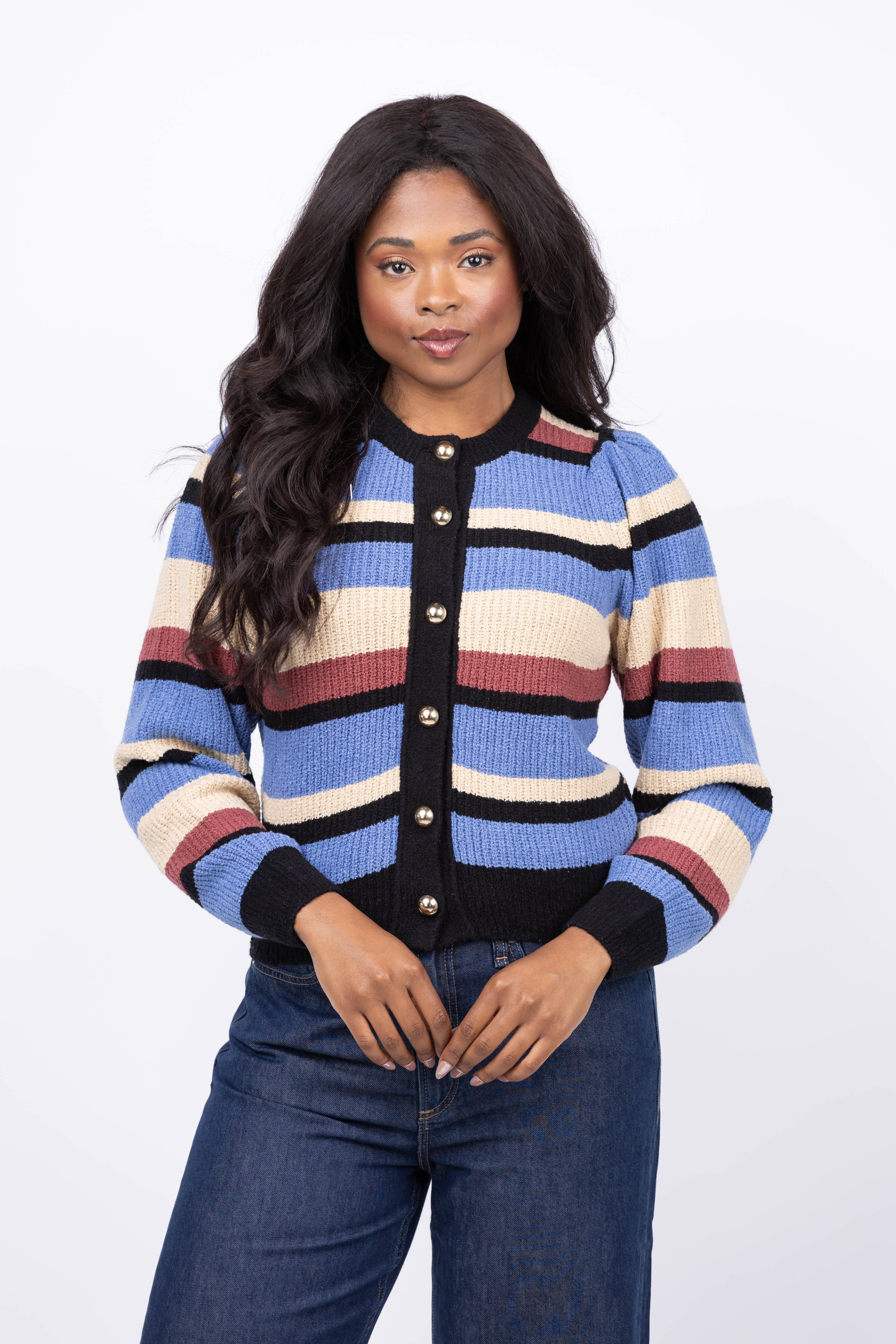 Experience timeless style with the NATION LTD Carmela Cardigan in Velour Multi Stripe. This button-up cardigan features elegant, colorful stripes that add a vibrant touch to any outfit. Crafted in soft velour, it offers cozy comfort while maintaining a polished look. Perfect for layering, it effortlessly transitions from casual days to chic evenings, making it a versatile staple in your wardrobe.